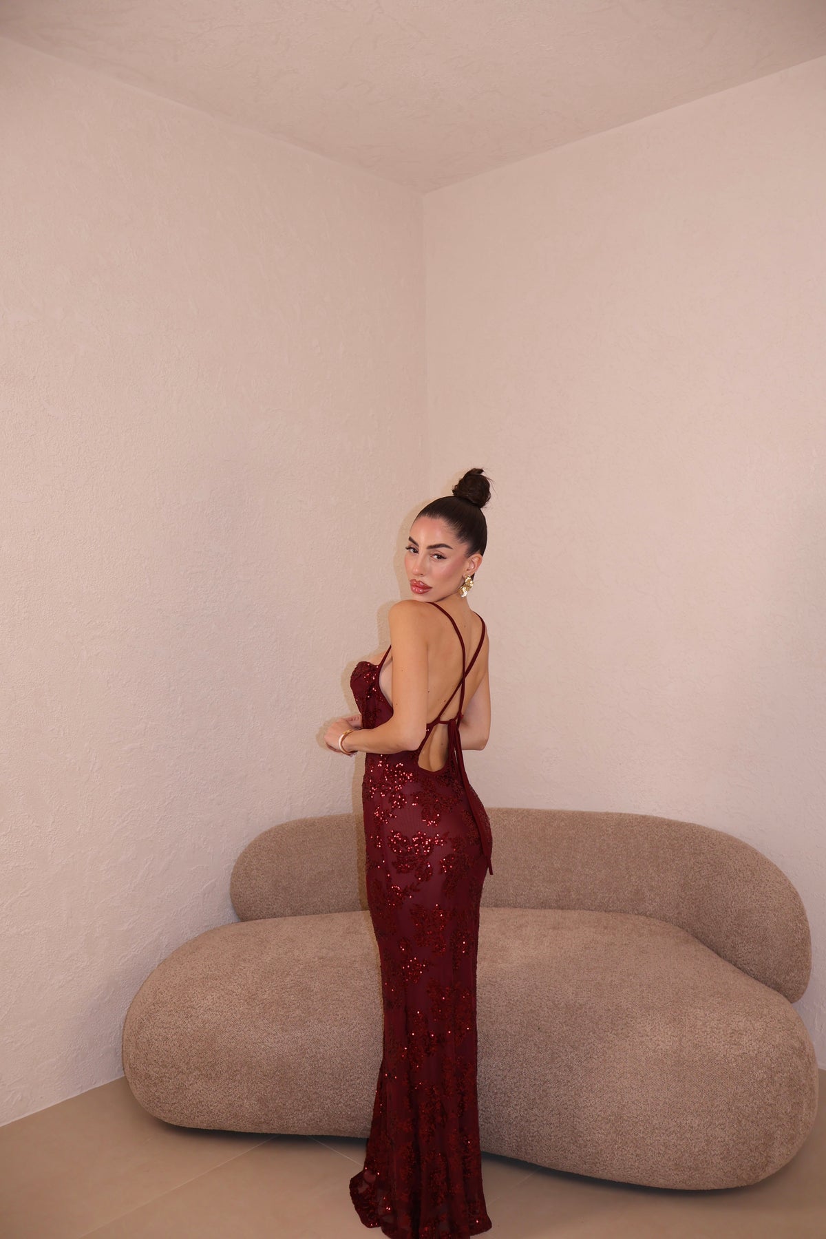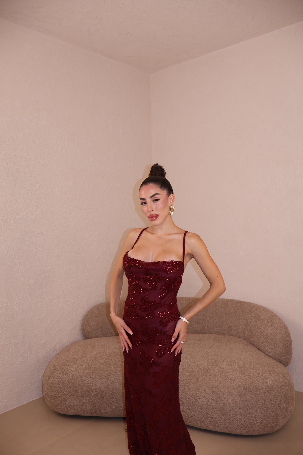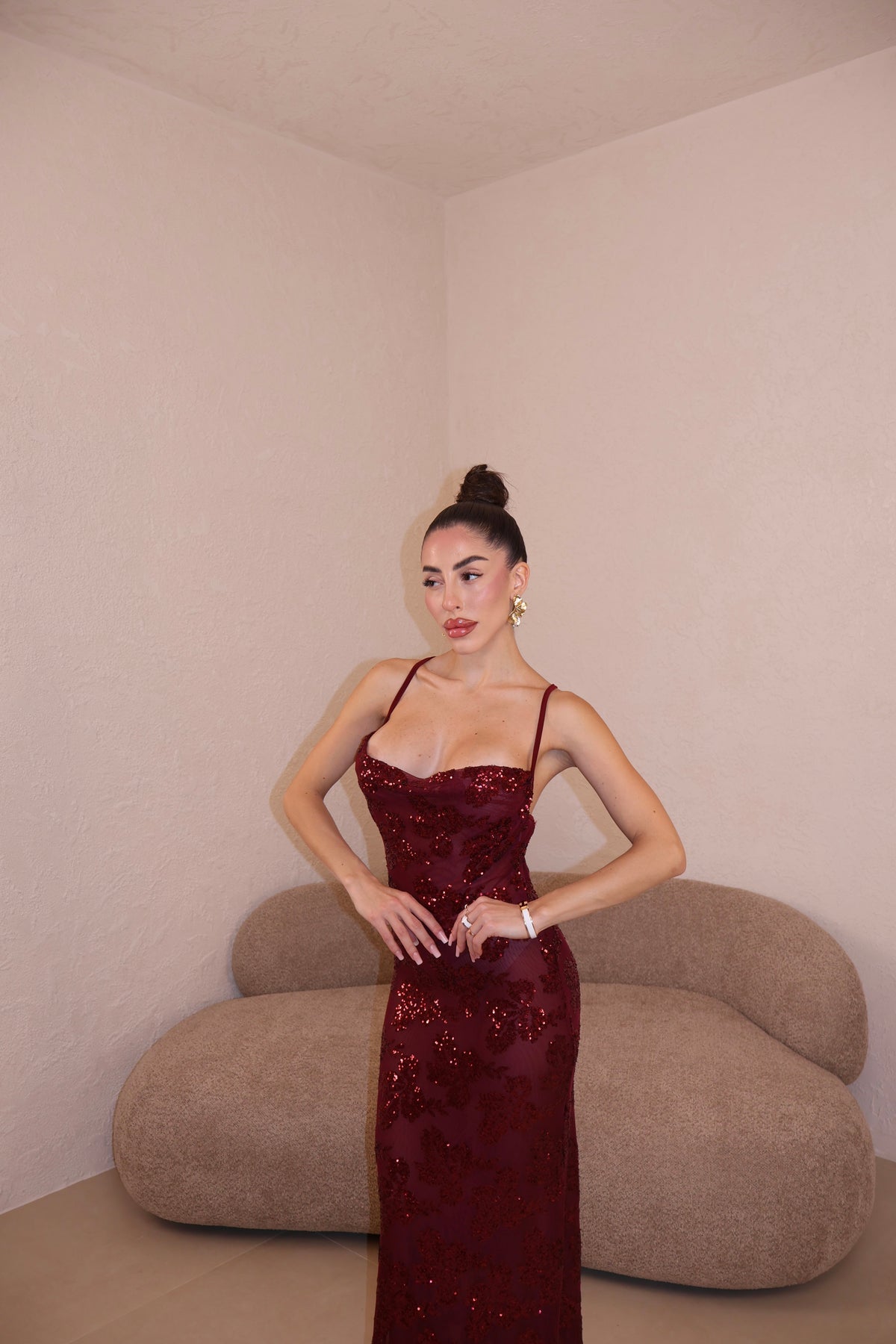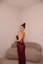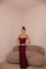 Abito lungo semitrasparente con ricami in paillettes. Bretelle regolabili sul retro con incrocio. Taglia unica.