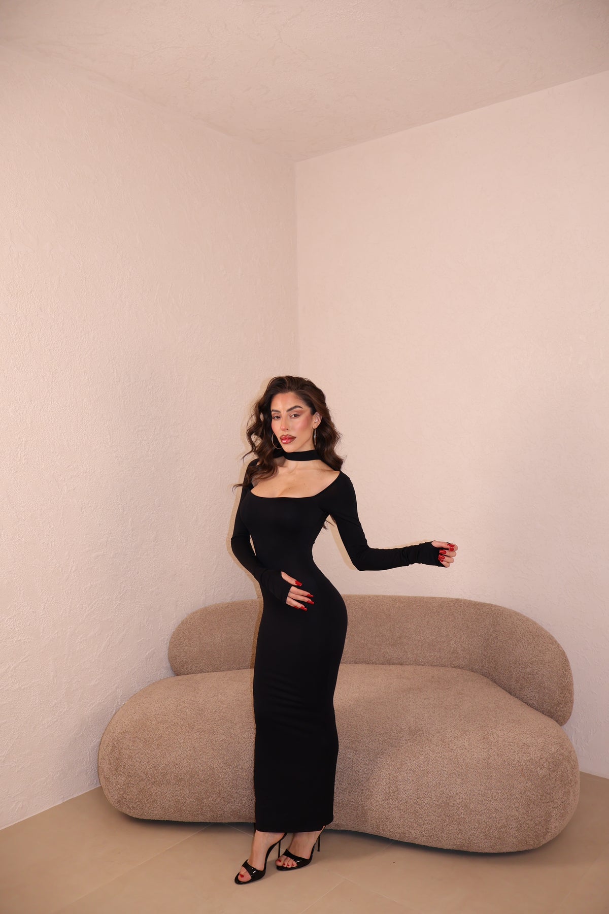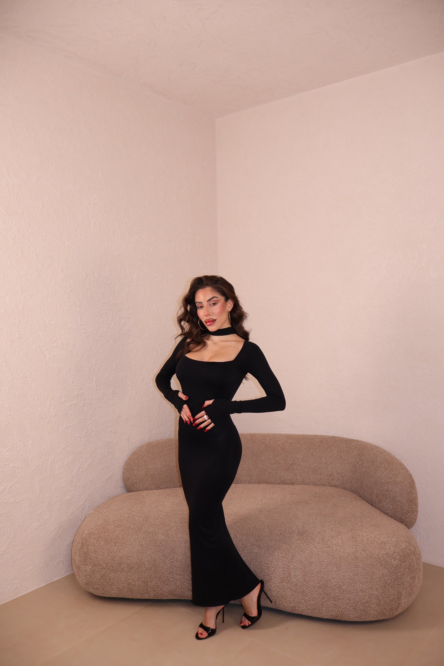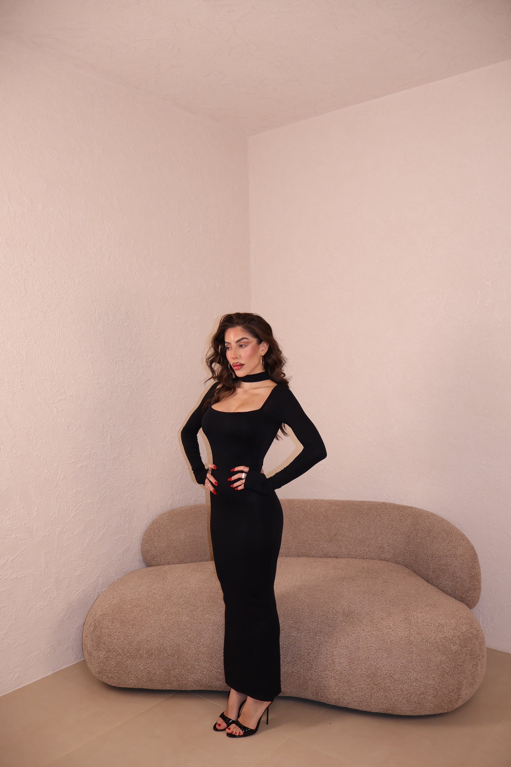Abito lungo in licra con collarino e coppe imbottite. Taglia unica.