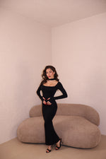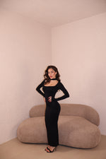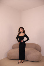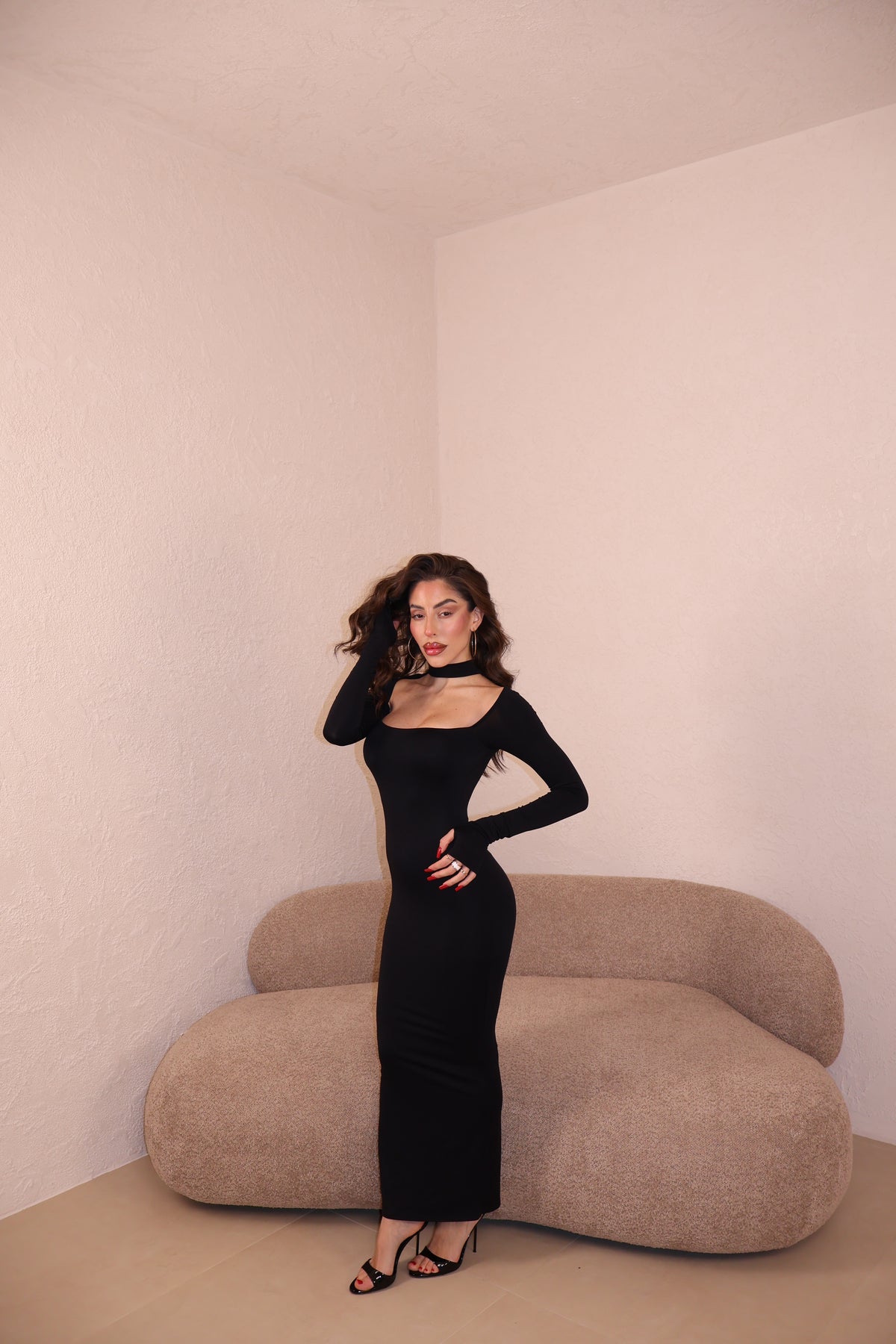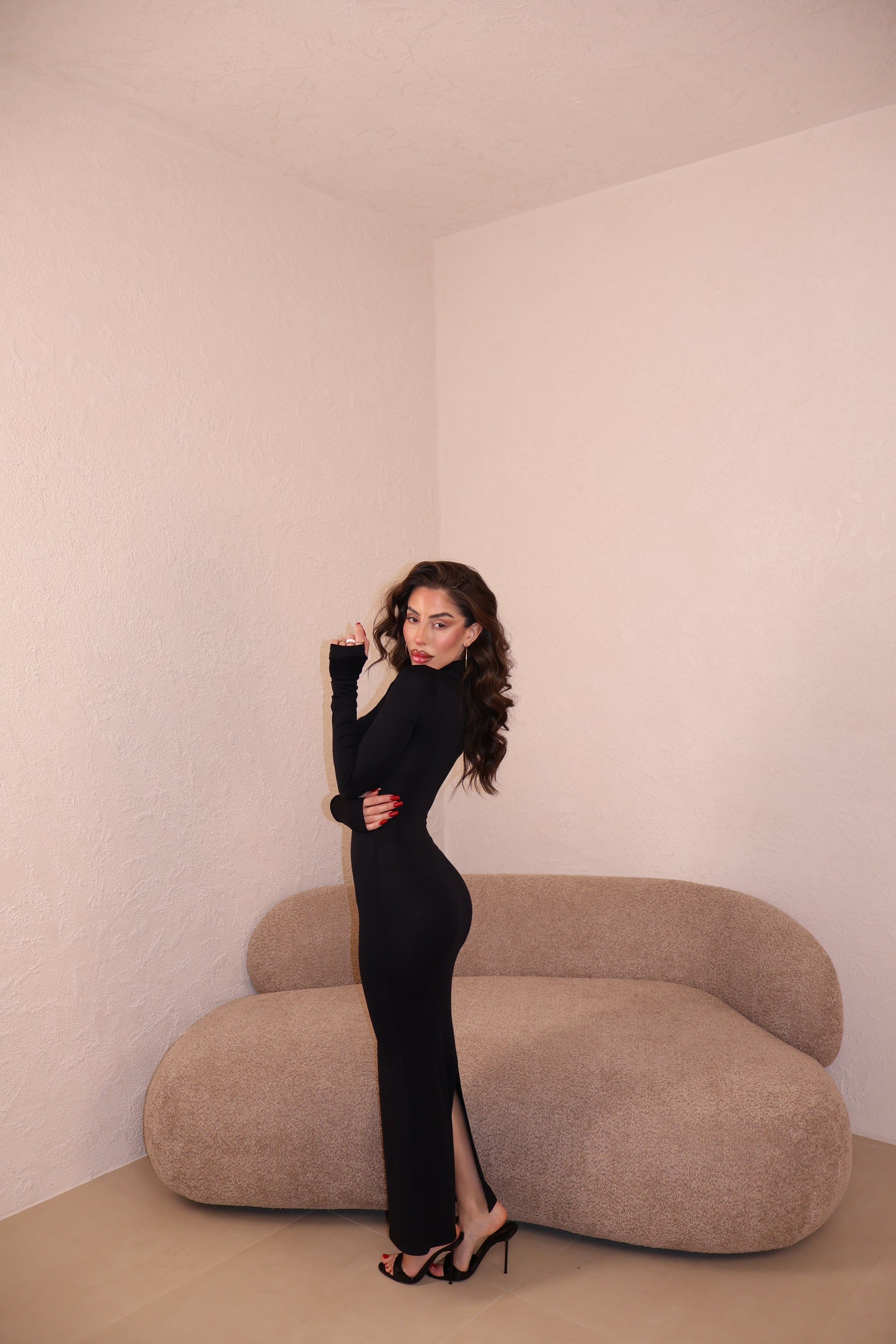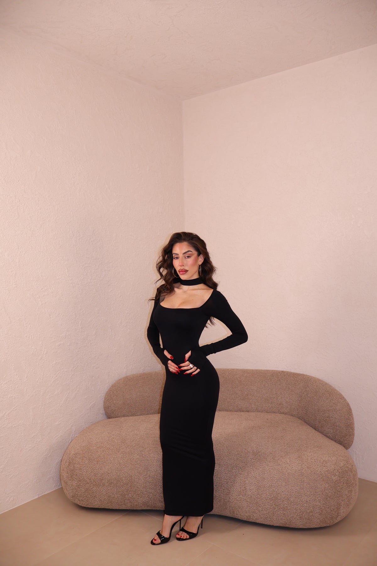 Abito lungo in licra con collarino e coppe imbottite. Taglia unica.