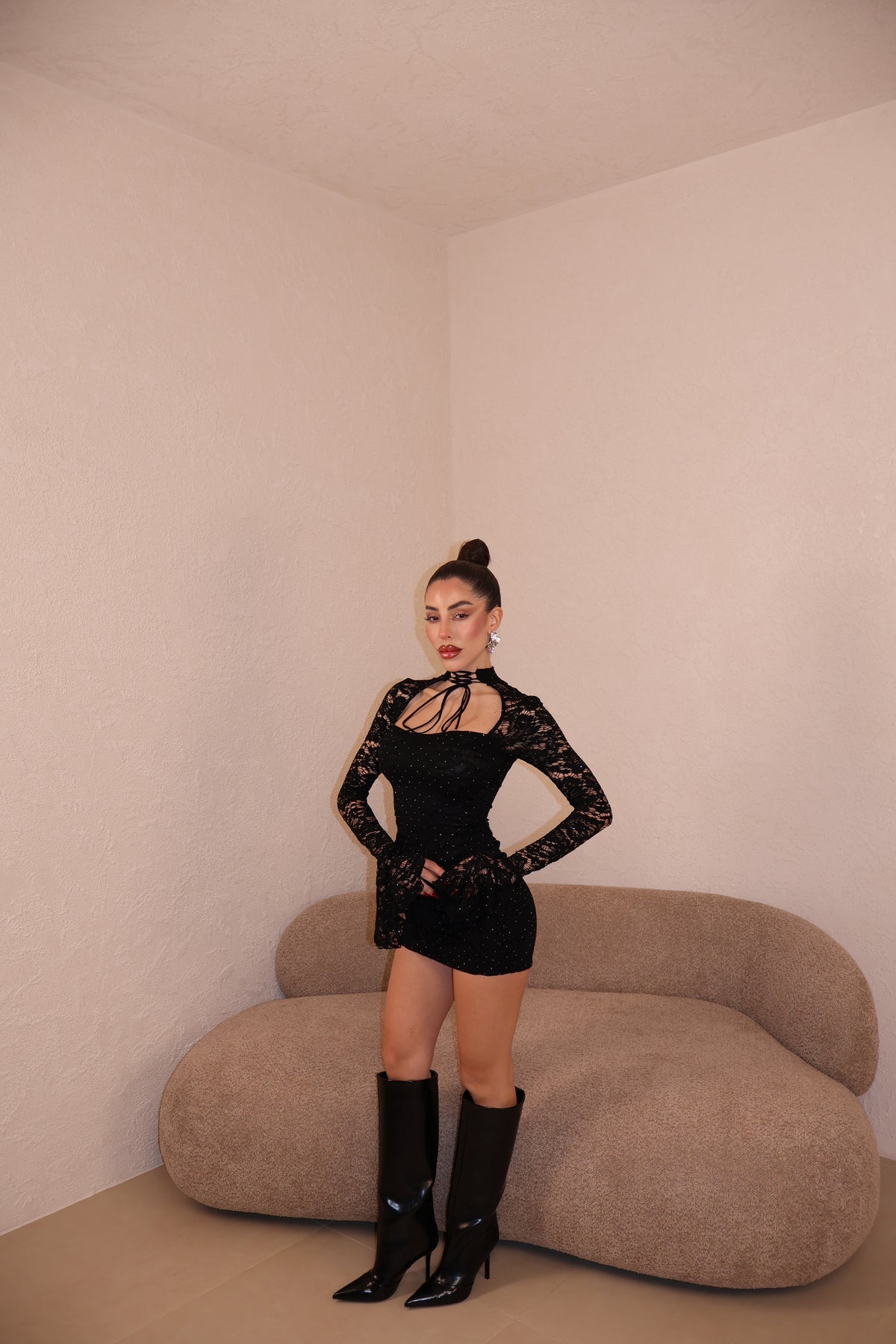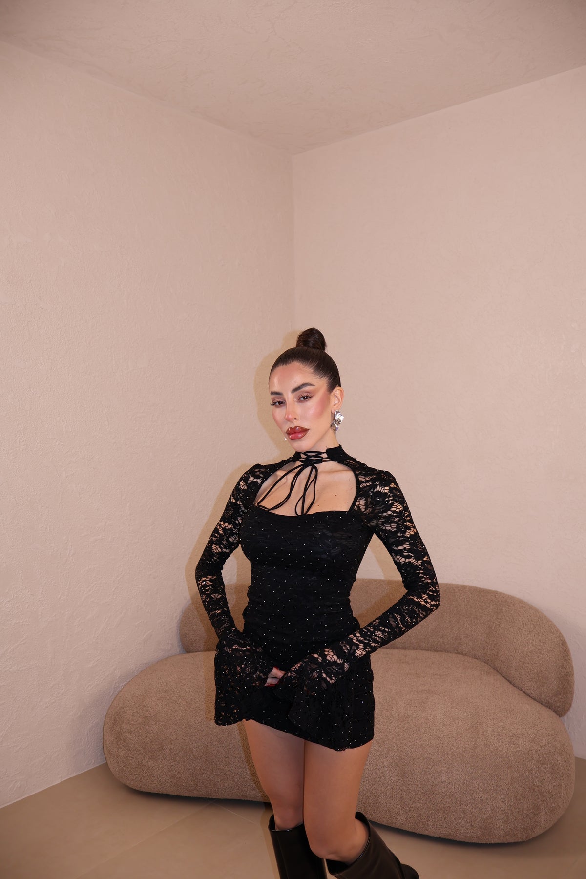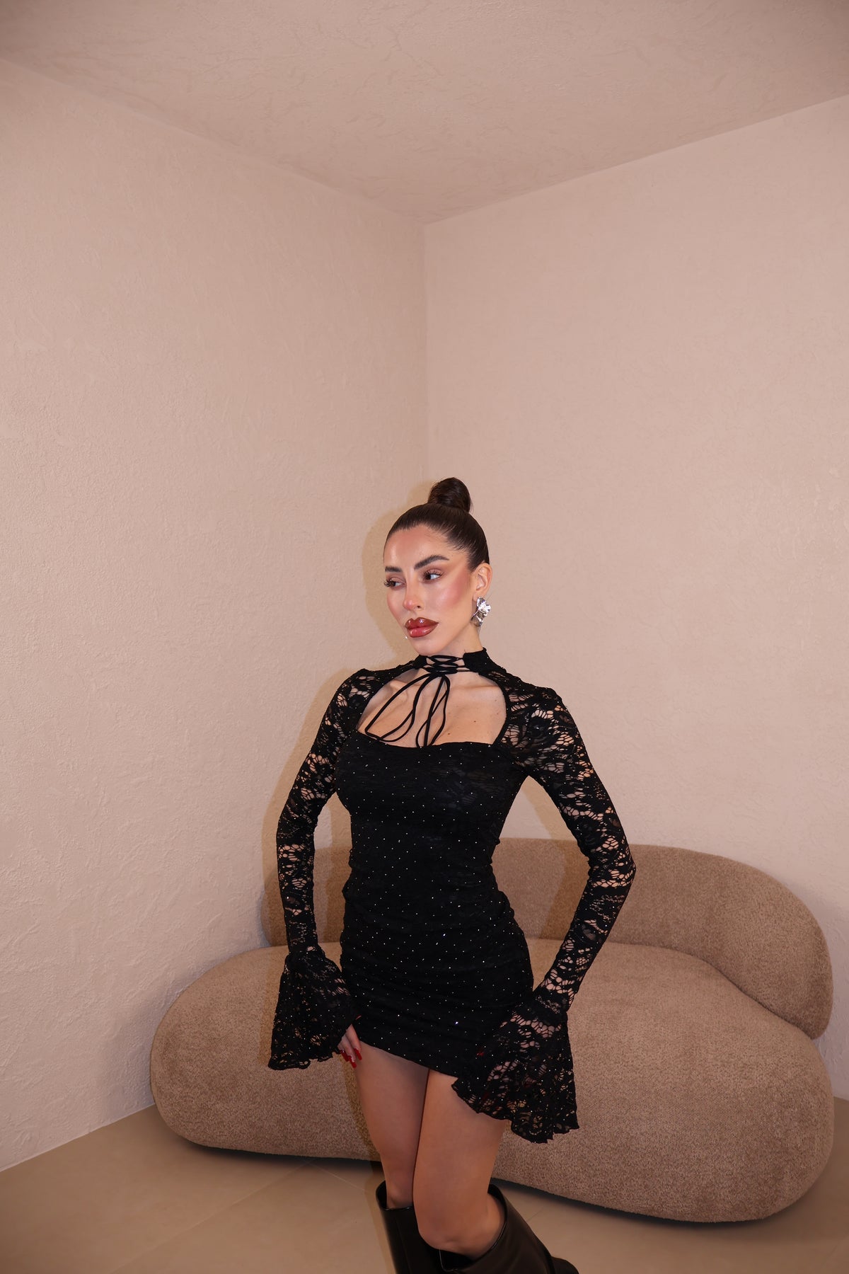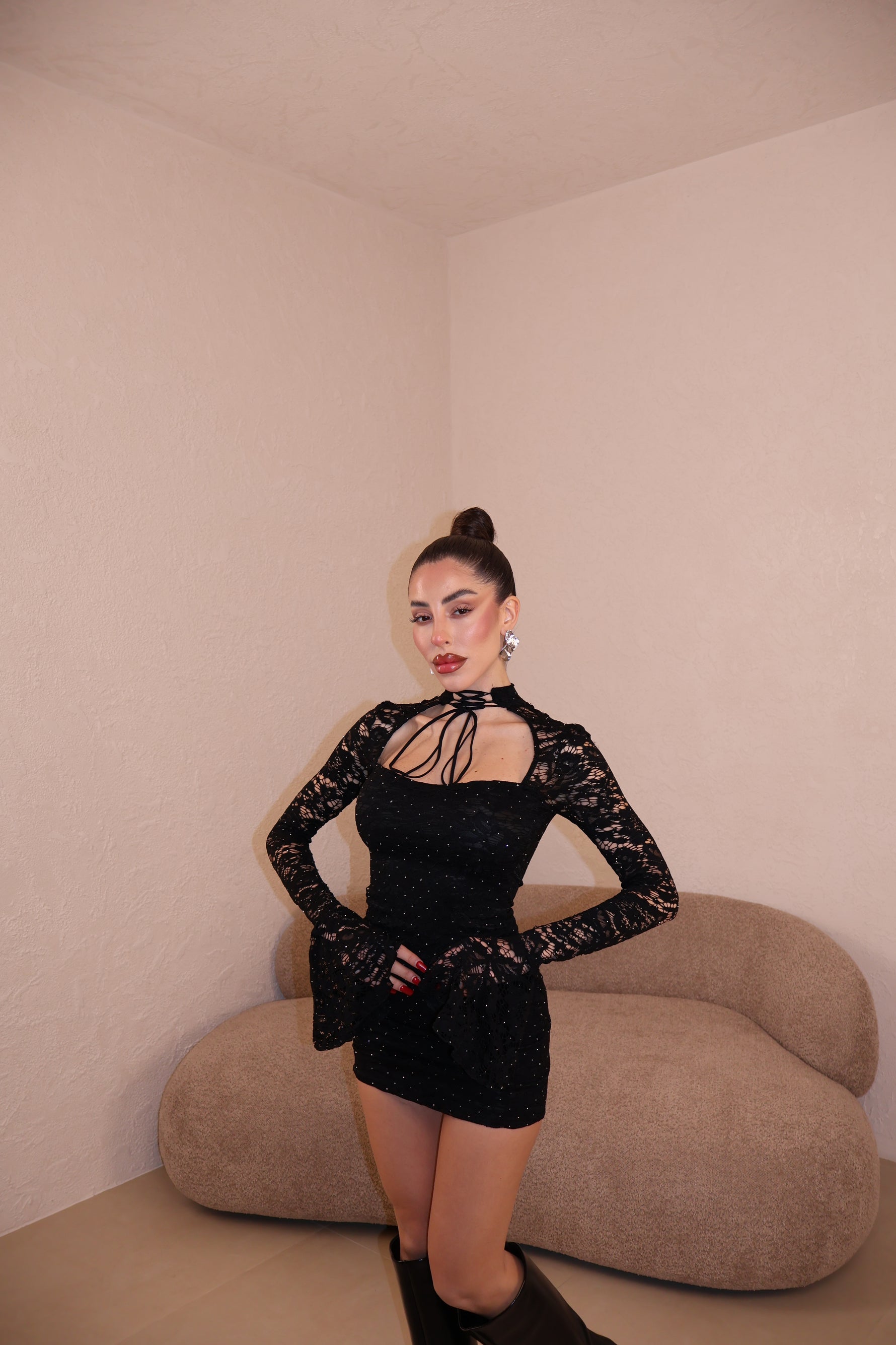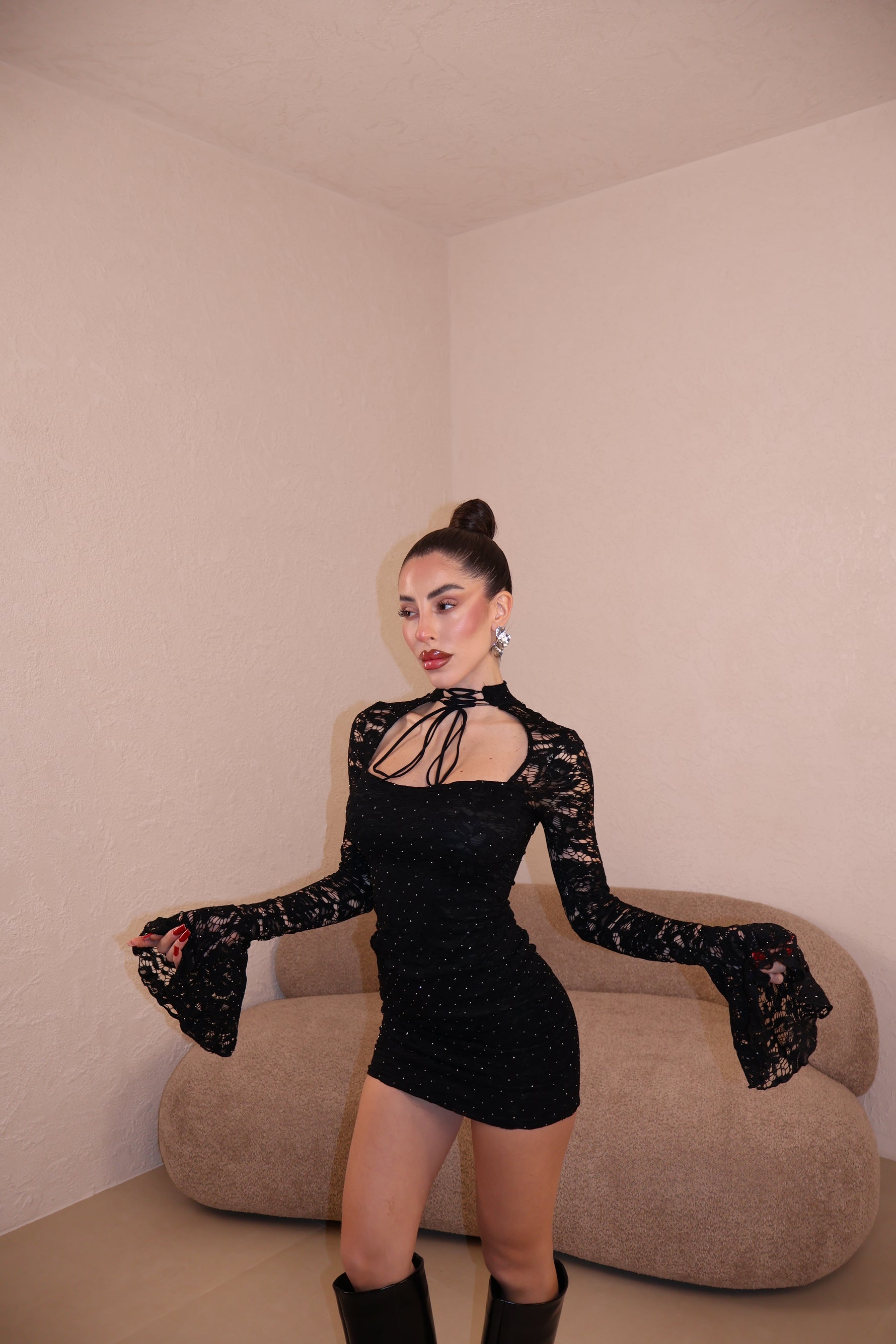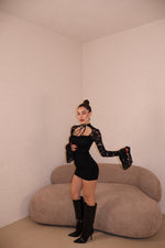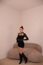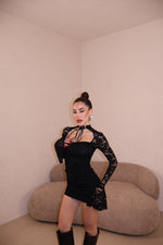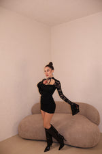 Abito in pizzo con strass e dettaglio collarino regolabile.Taglia unica.