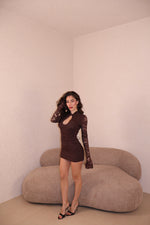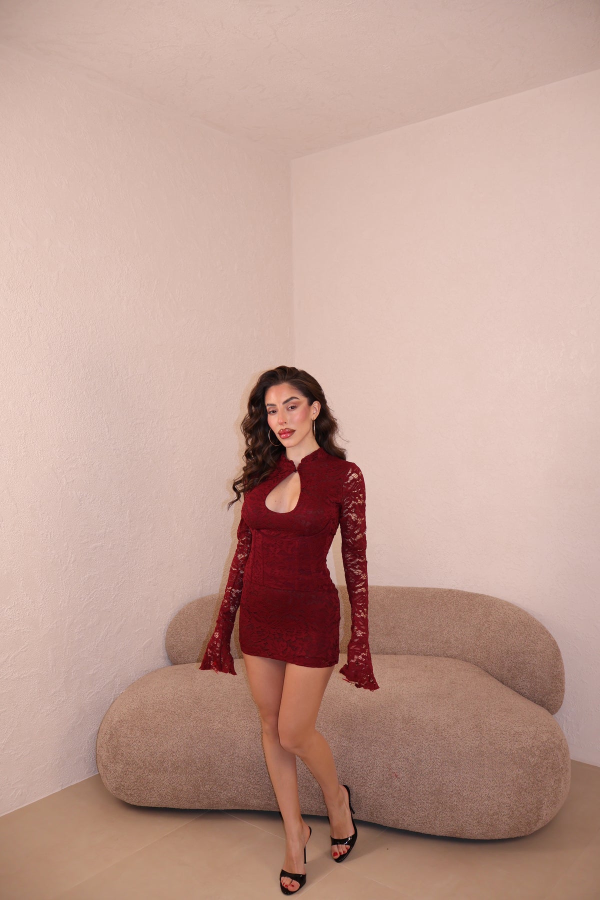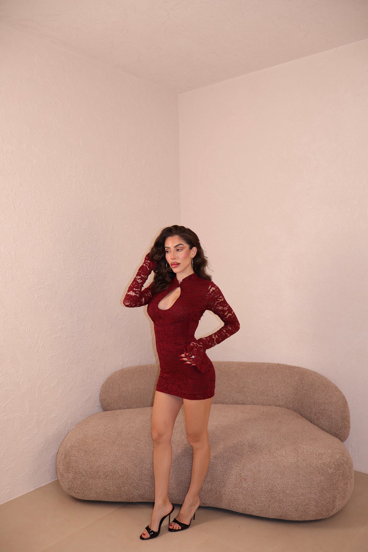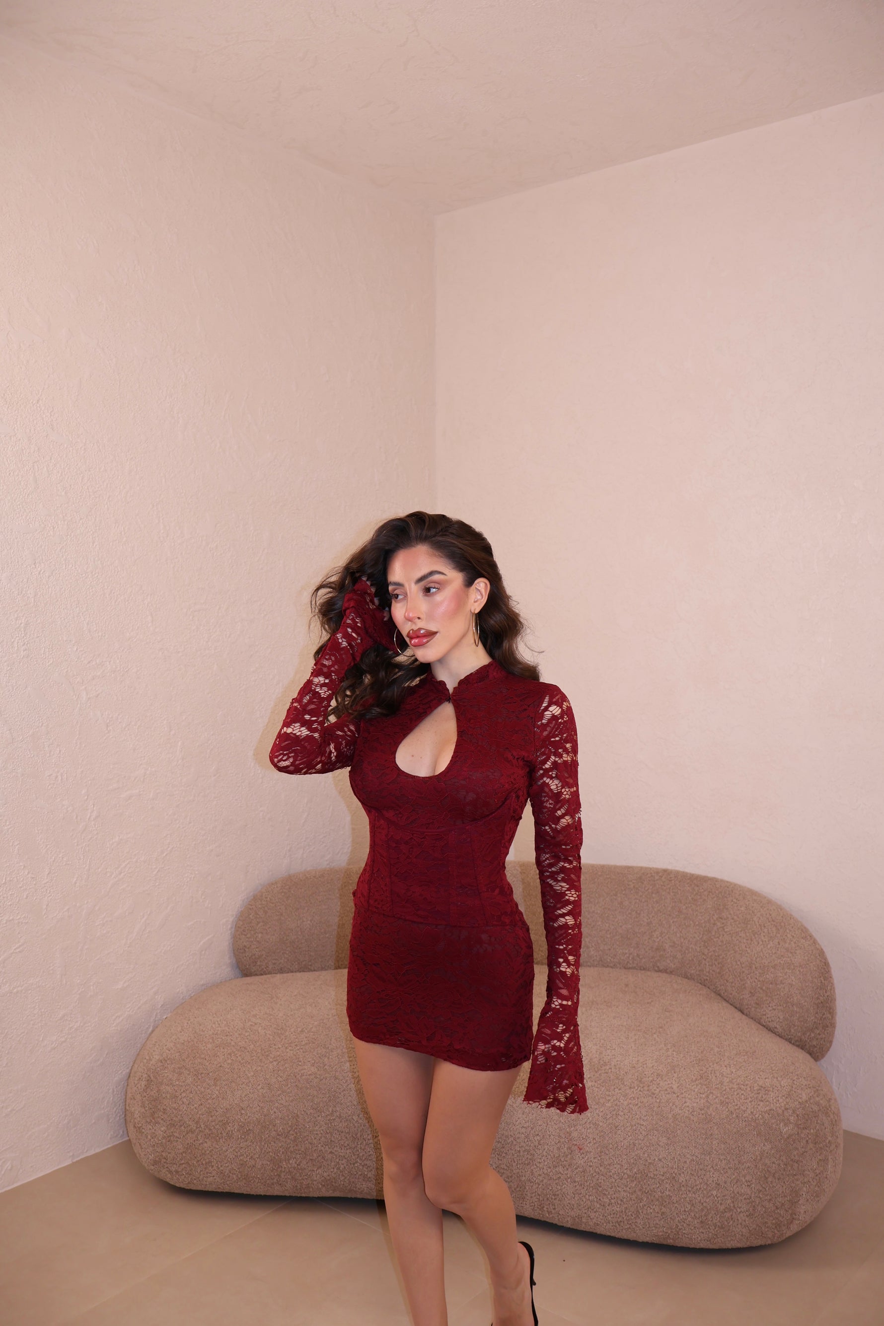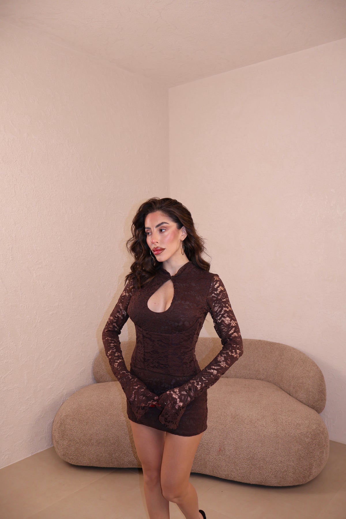 Abito corto in pizzo con apertura frontale. Corsetto in pizzo regolabile sul retro. Taglia unica.