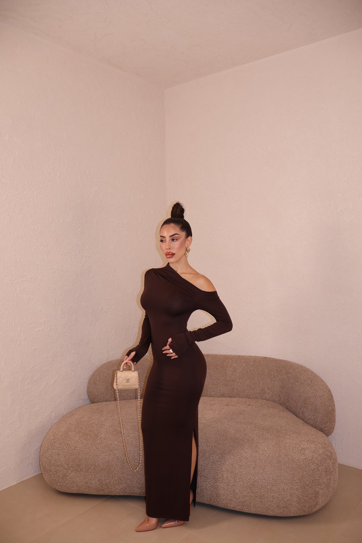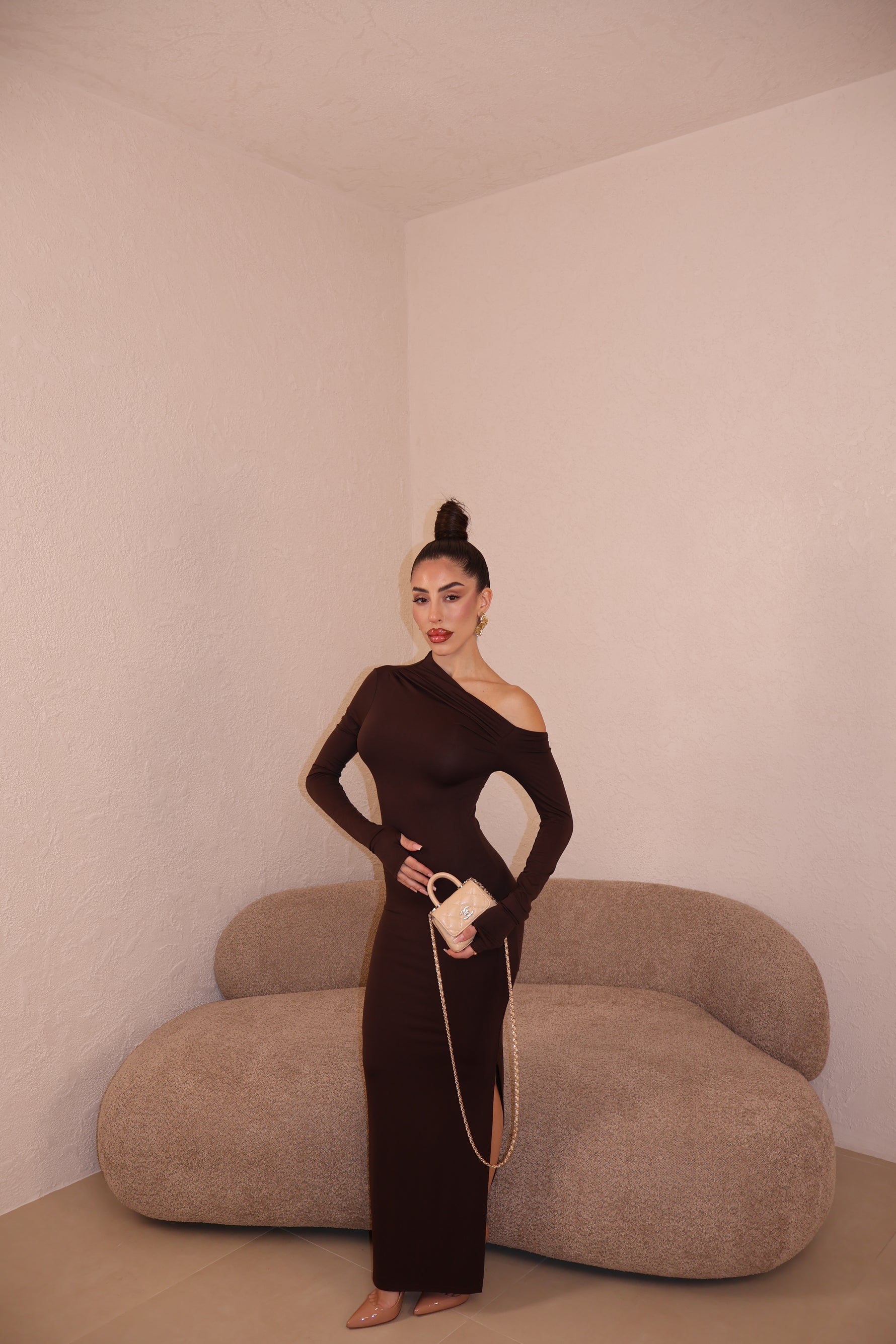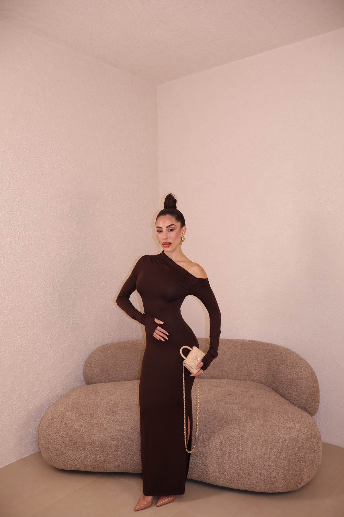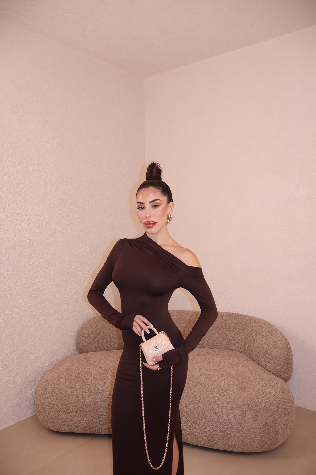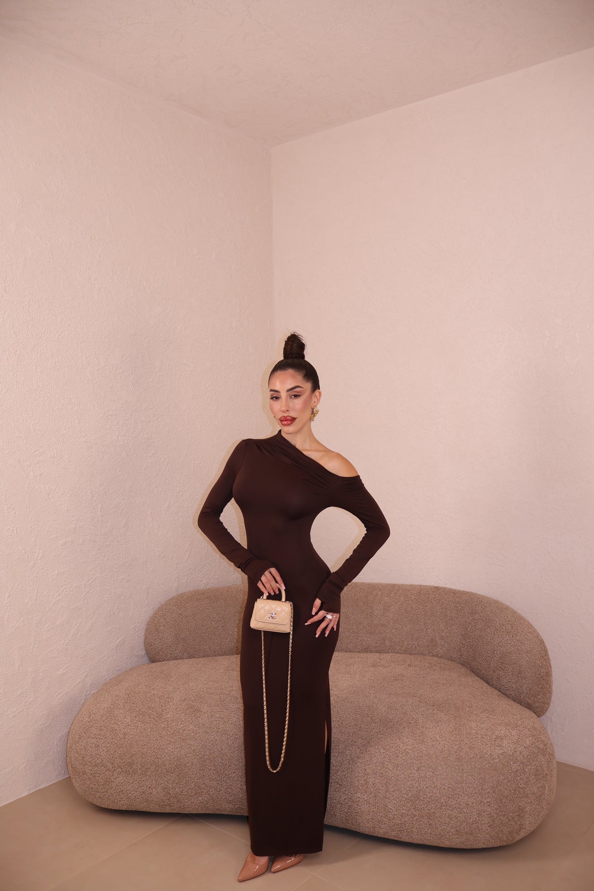 Abito in licra monospalla con maniche a guanto. Taglia unica.