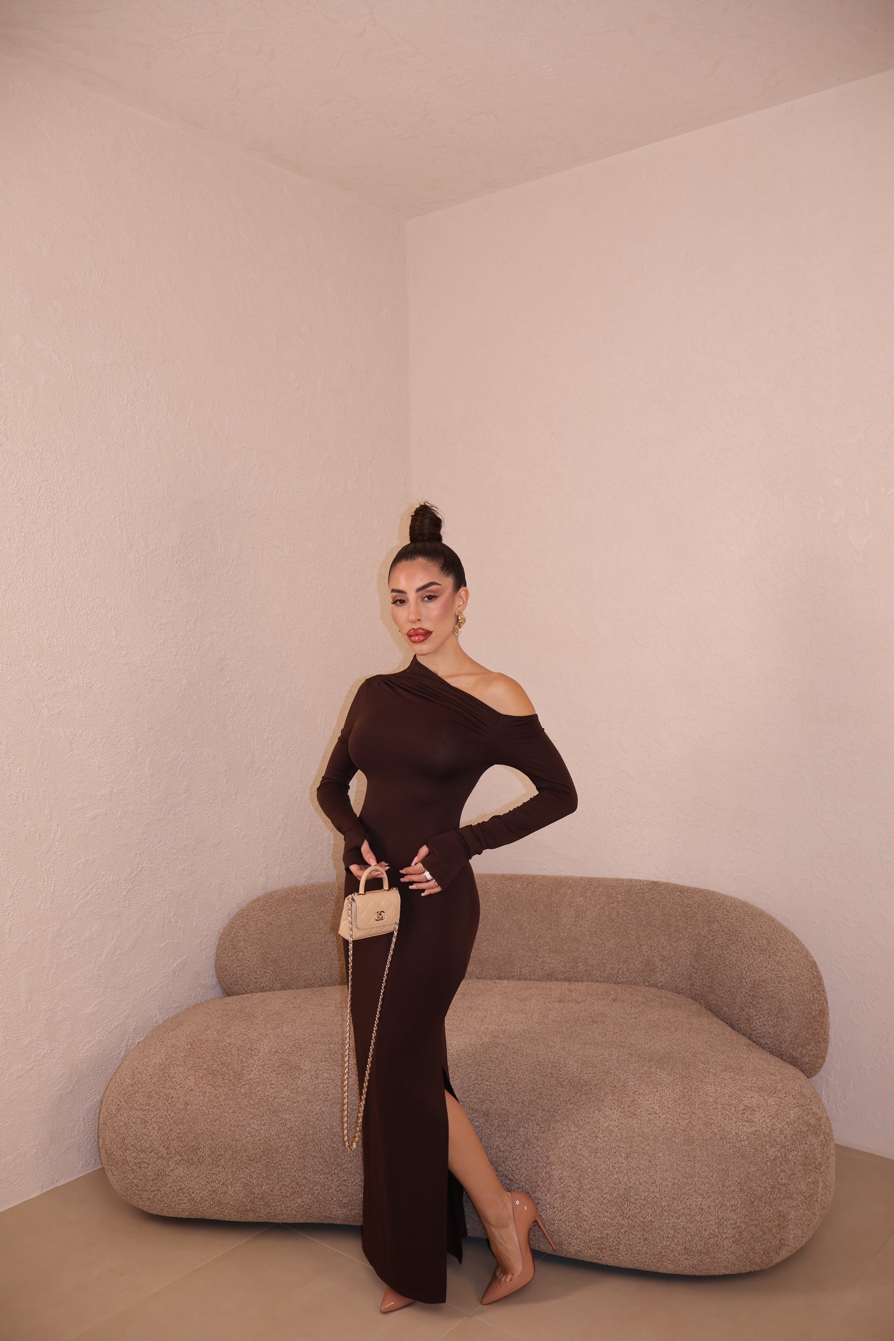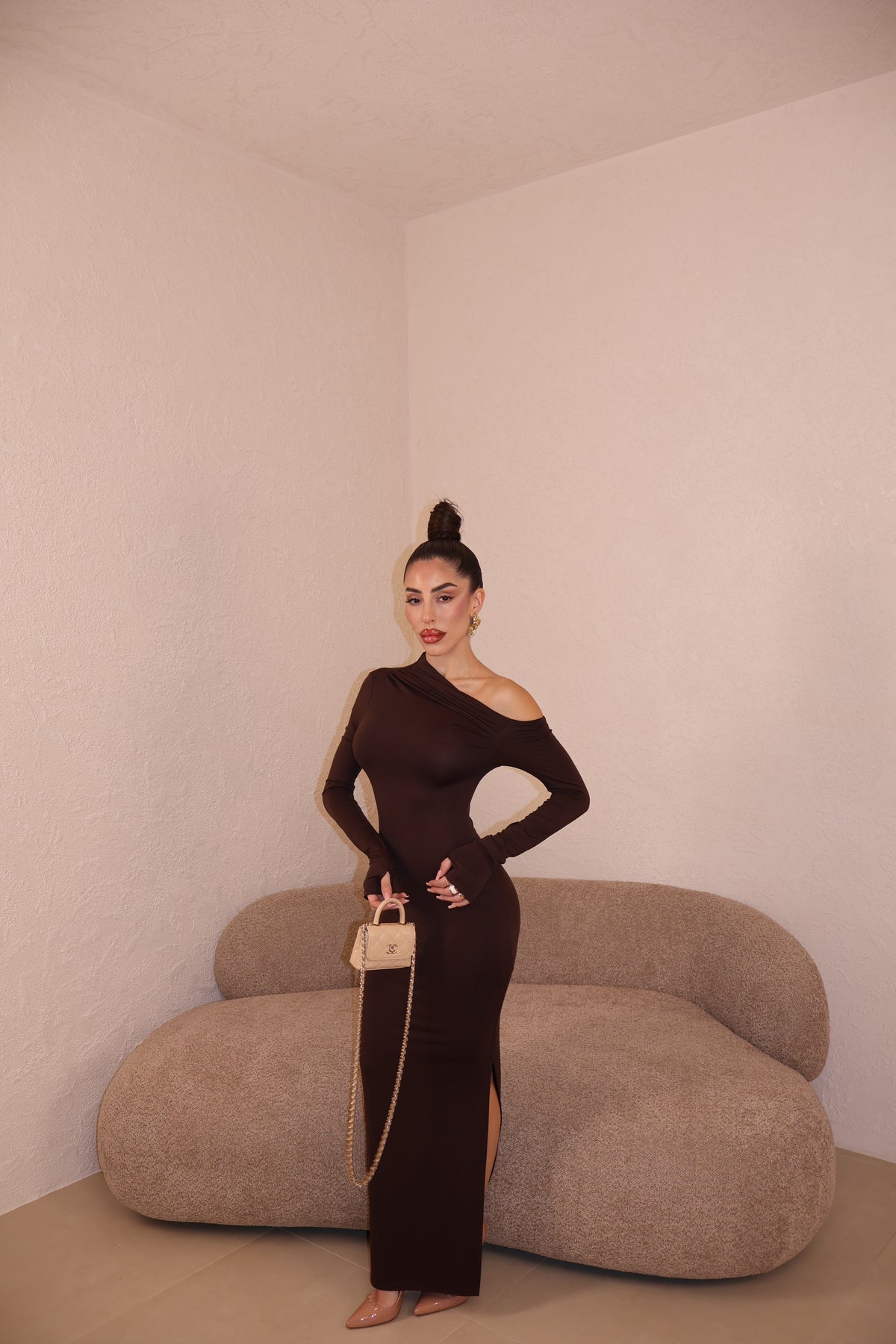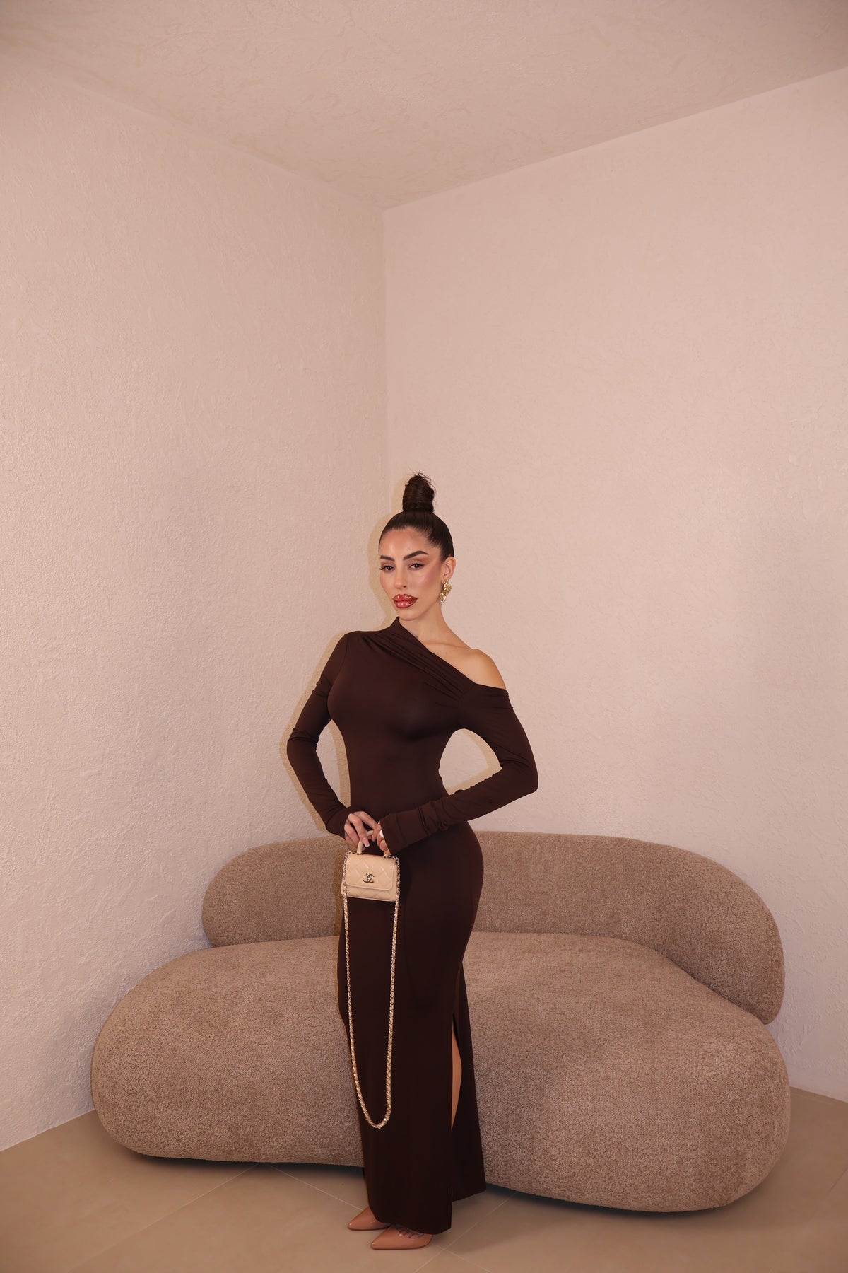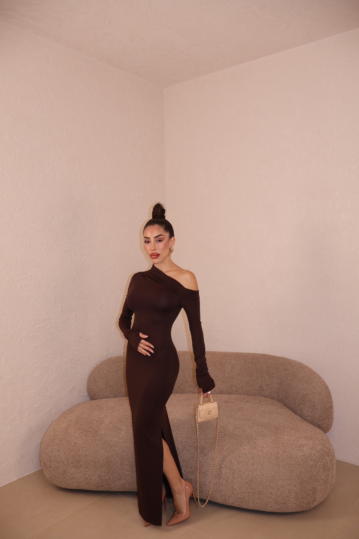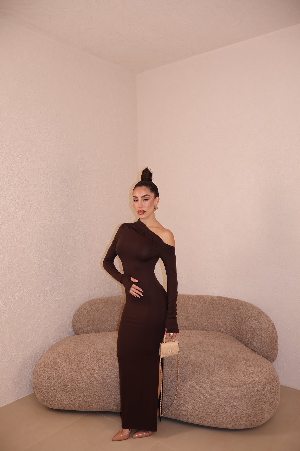 Abito in licra monospalla con maniche a guanto. Taglia unica.