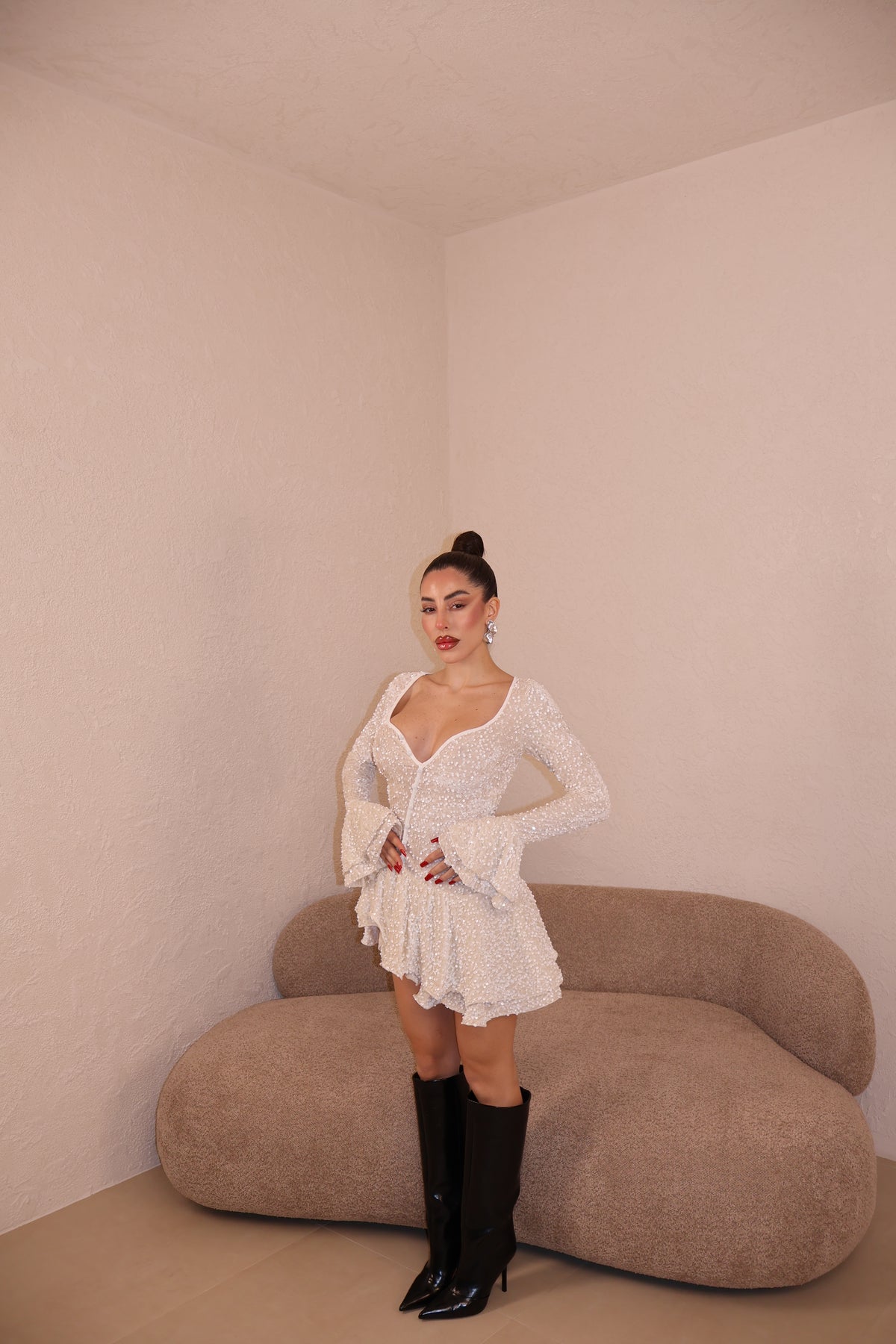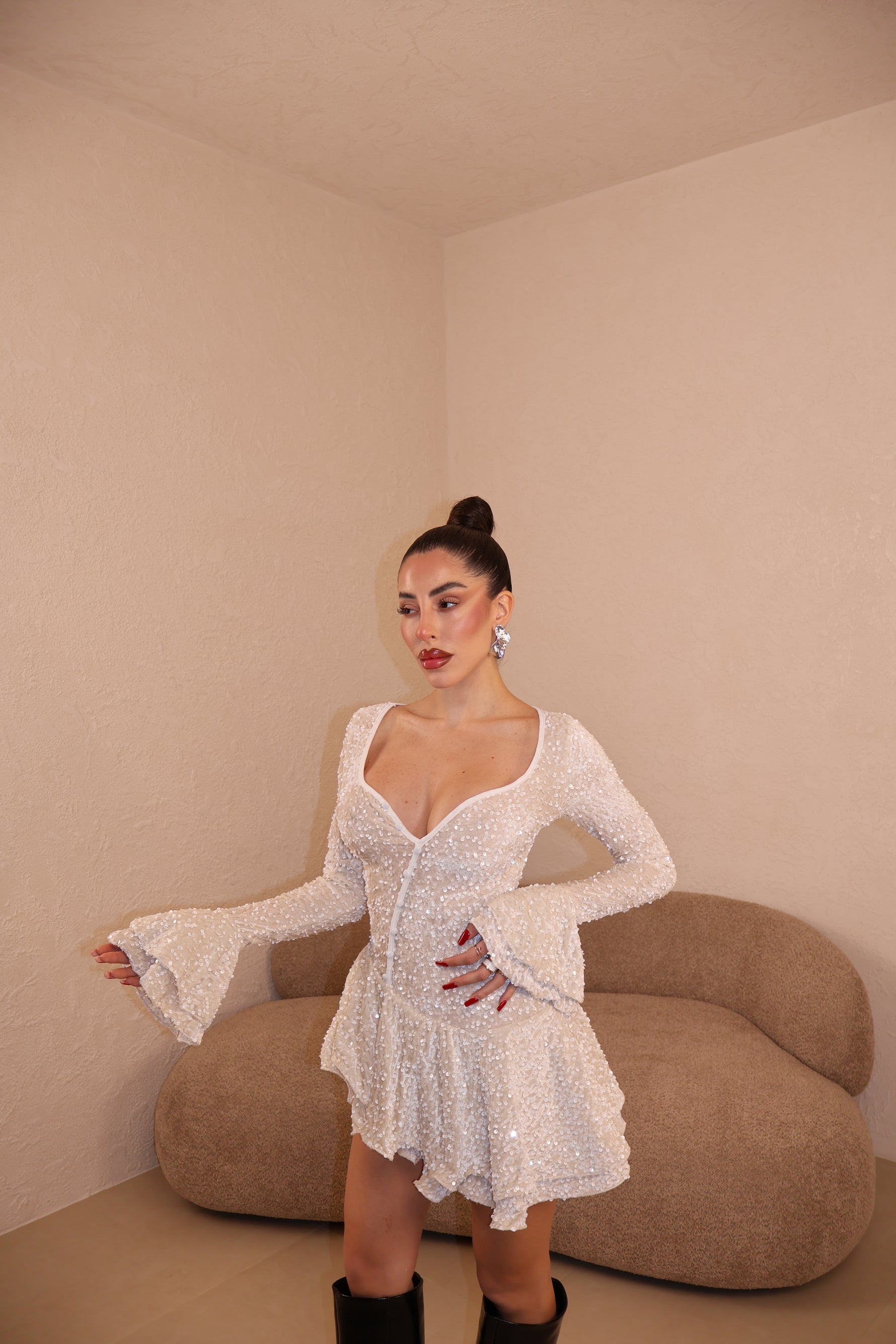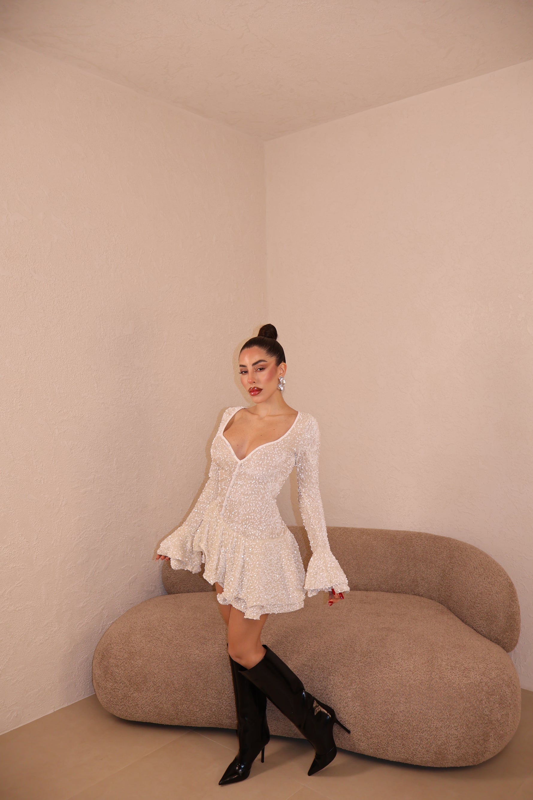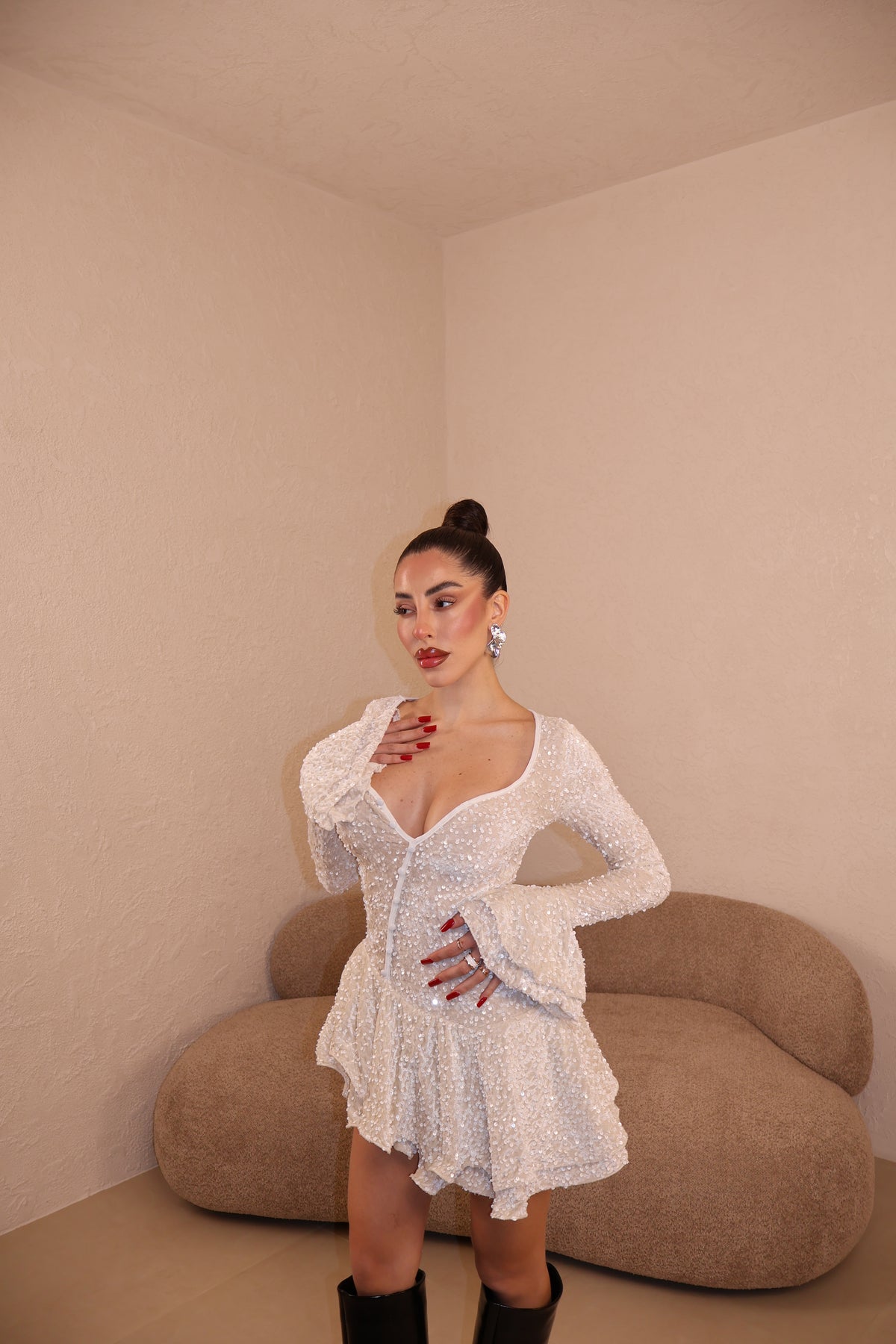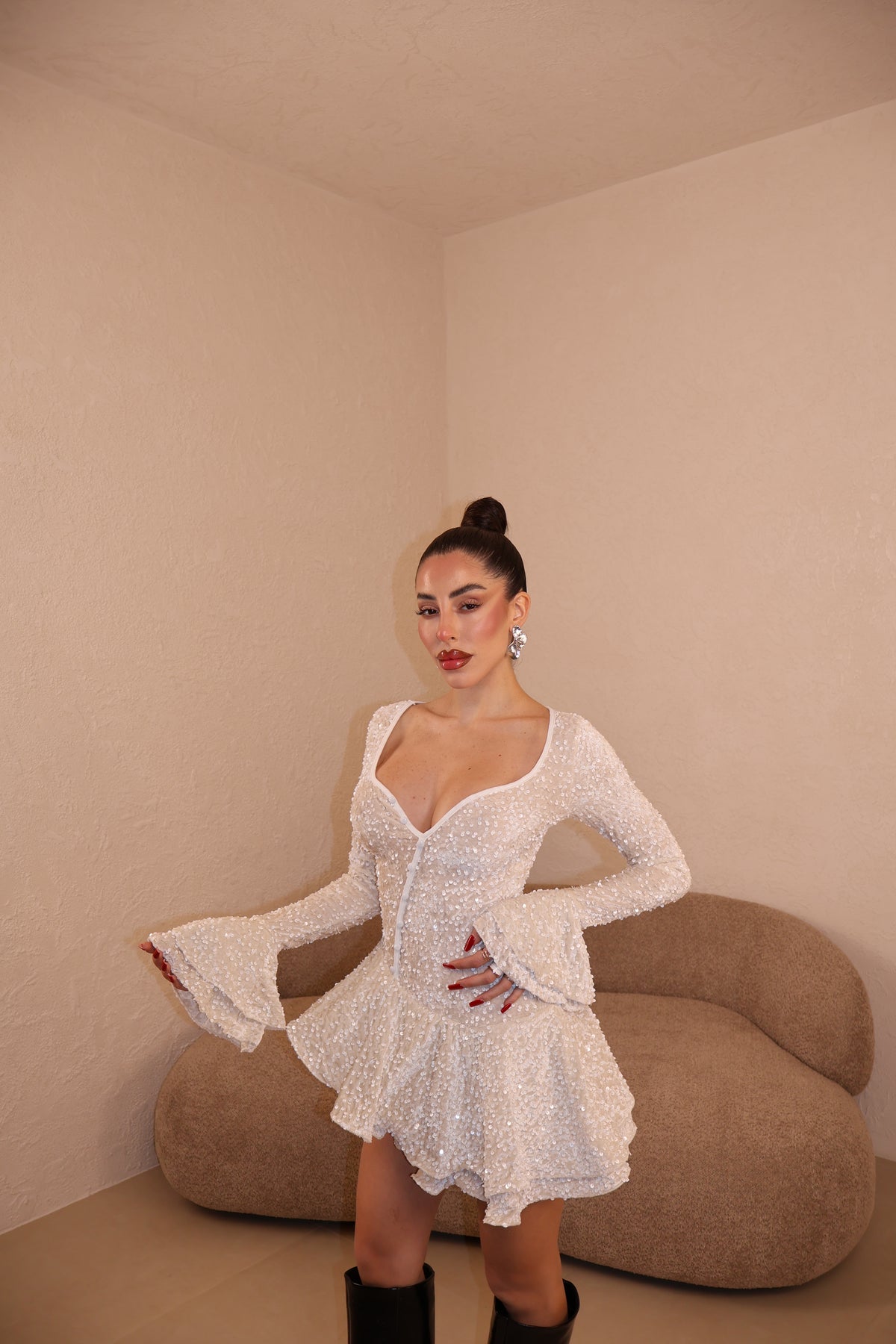 Abito corto in ciniglia con paillettes e volant. Culotte compresa. Maniche a campana. Taglia unica.