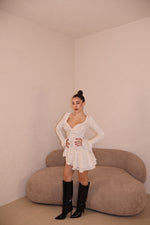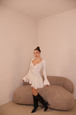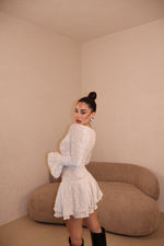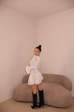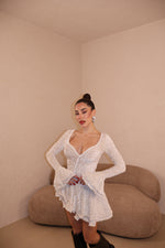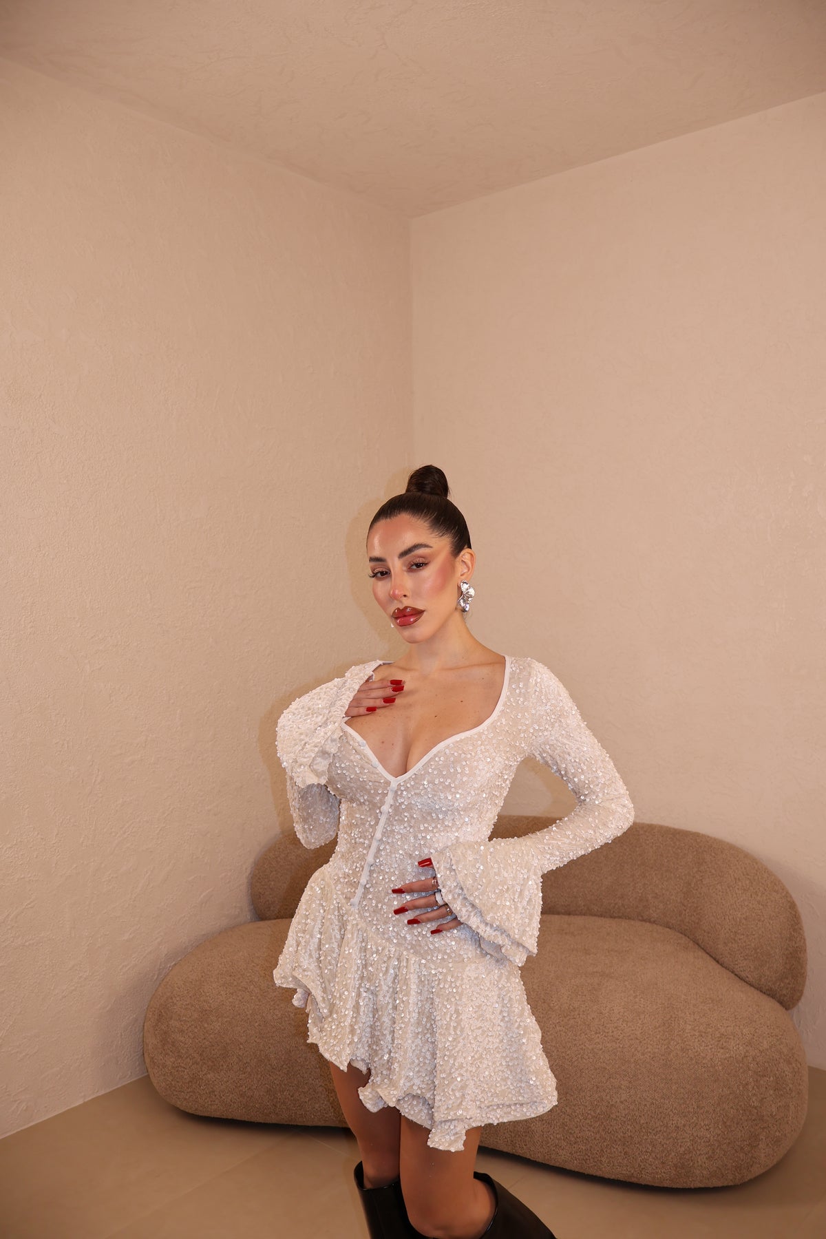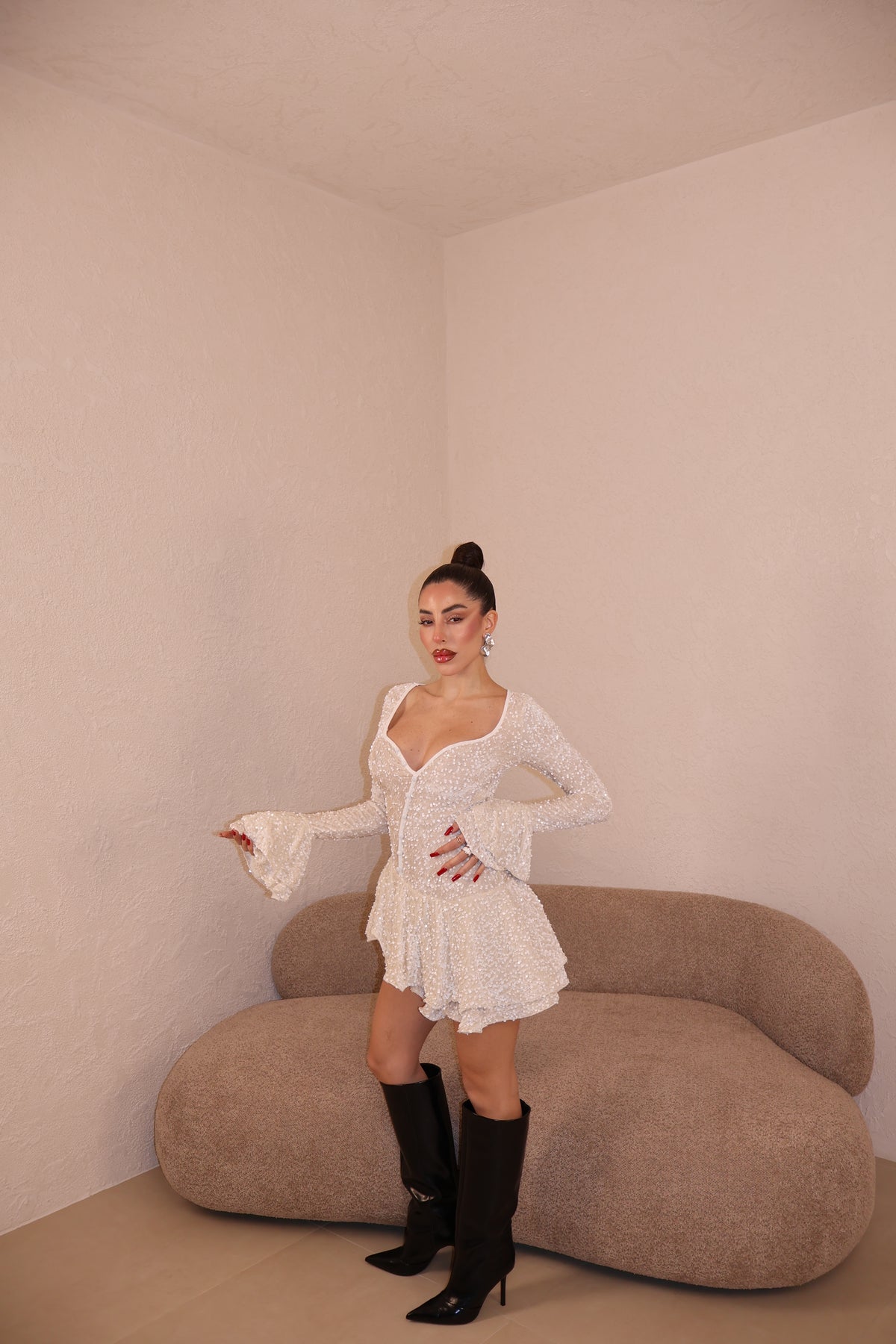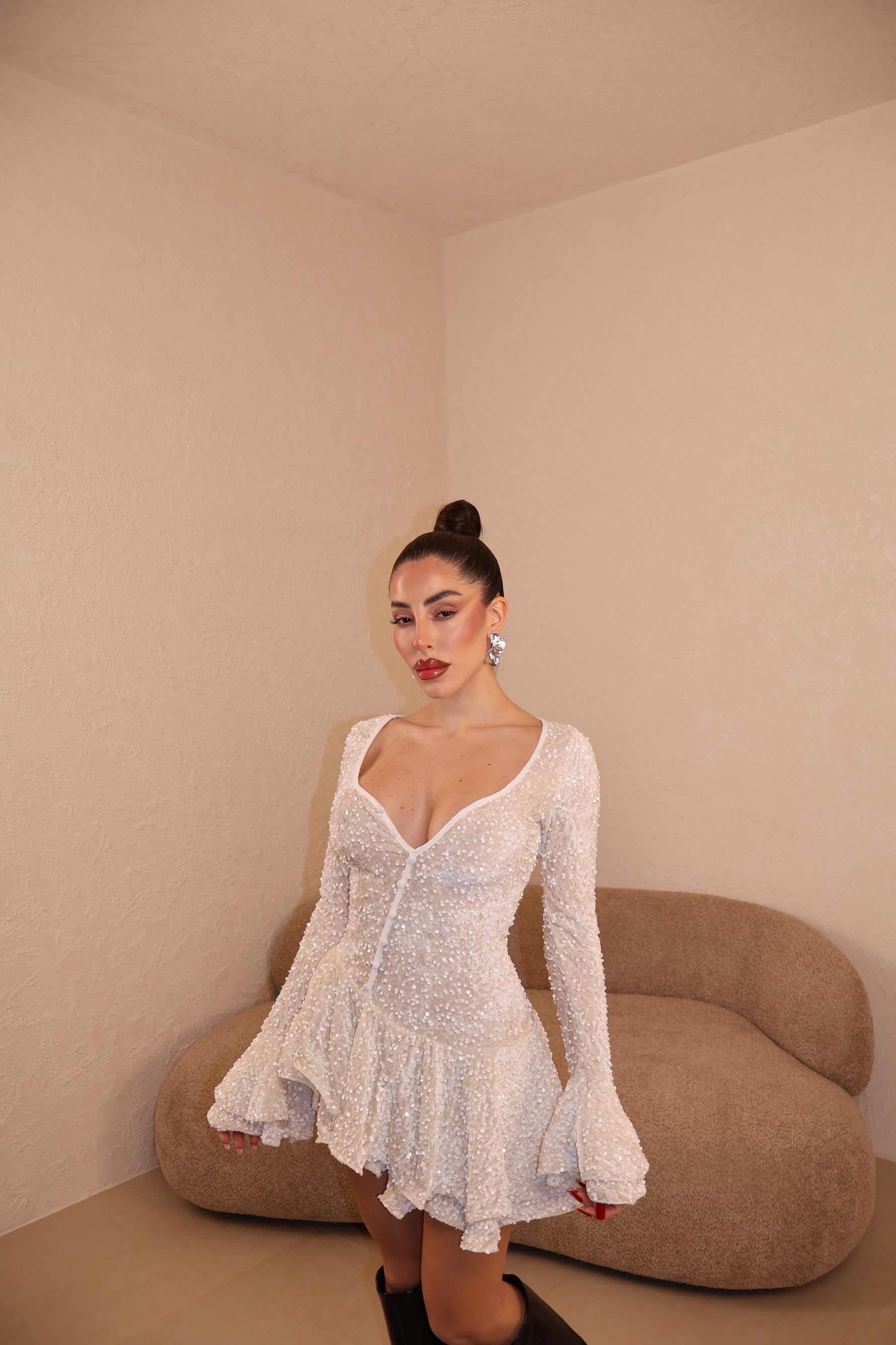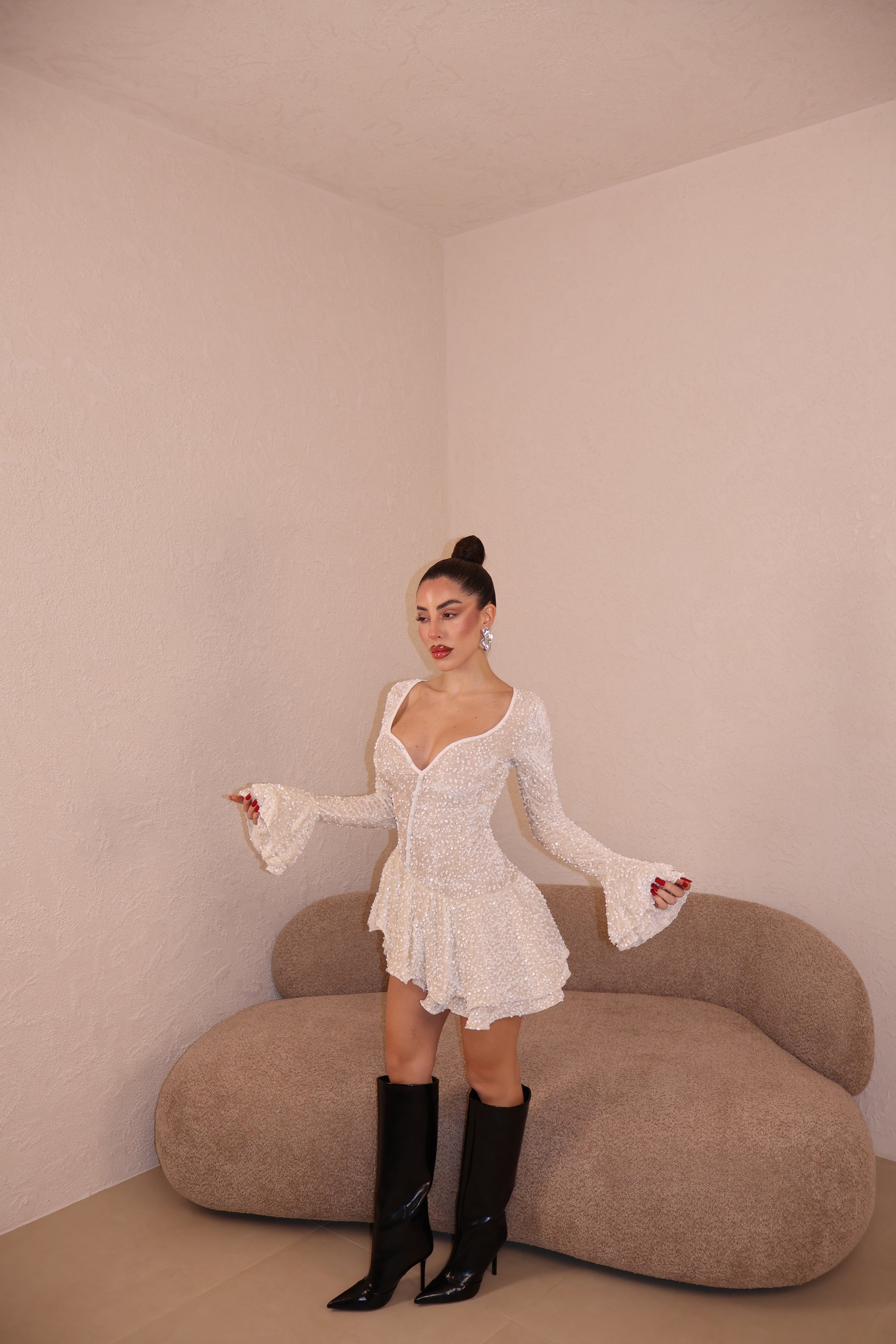 Abito corto in ciniglia con paillettes e volant. Culotte compresa. Maniche a campana. Taglia unica.