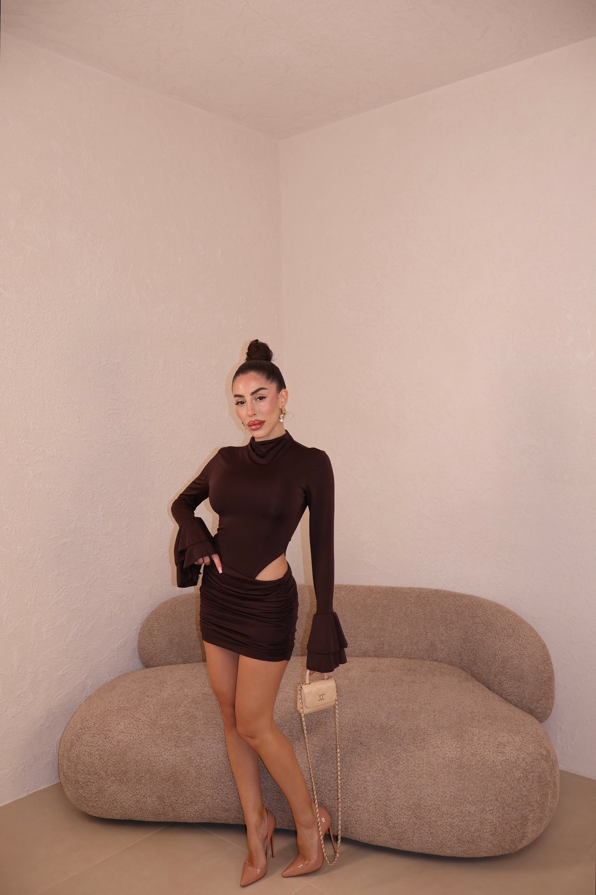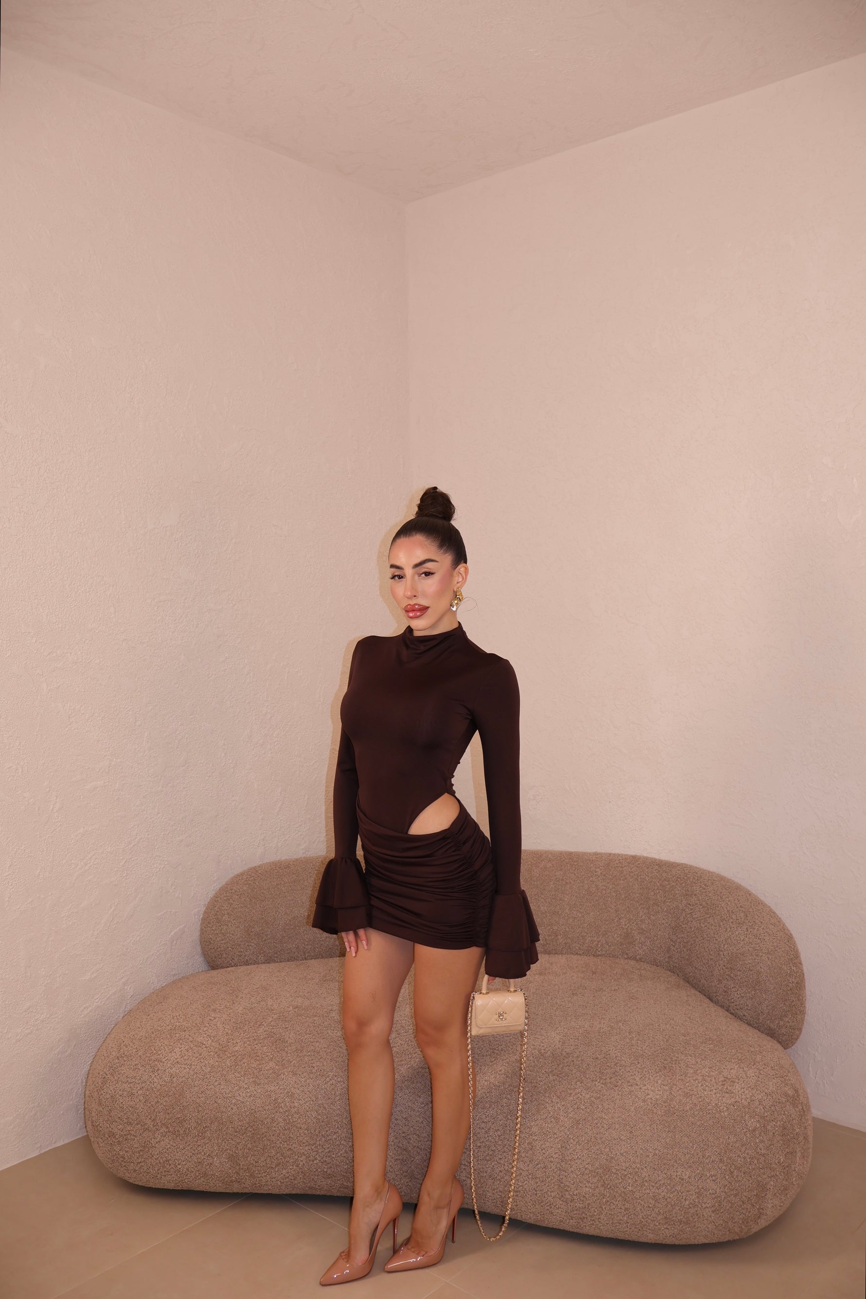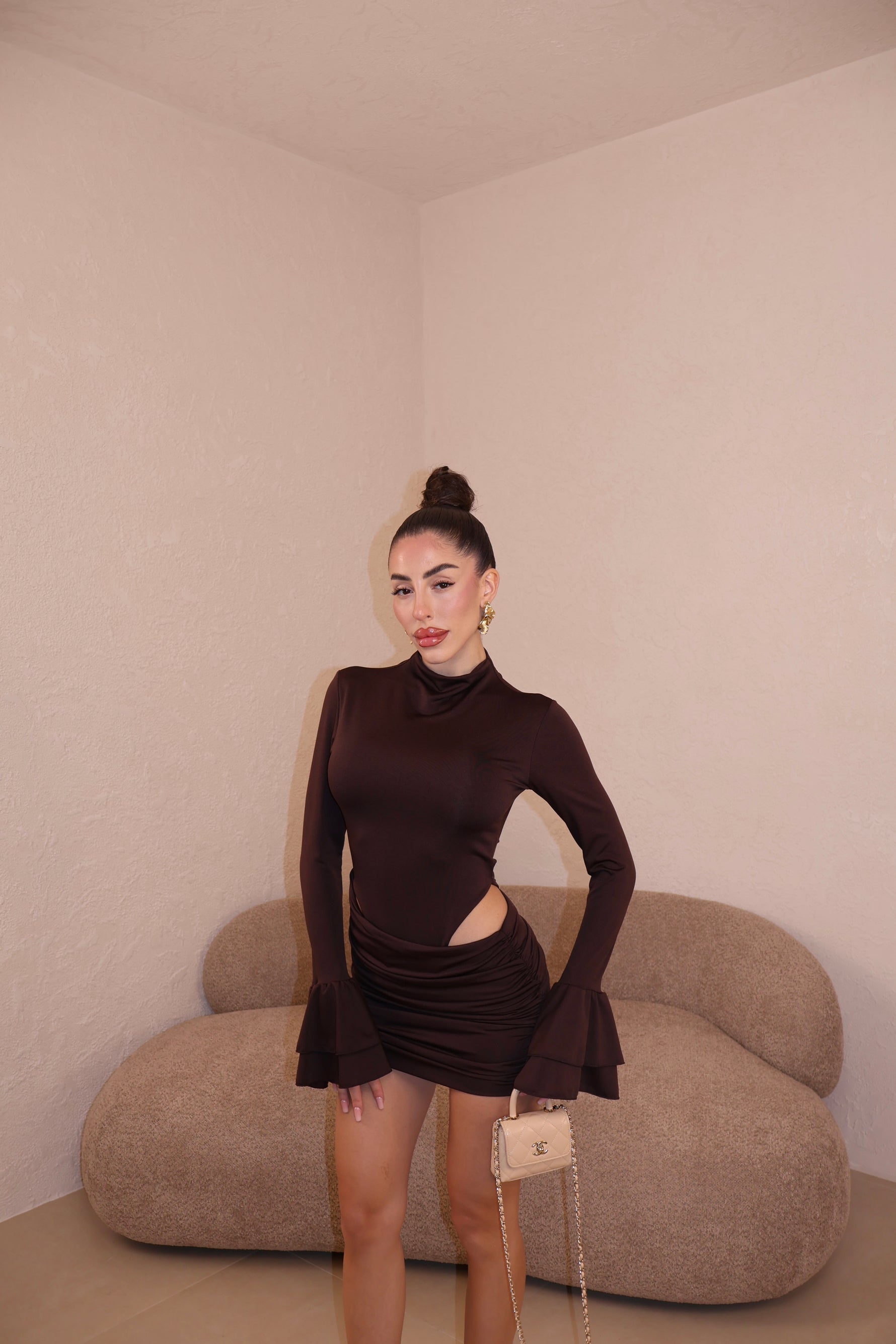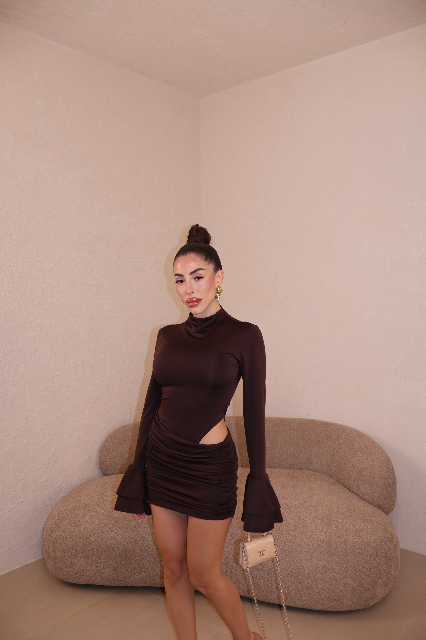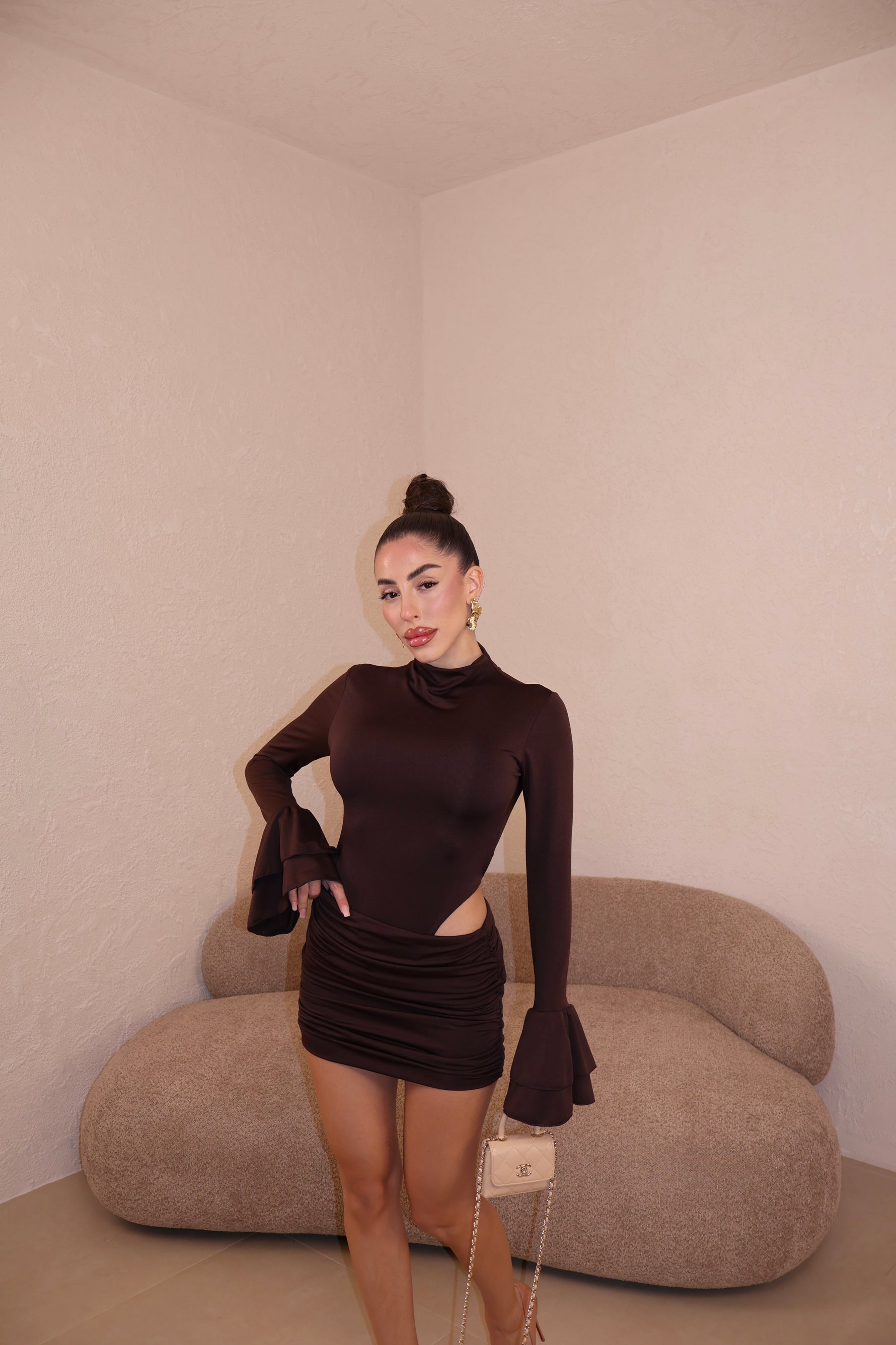 Abito corto in licra composto da body e gonna drappeggiata uniti. Maniche con volant. Taglia unica.