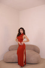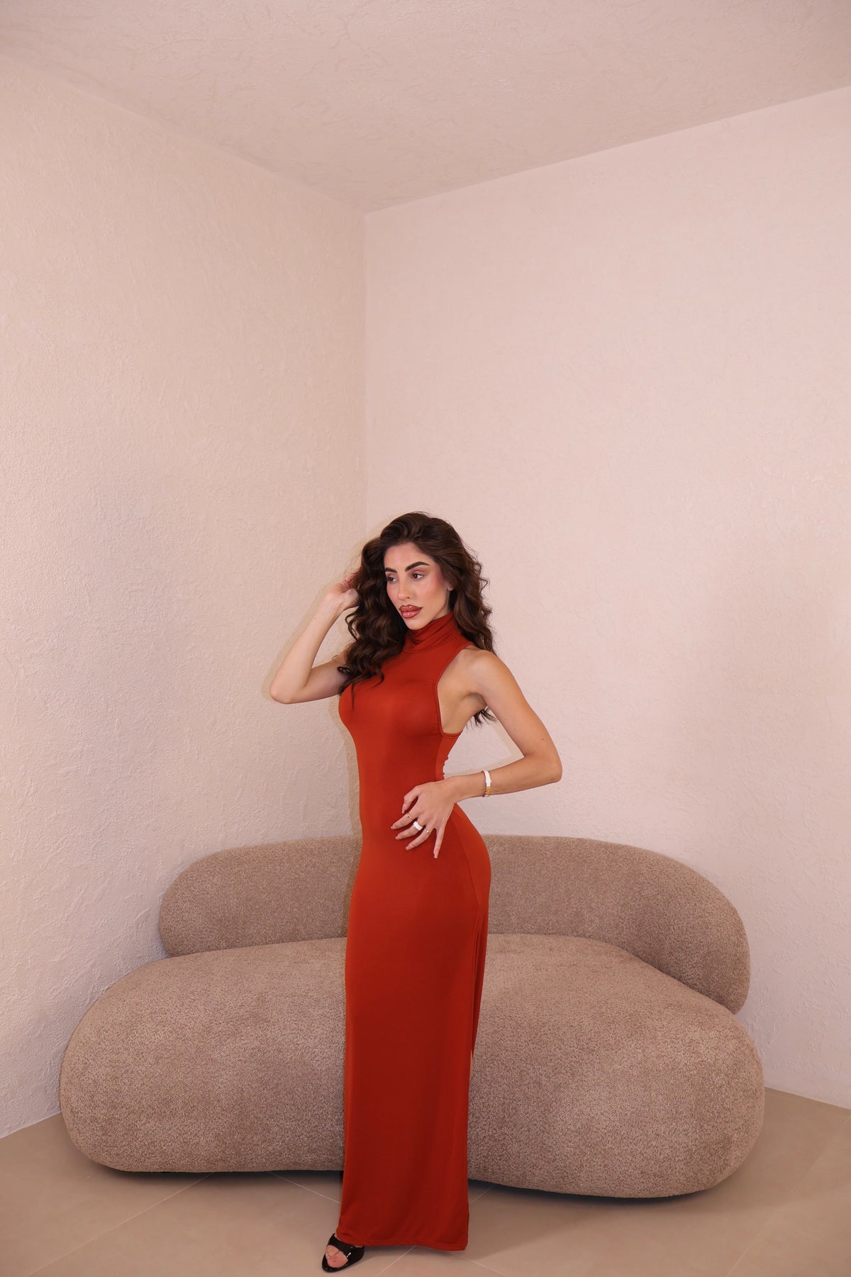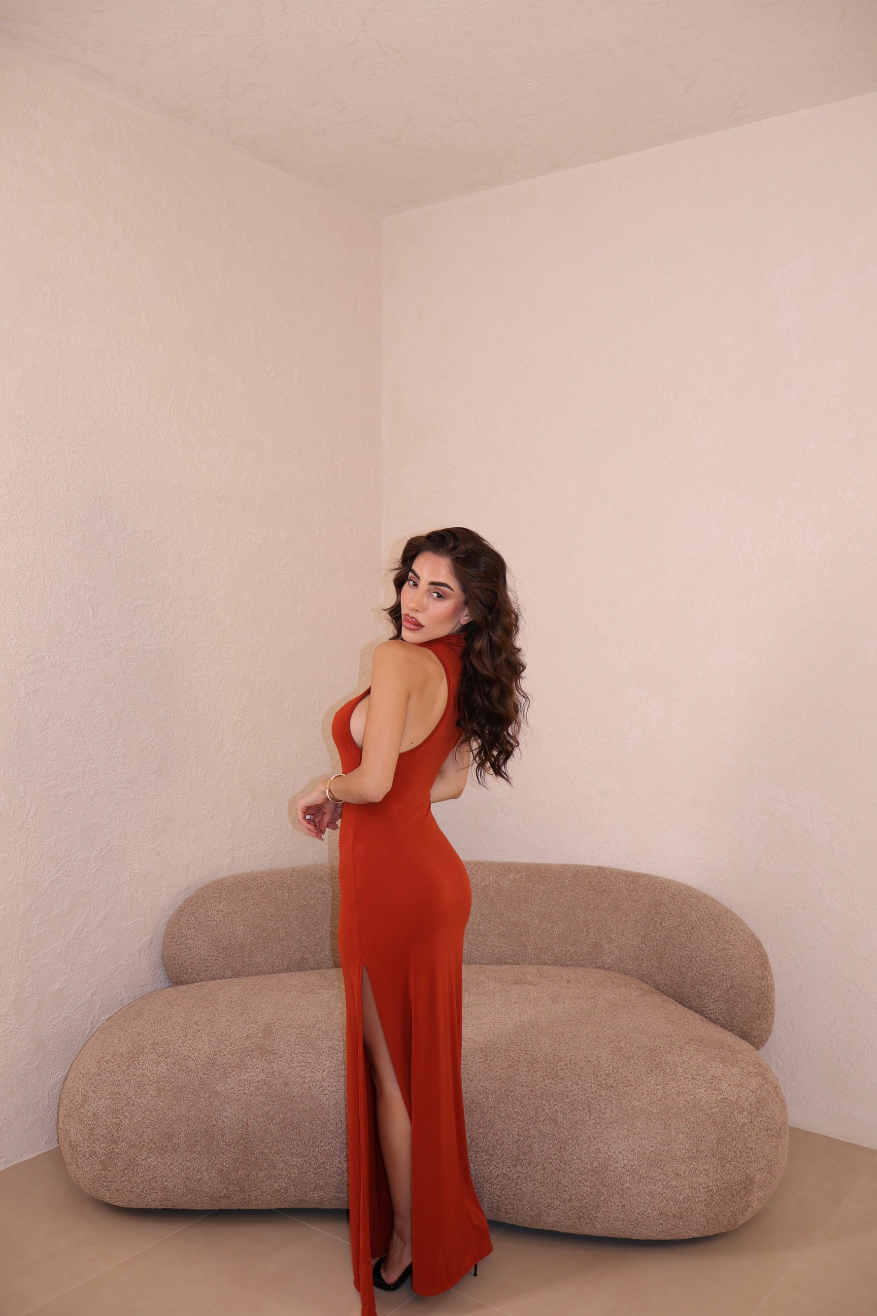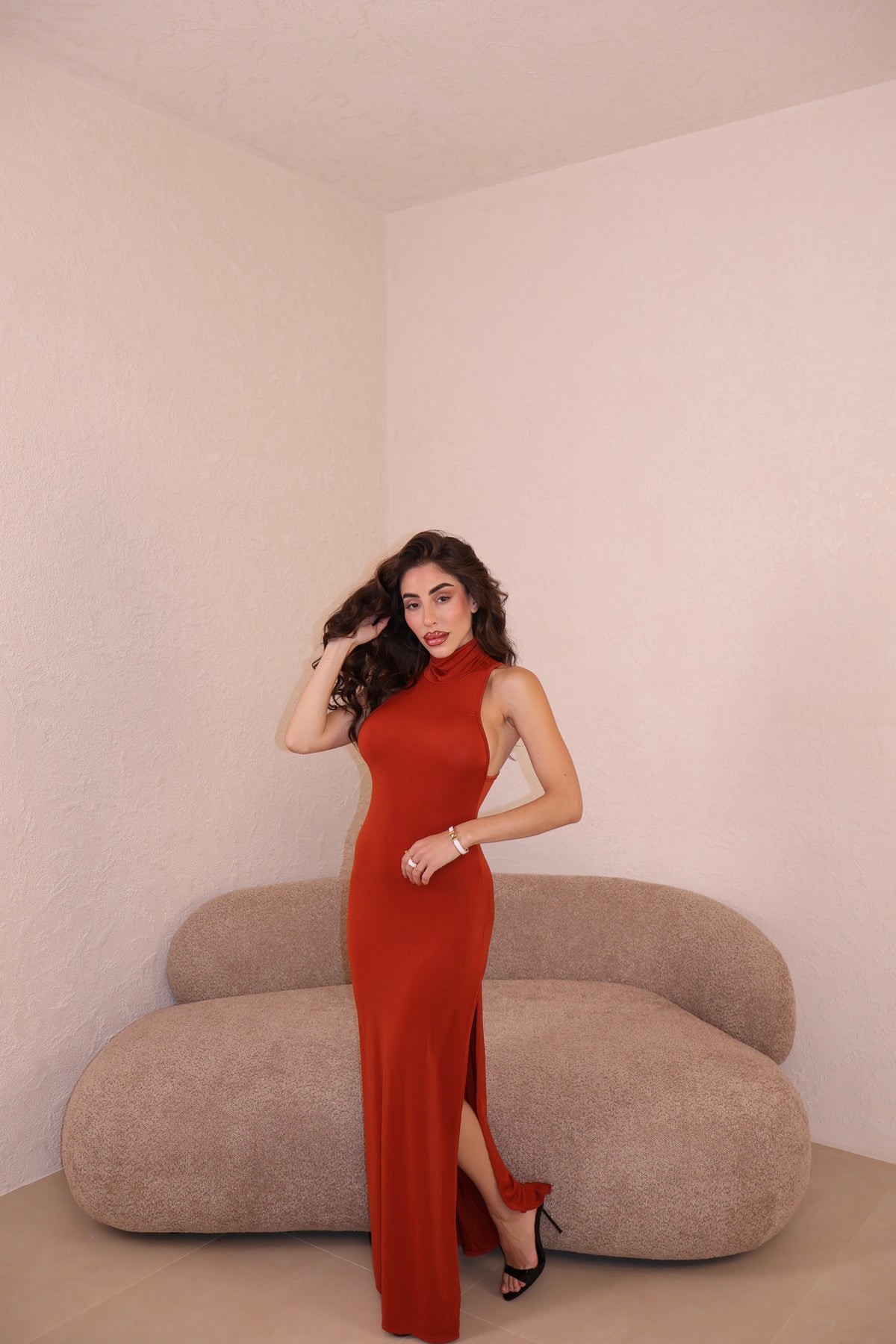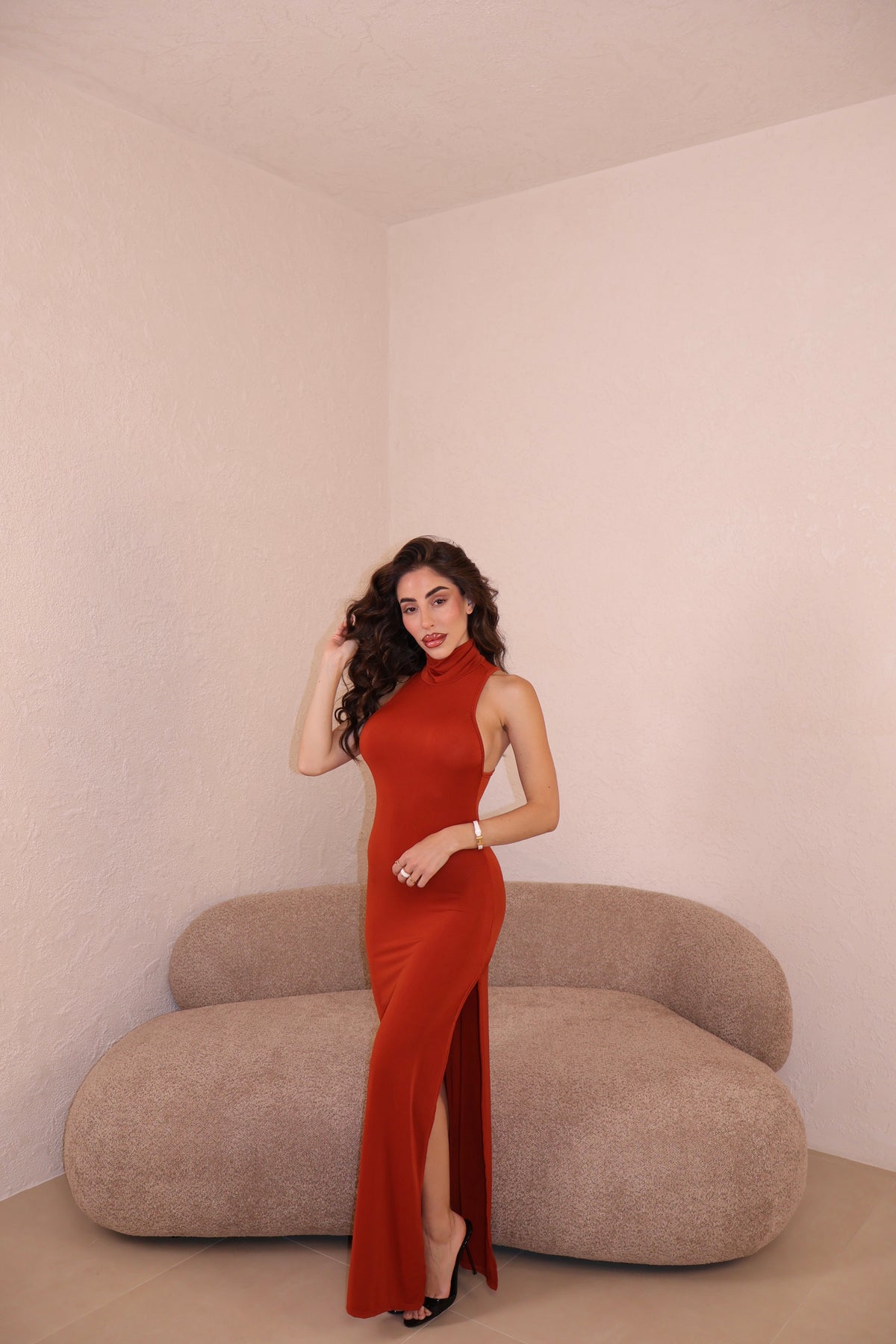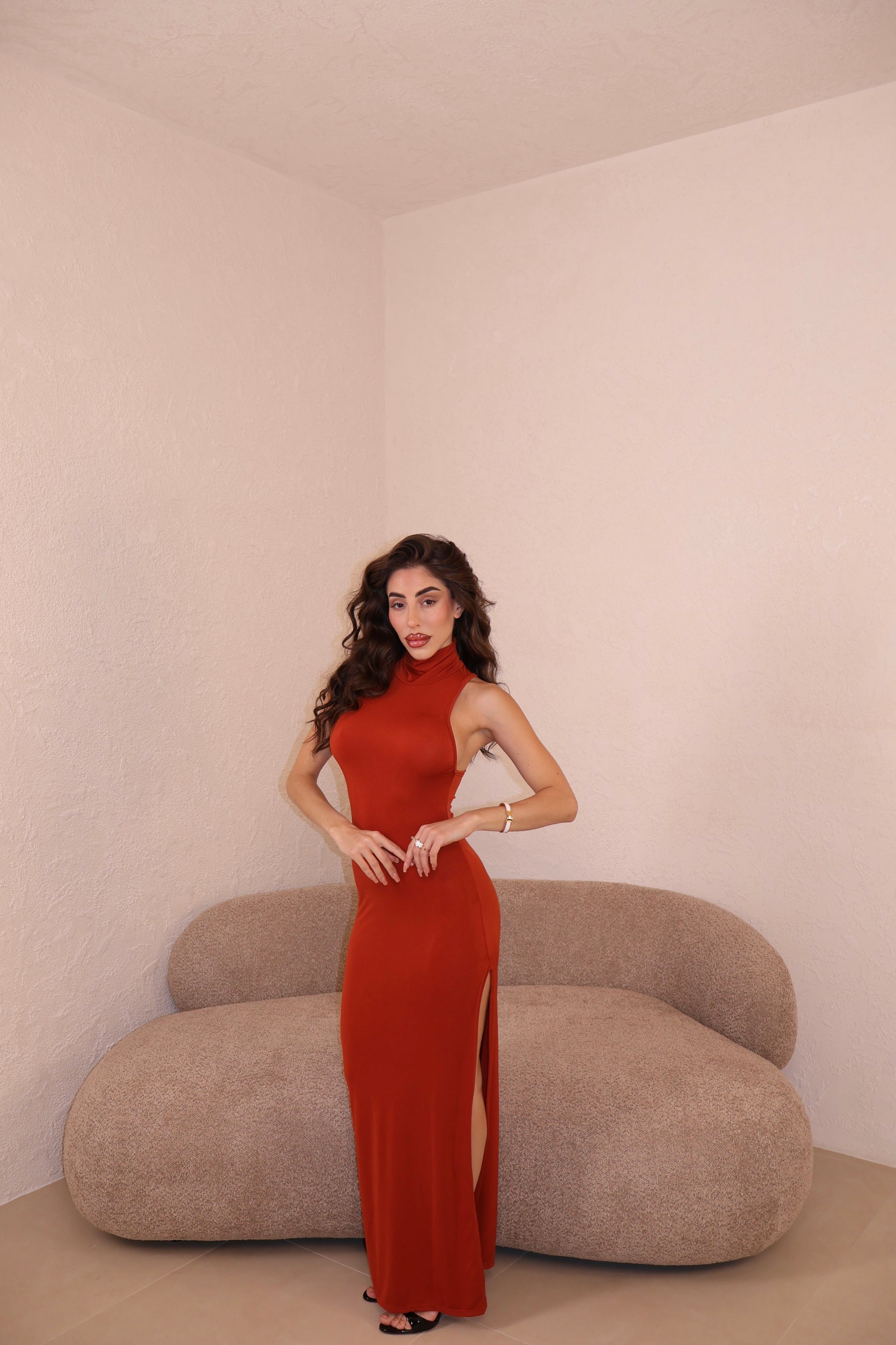 Abito lungo in licra con collo alto e spacco laterale. Taglia unica.
