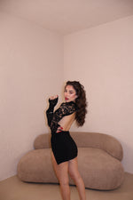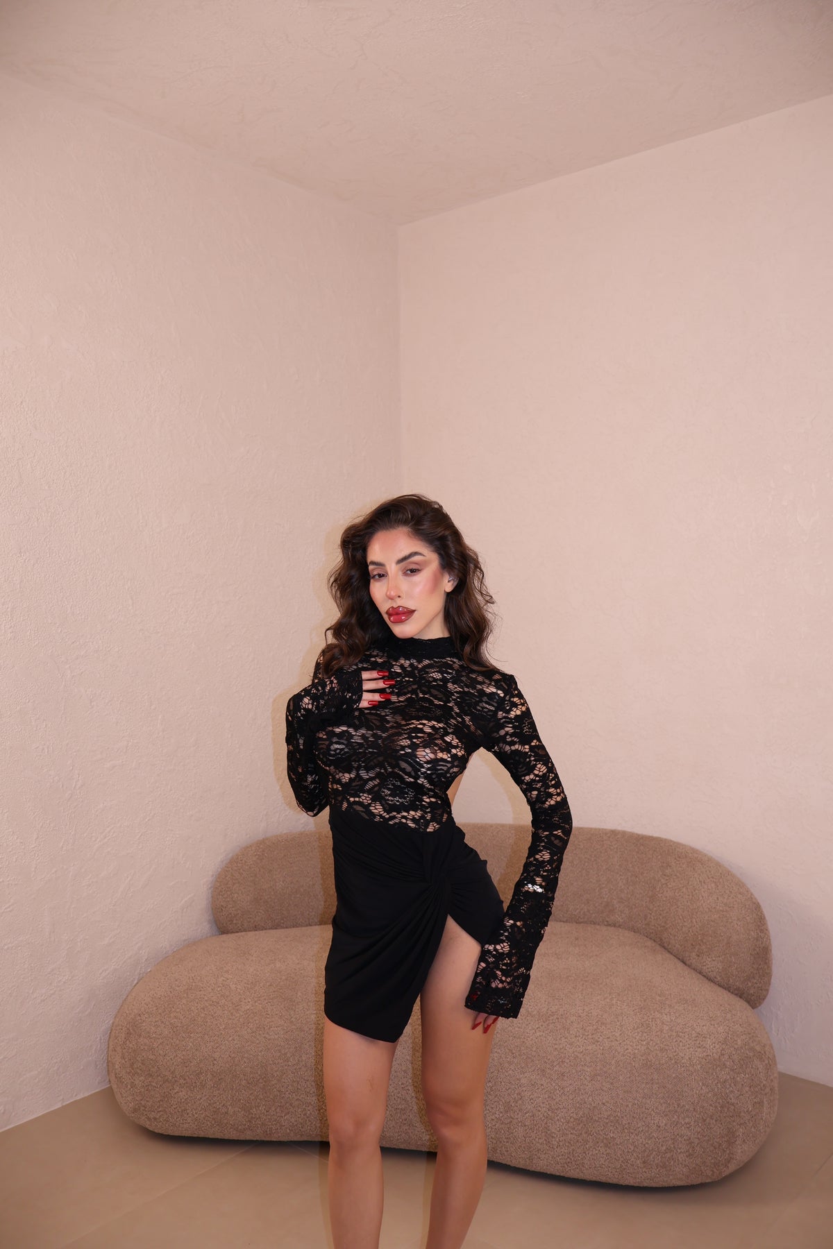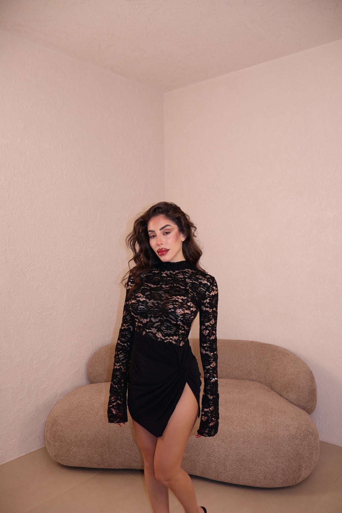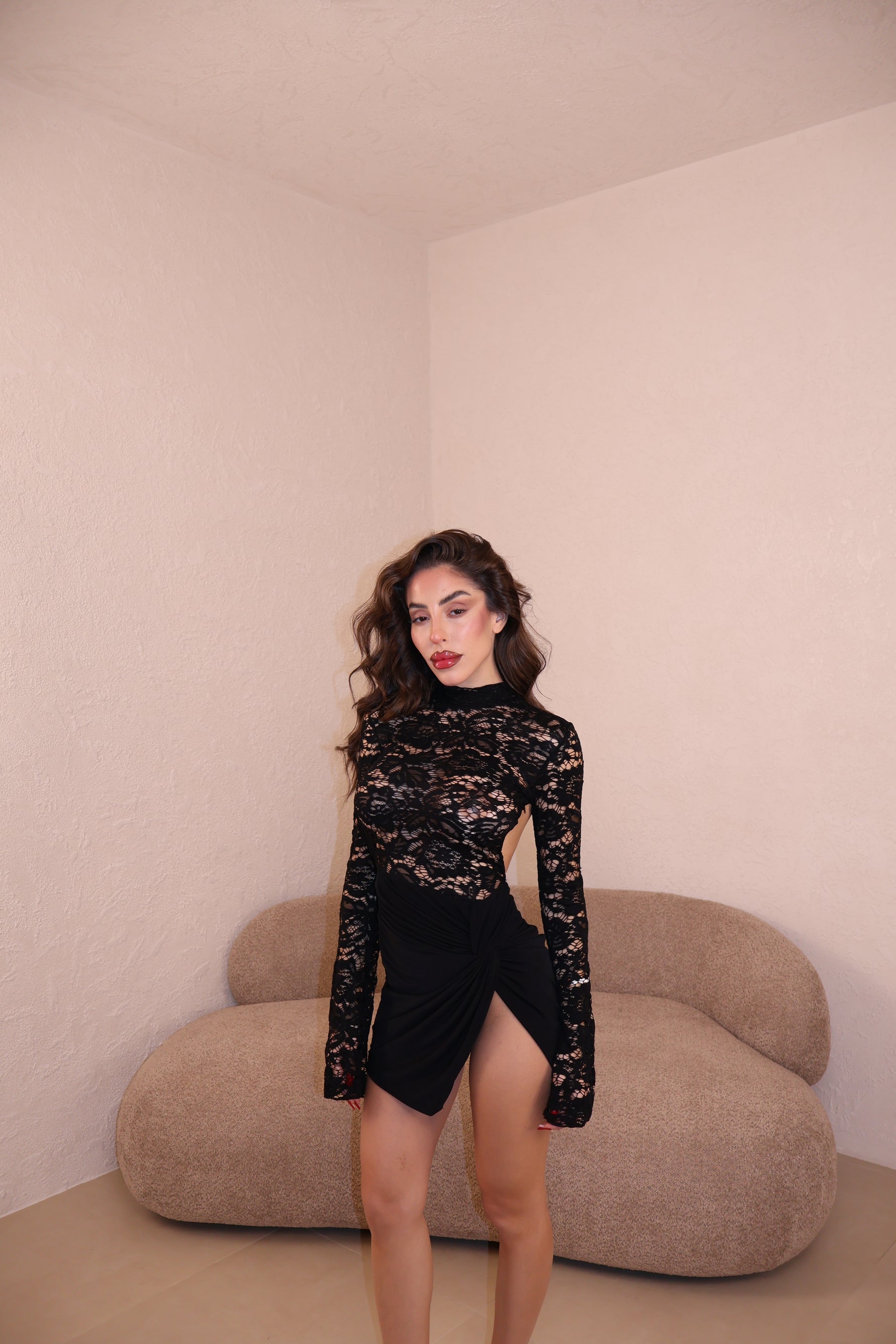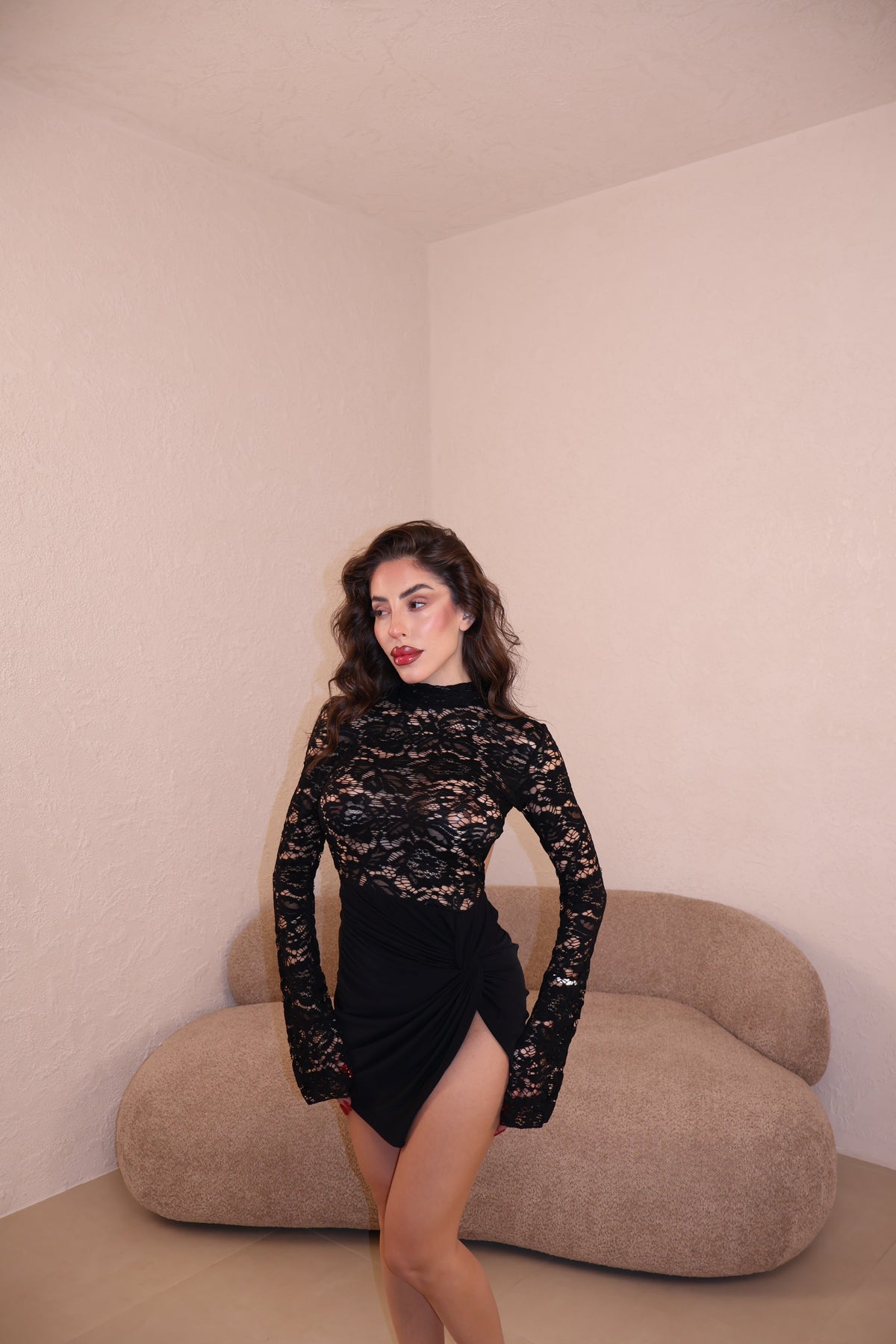 Abito corto in pizzo con nodo laterale. Taglia unica.