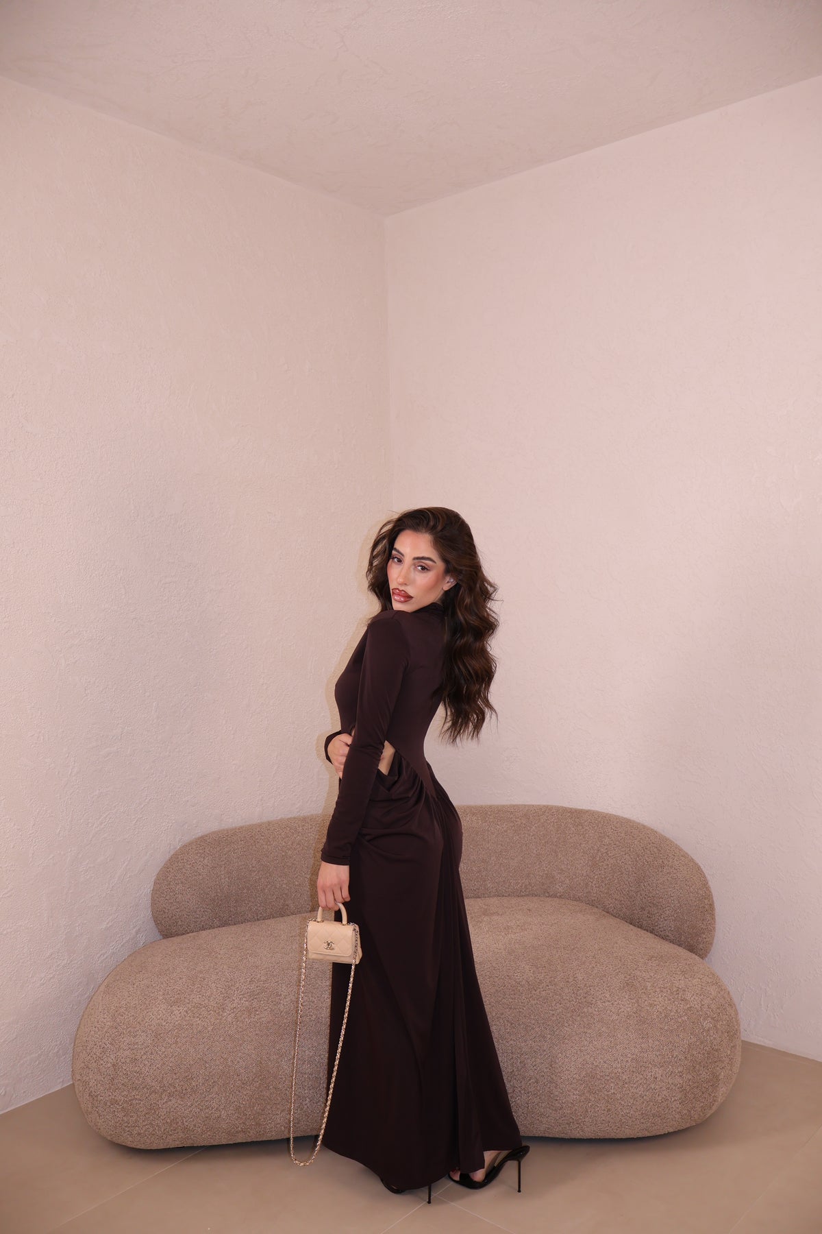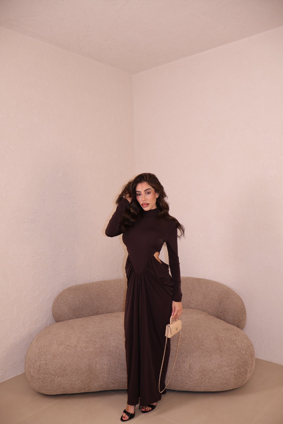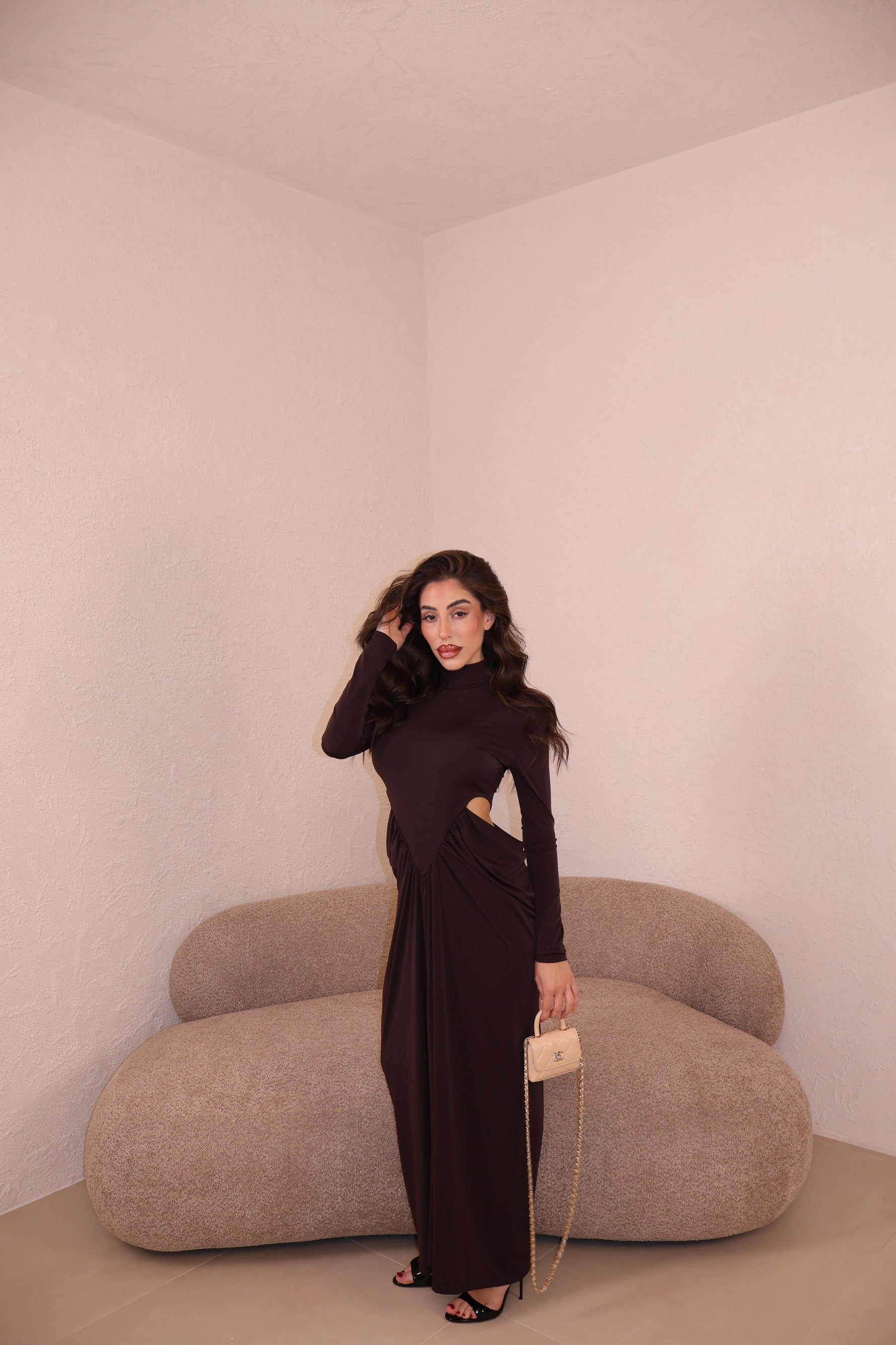 Abito lungo in lycra con drappeggi e aperture laterali. Taglia unica.
