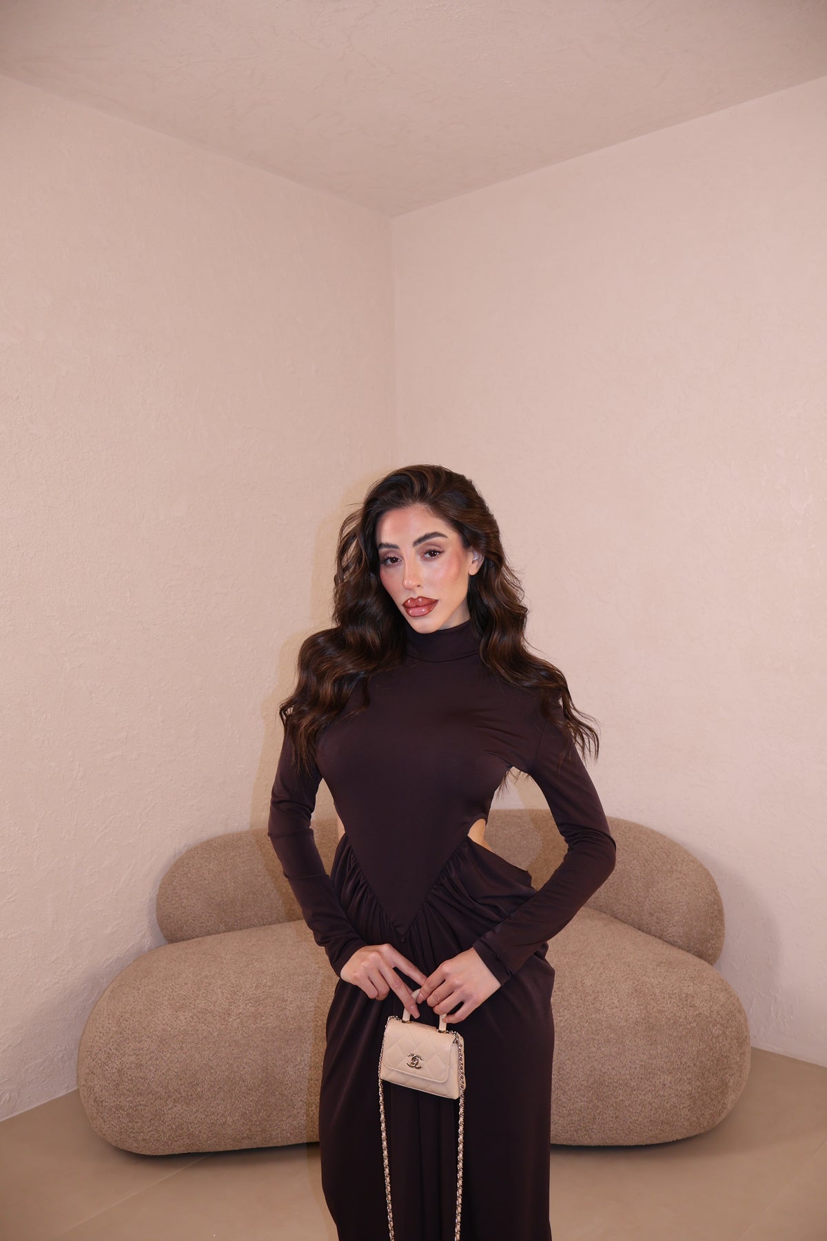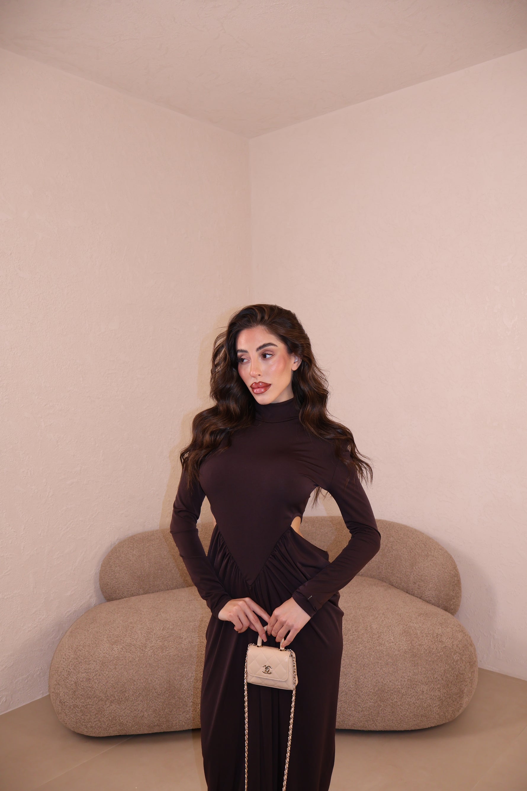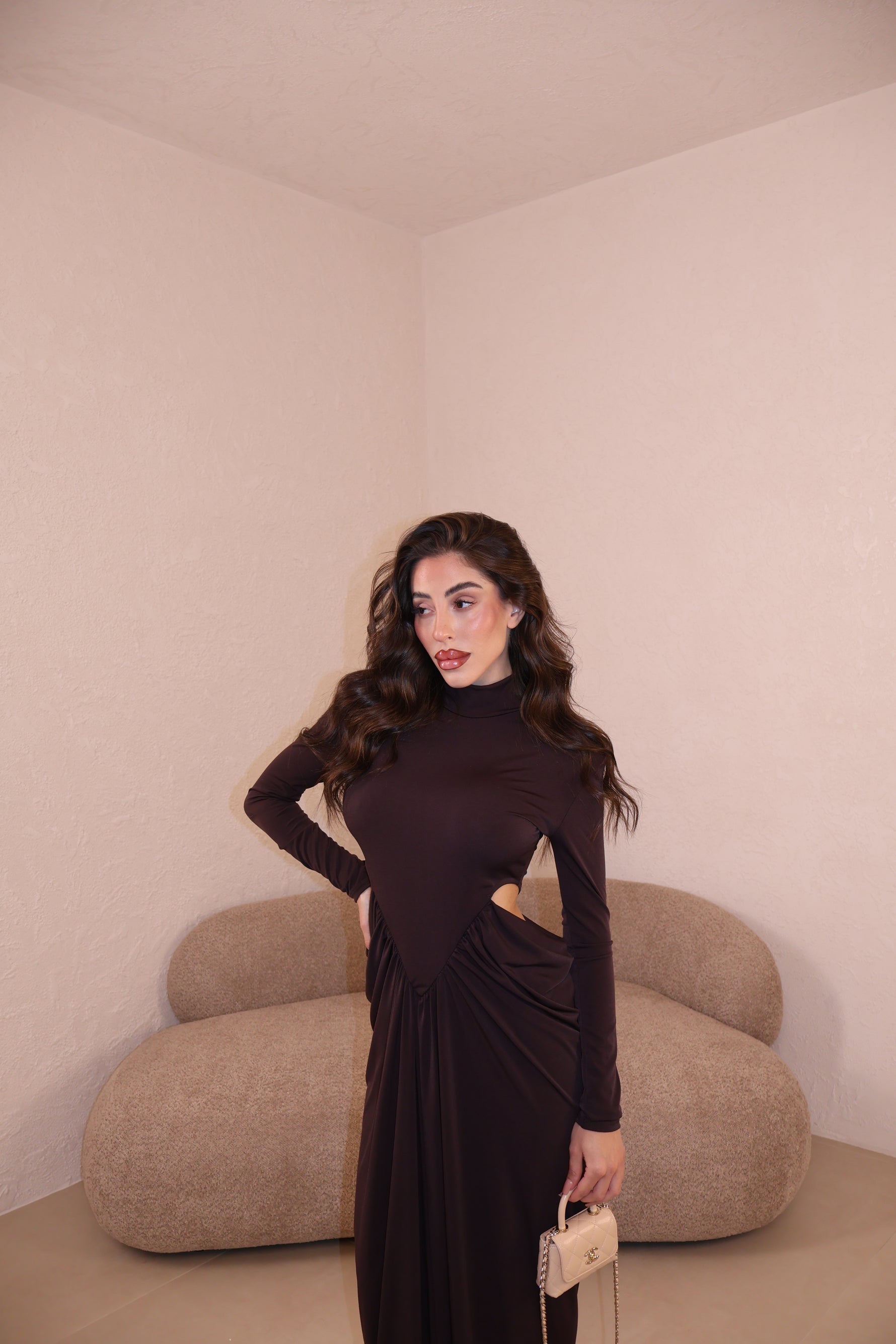 Abito lungo in lycra con drappeggi e aperture laterali. Taglia unica.