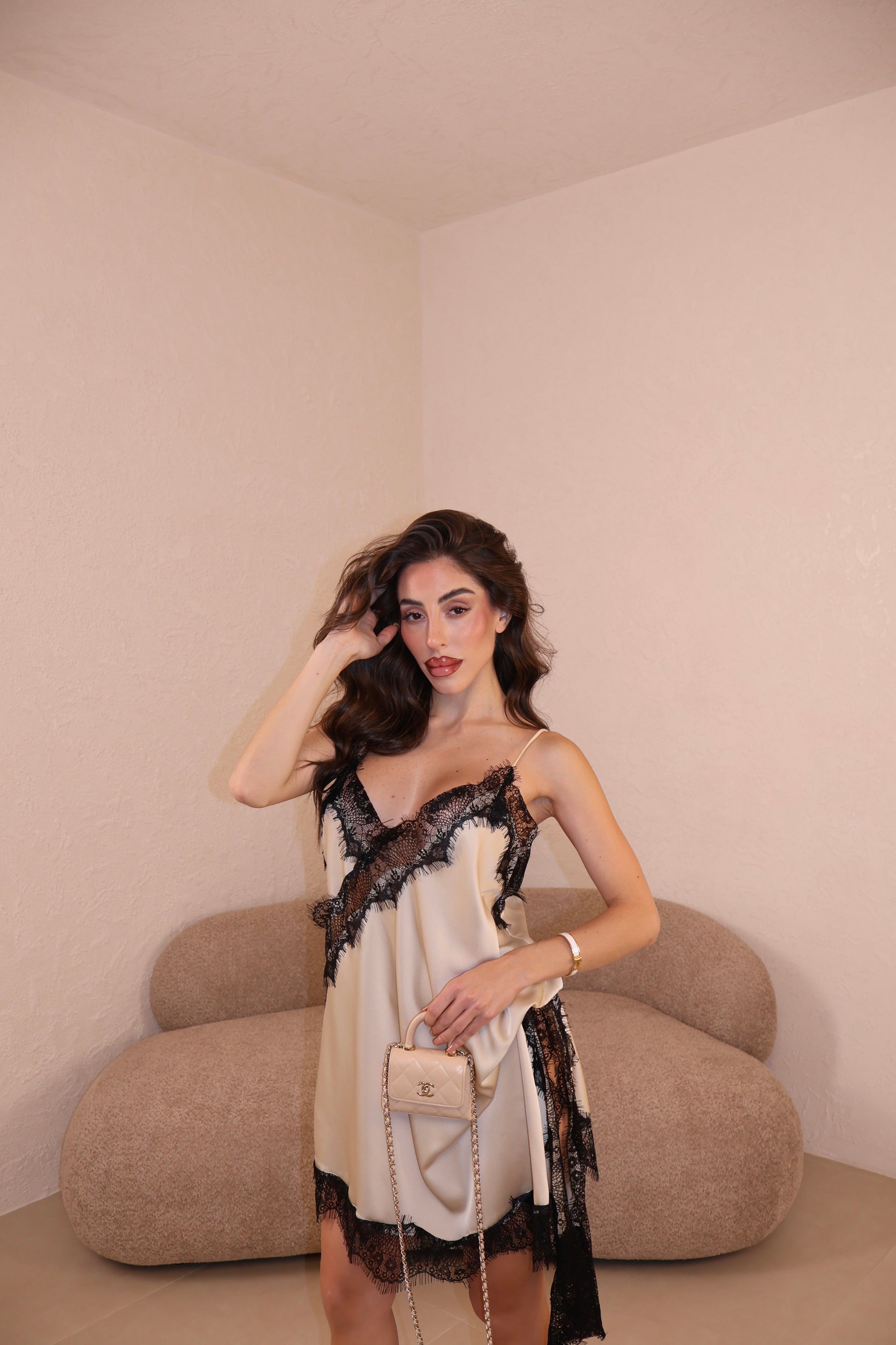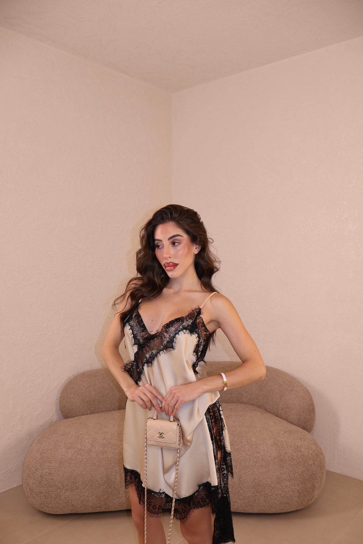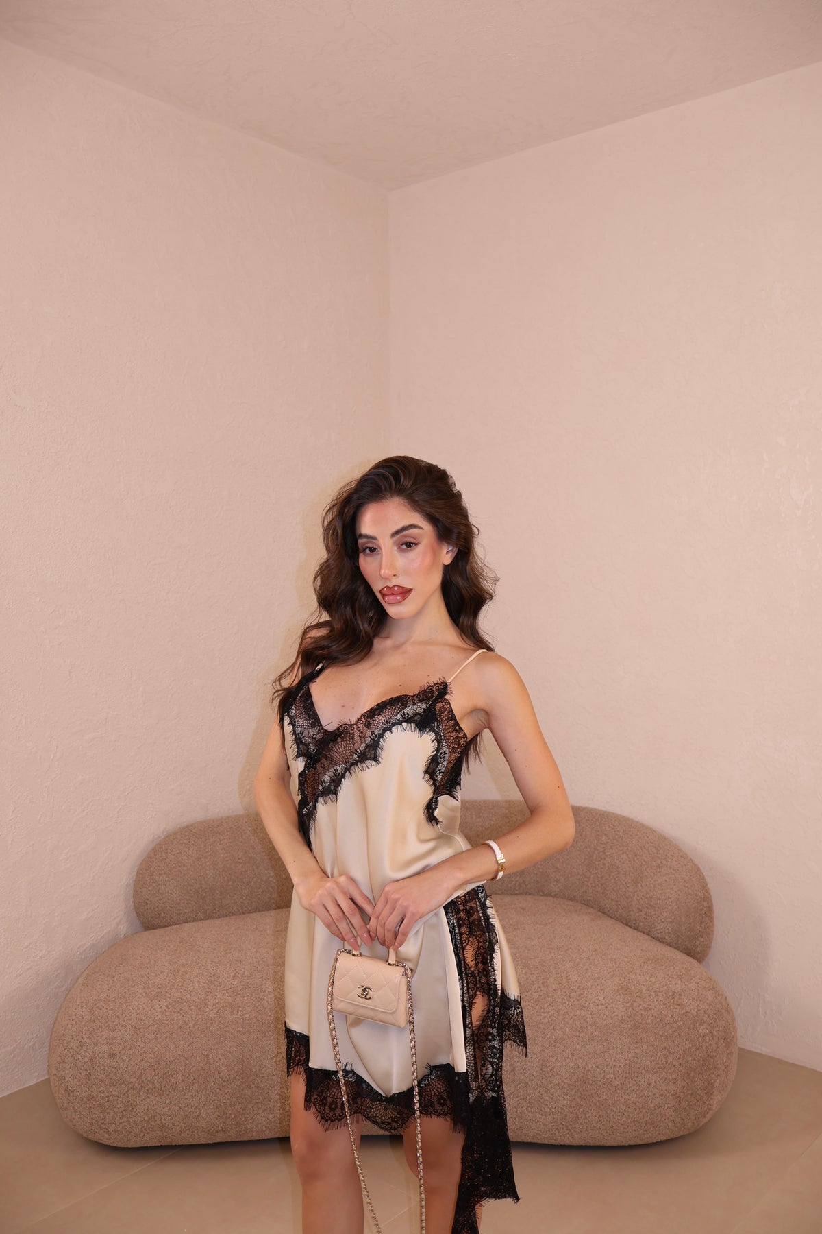 Abito corto in raso con dettagli in pizzo e spacco laterale. Taglia unica.