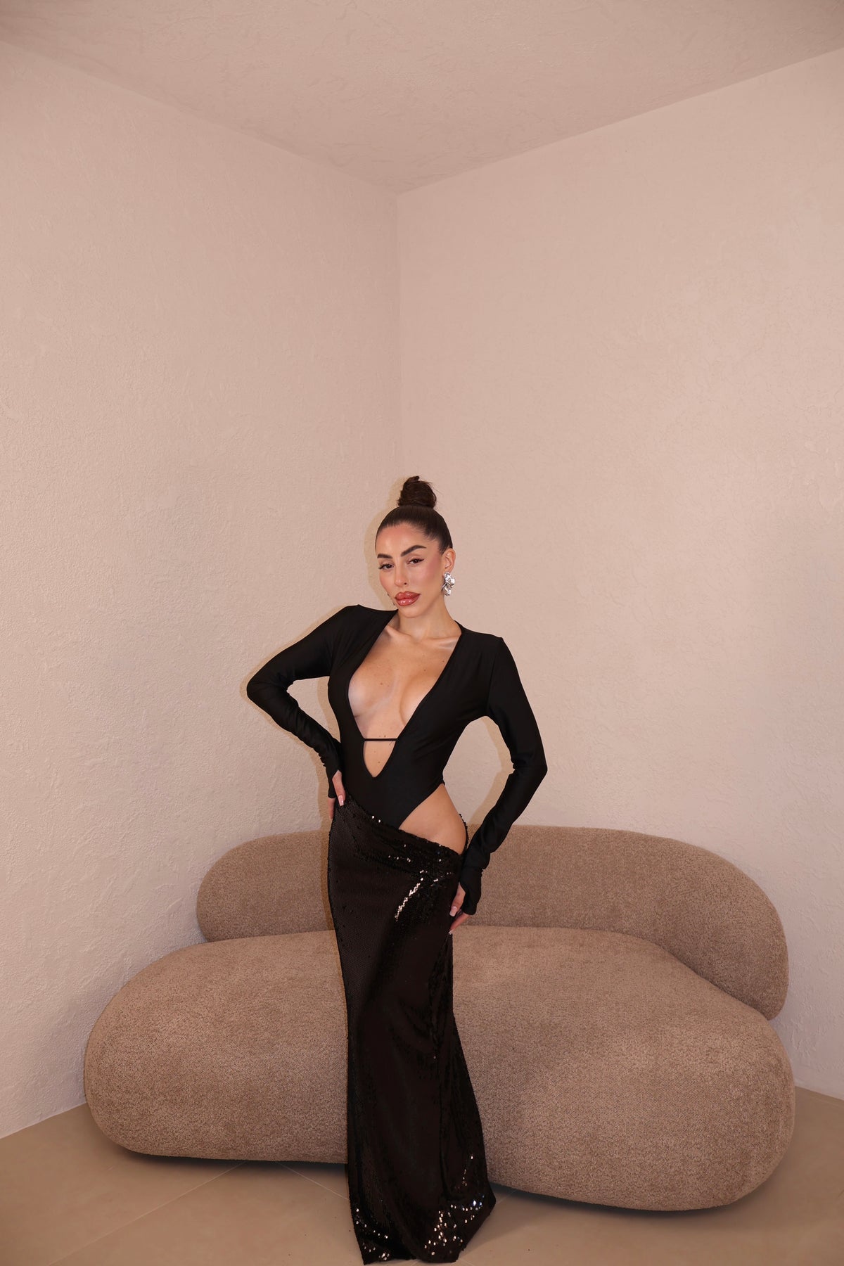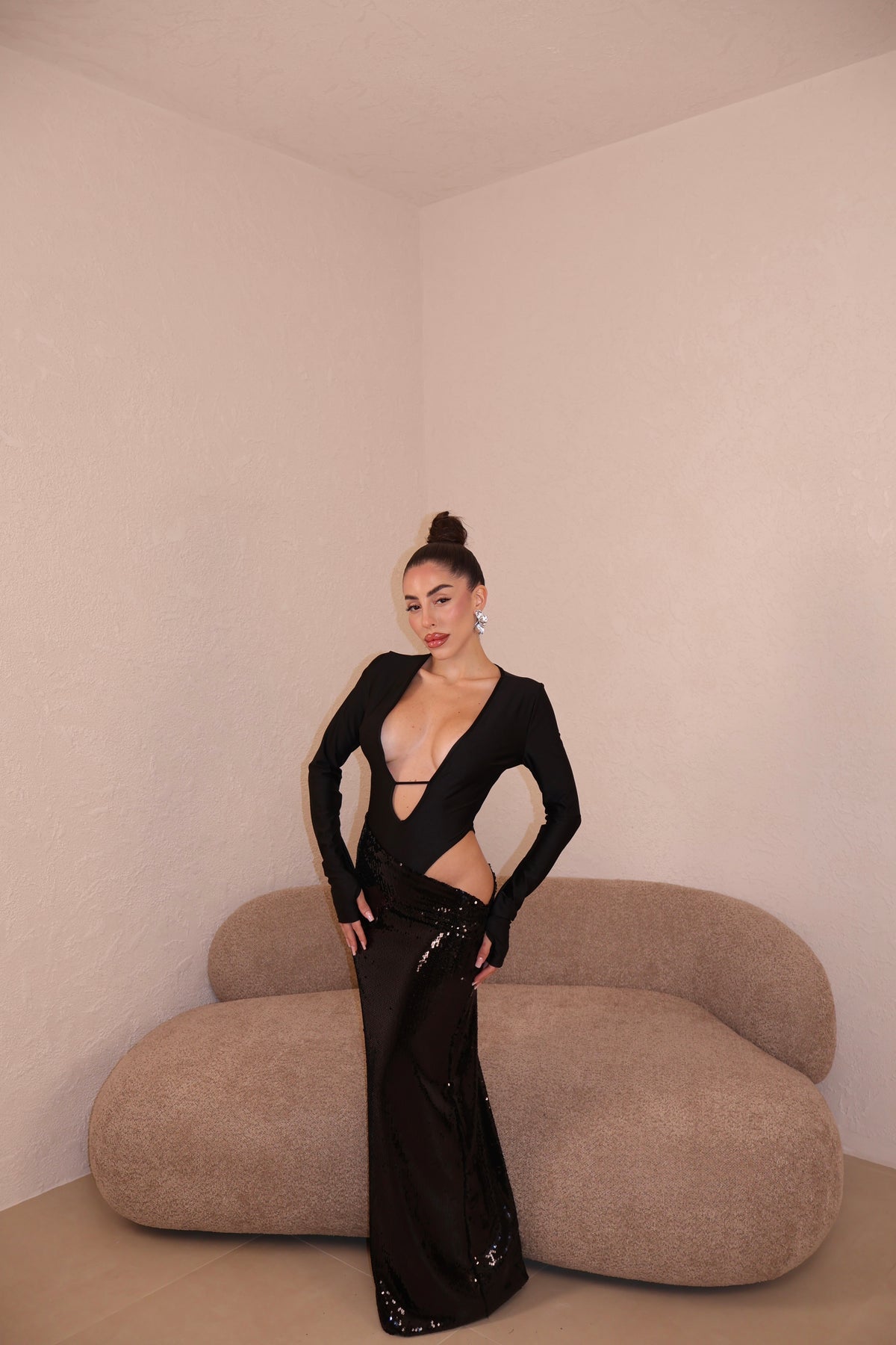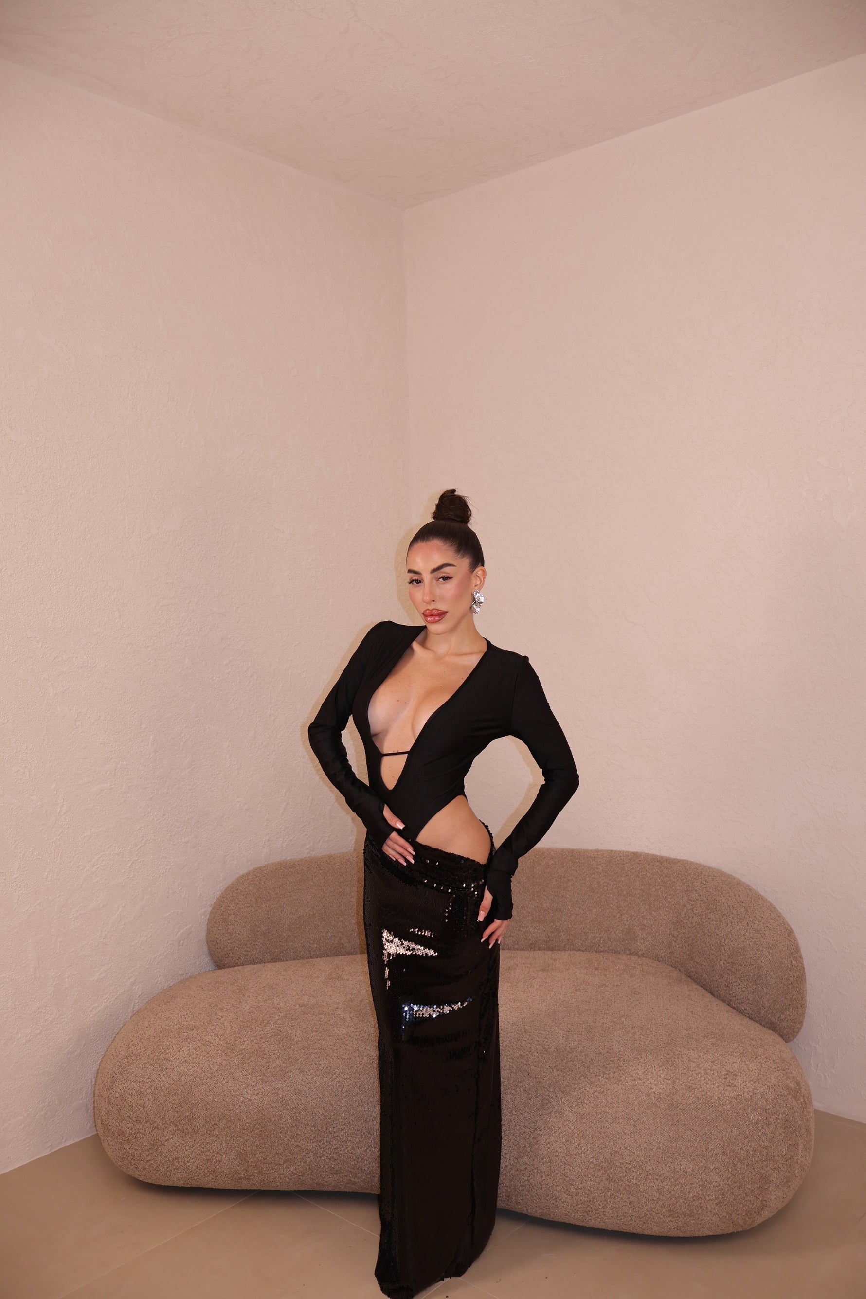 Abito lungo composto da body e gonna in paillettes uniti. Taglia unica.