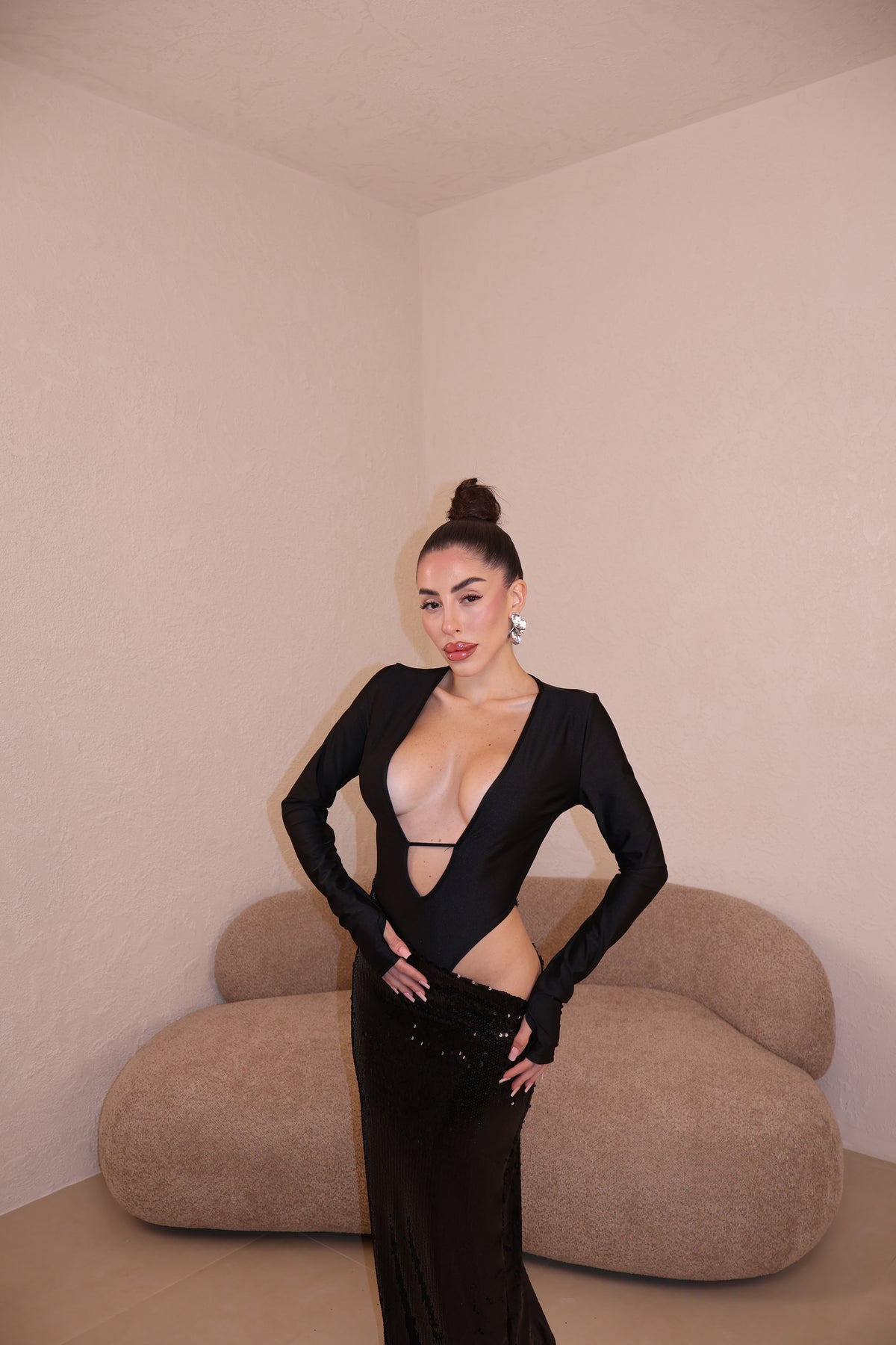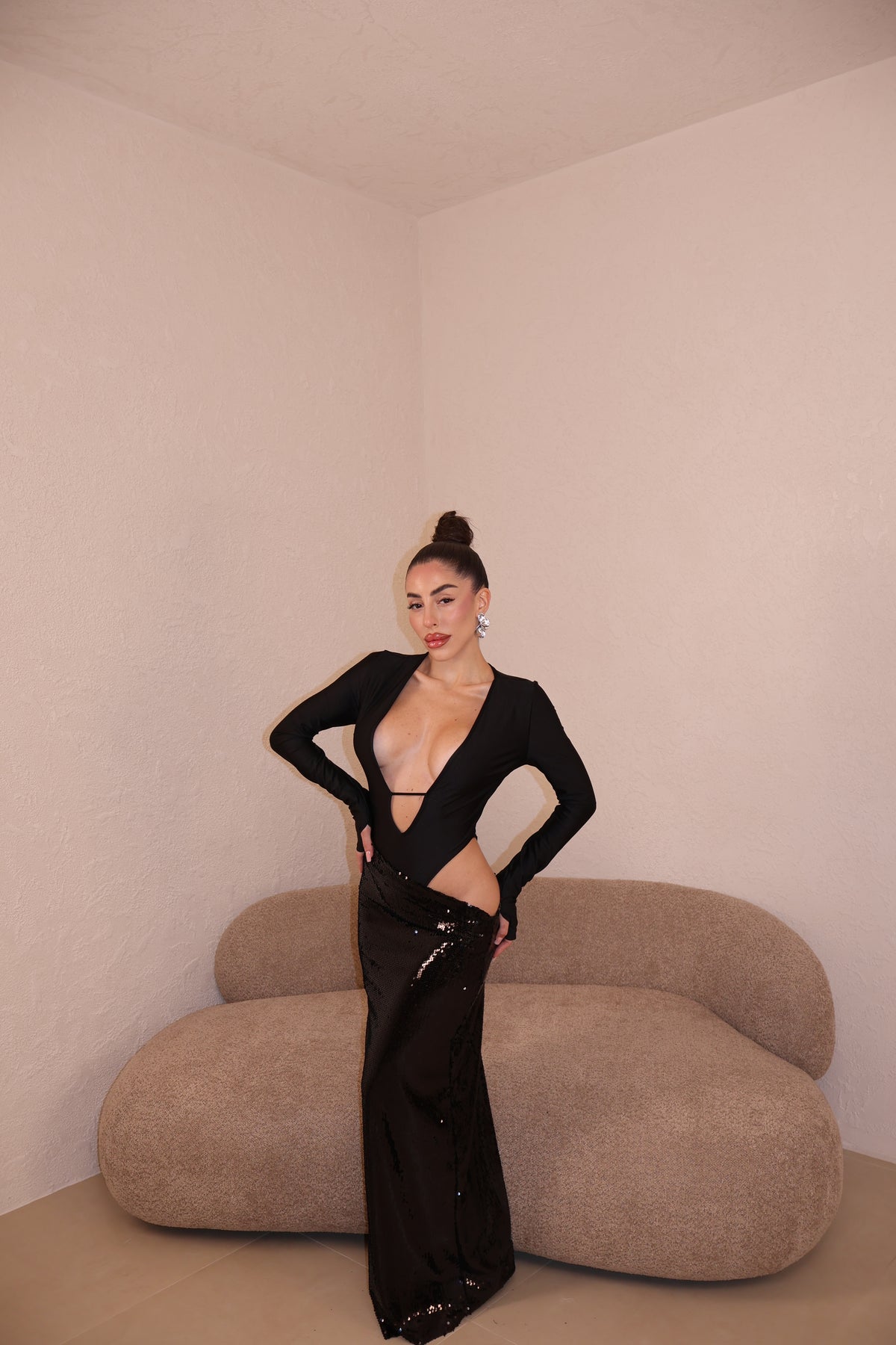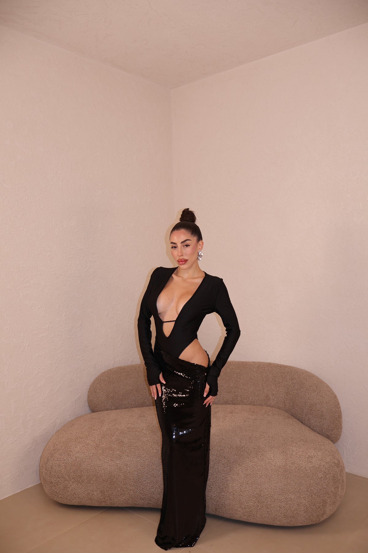 Abito lungo composto da body e gonna in paillettes uniti. Taglia unica.