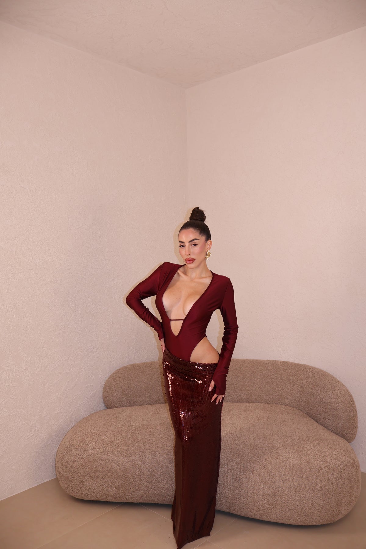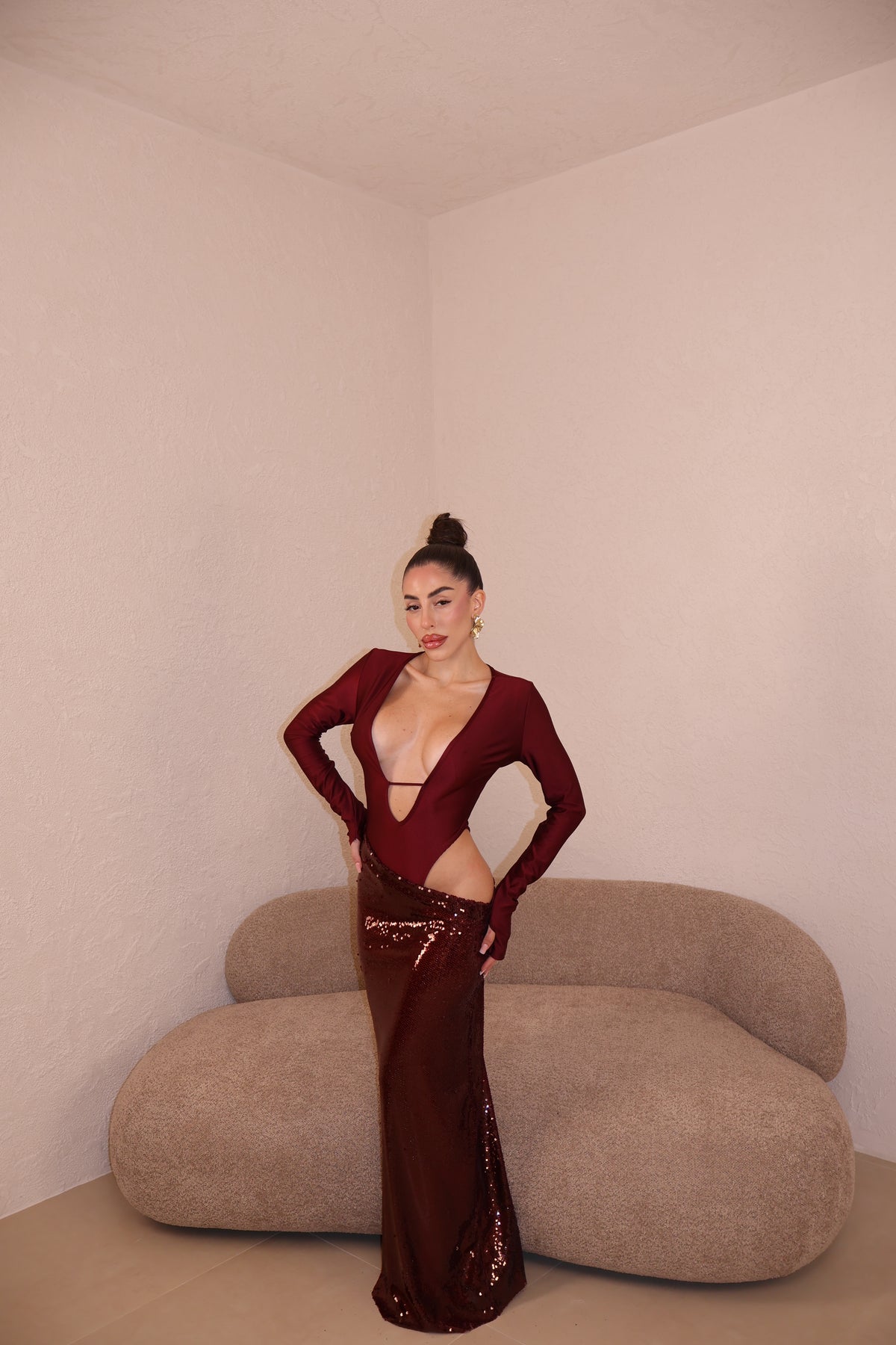 Abito lungo composto da body e gonna in paillettes uniti. Taglia unica.