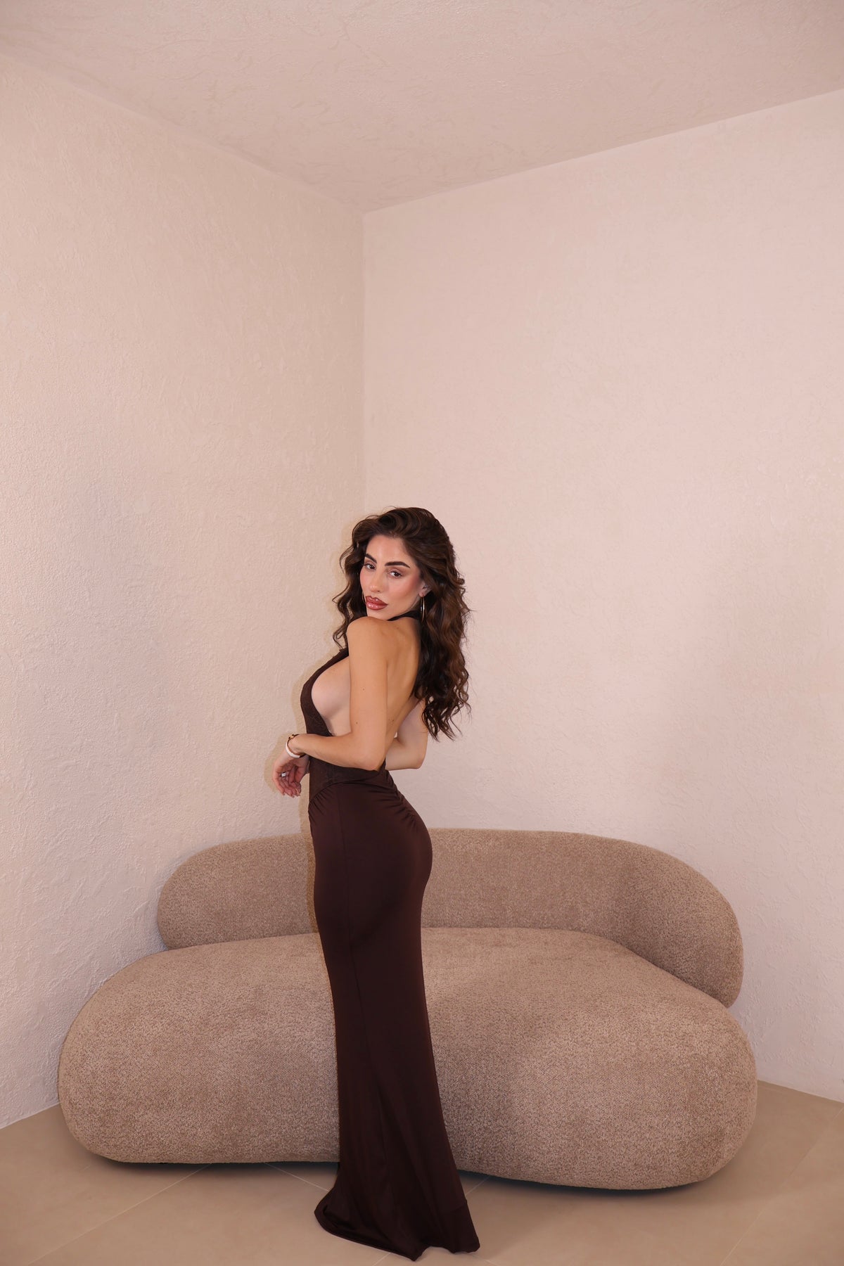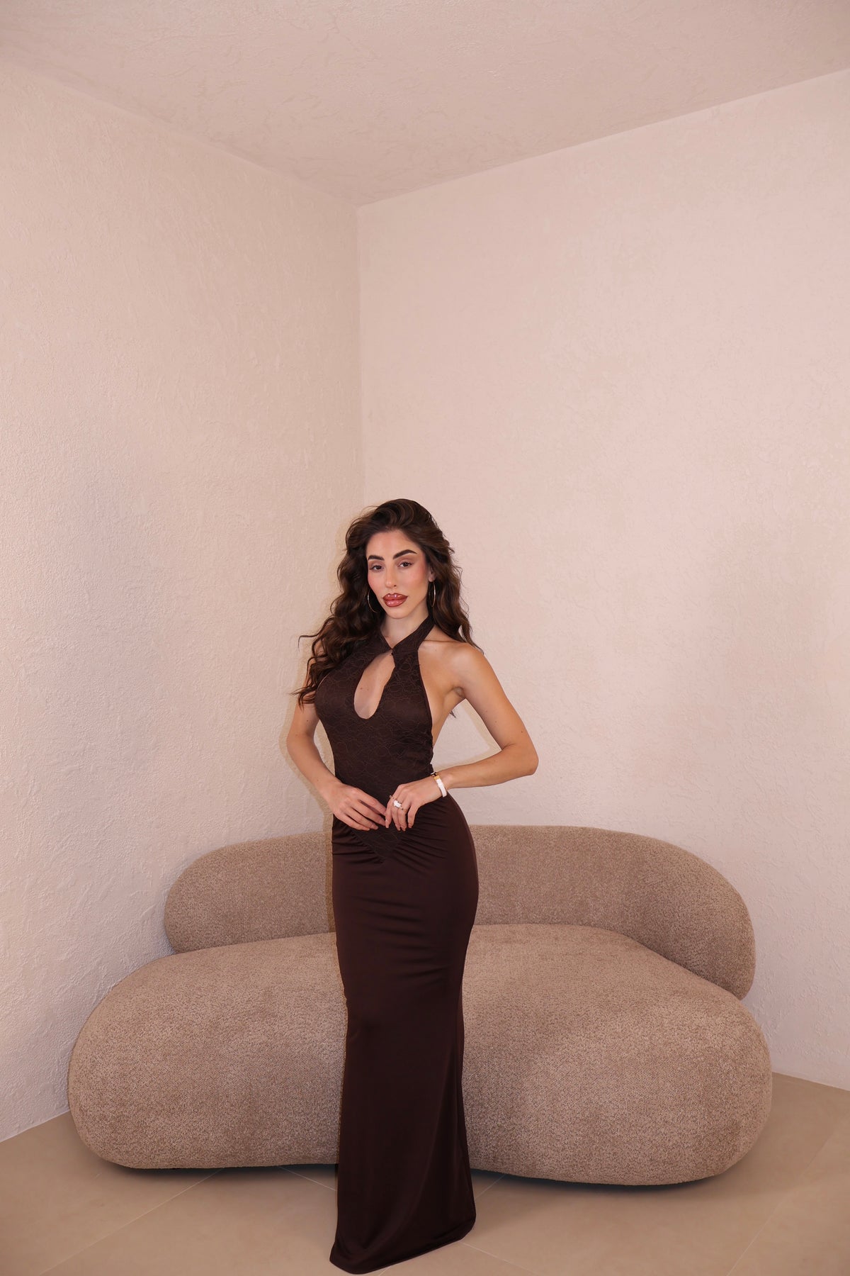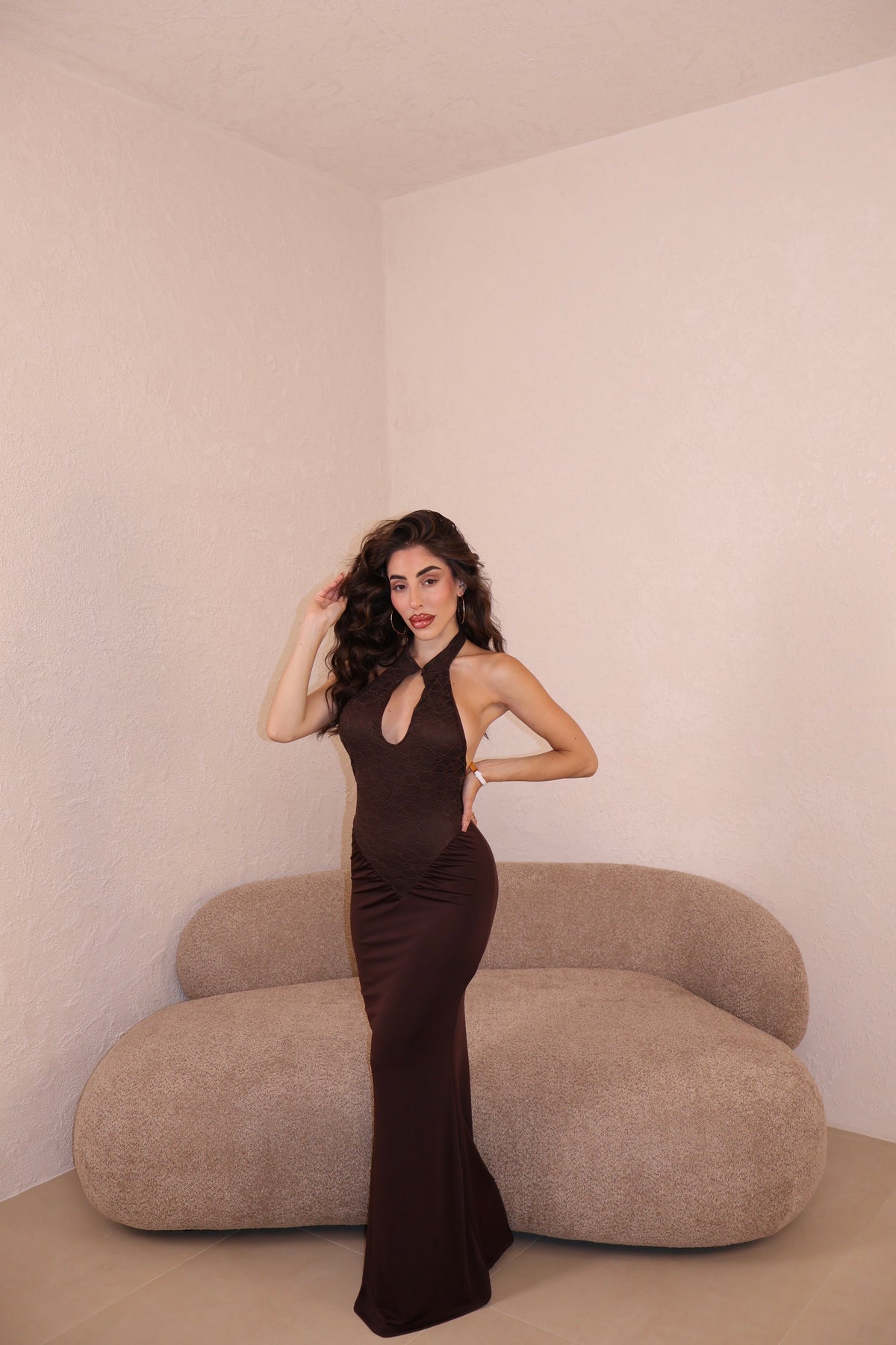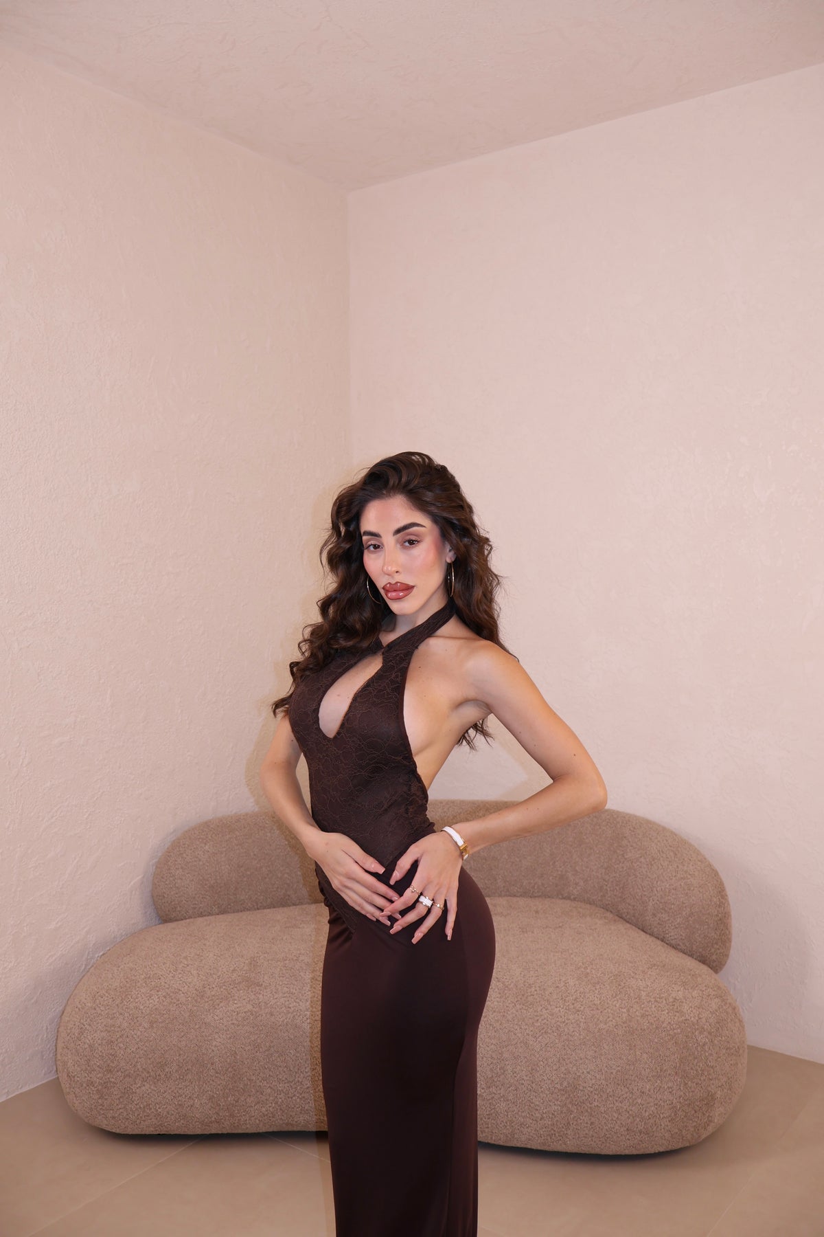 Abito lungo combinato in pizzo e licra. Apertura frontale. Taglia unica.