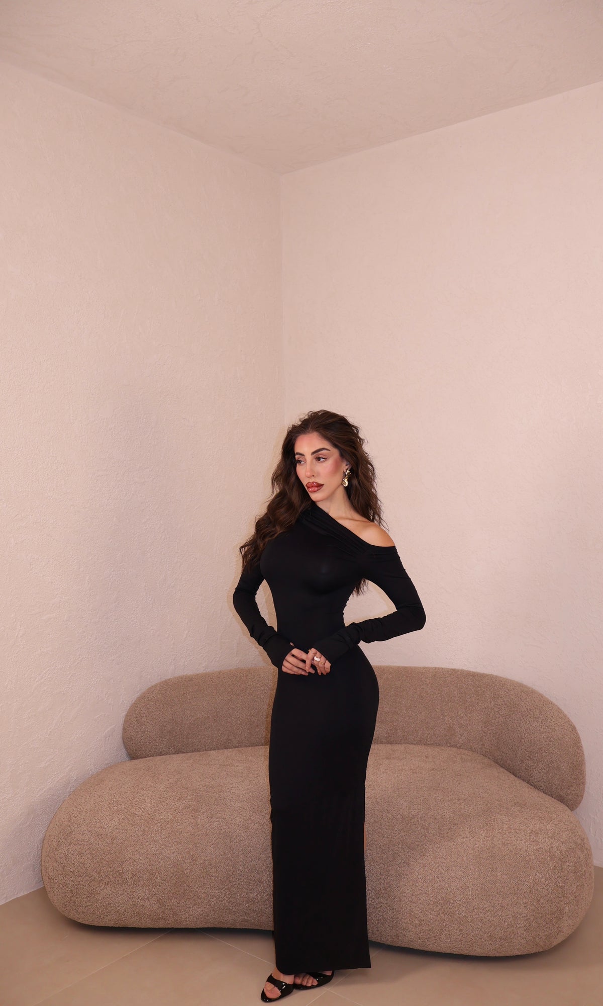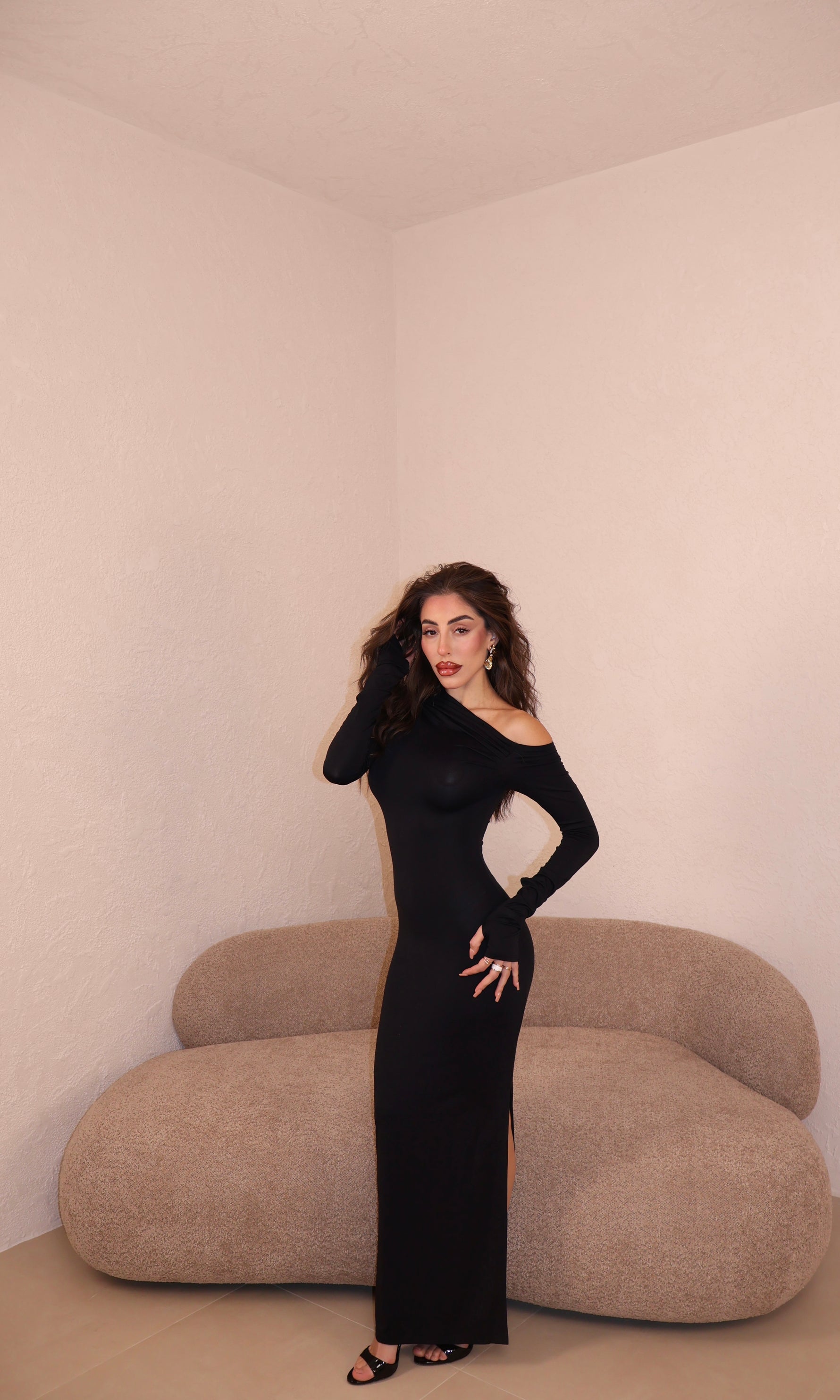 Abito in licra monospalla con maniche a guanto. Taglia unica.