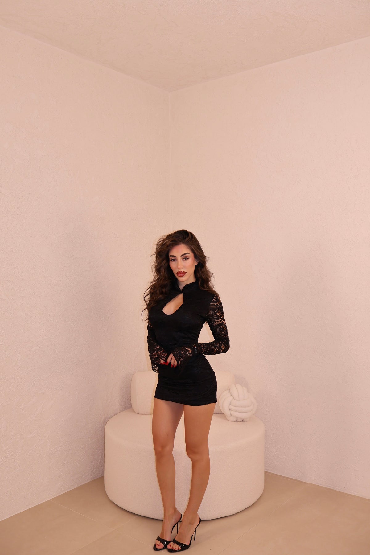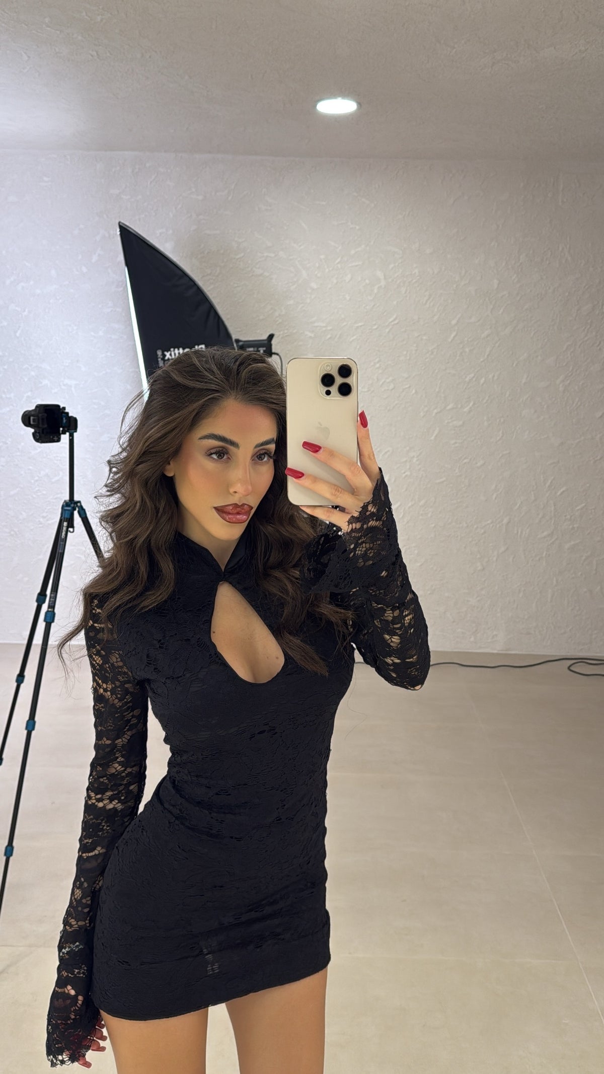 Abito corto in pizzo con apertura frontale e maniche a campana. Taglia unica.
