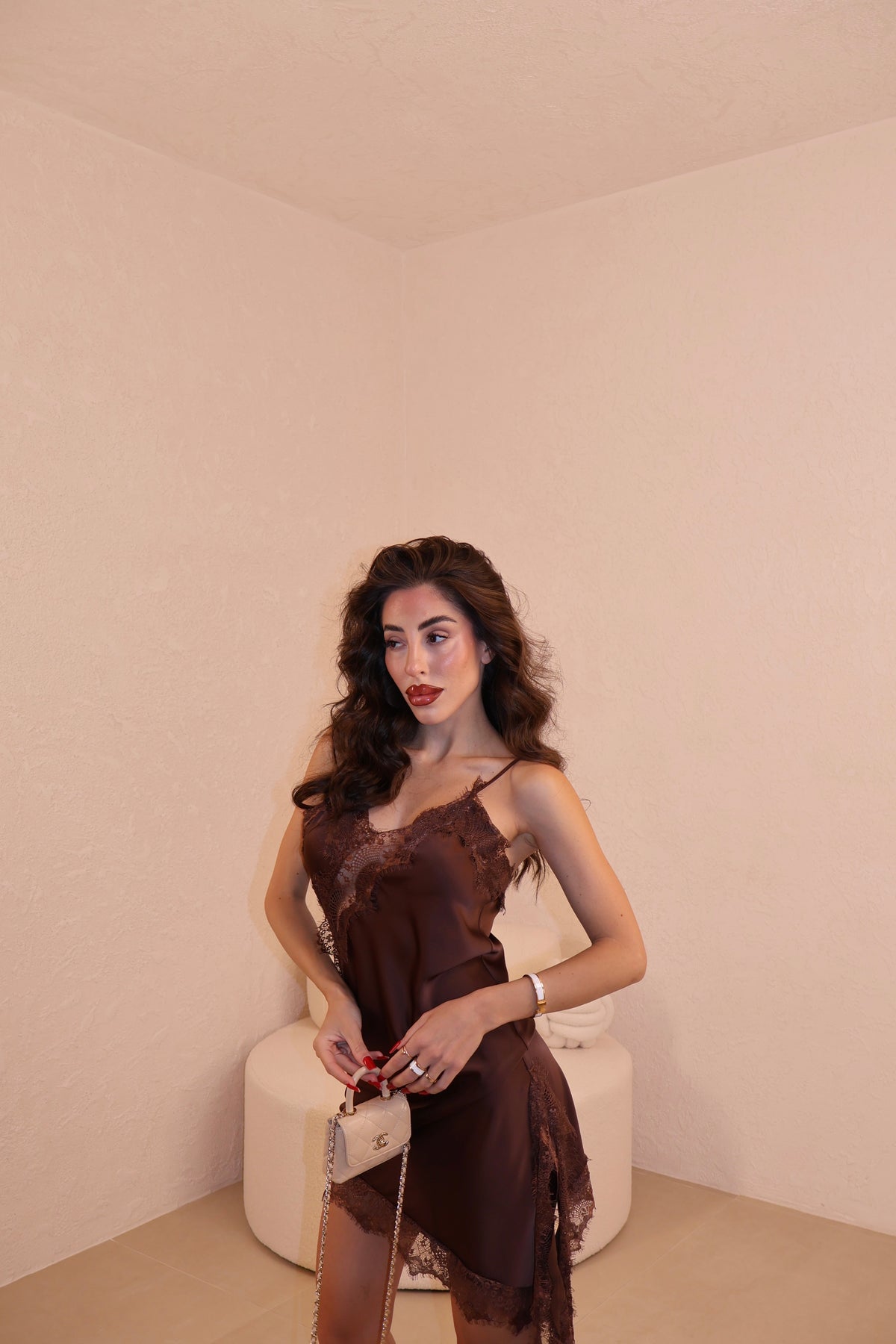 Abito corto in raso con dettagli in pizzo e spacco laterale. Taglia unica.