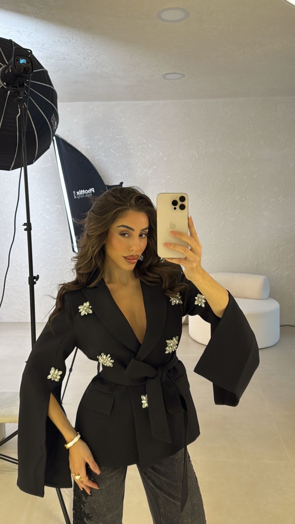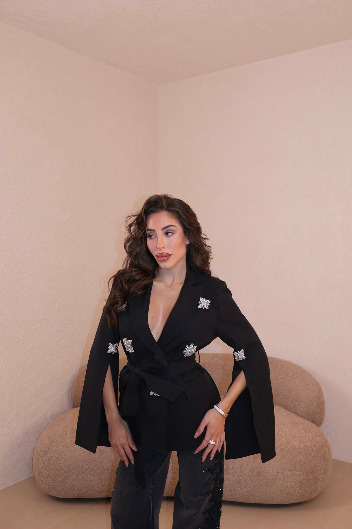 Blazer con dettagli gioielli, cintura in vita e maniche con aperture laterali. Spalline imbottite. La modella indossa taglia S.