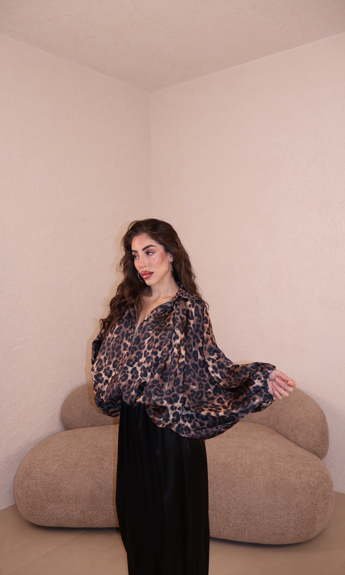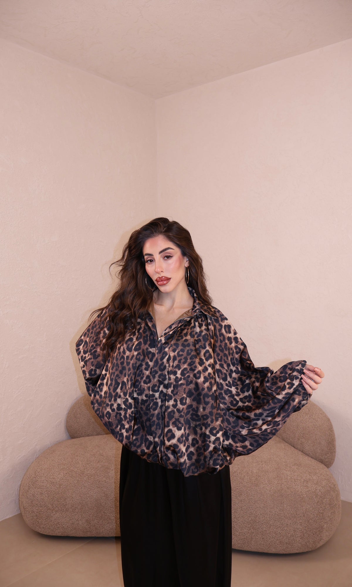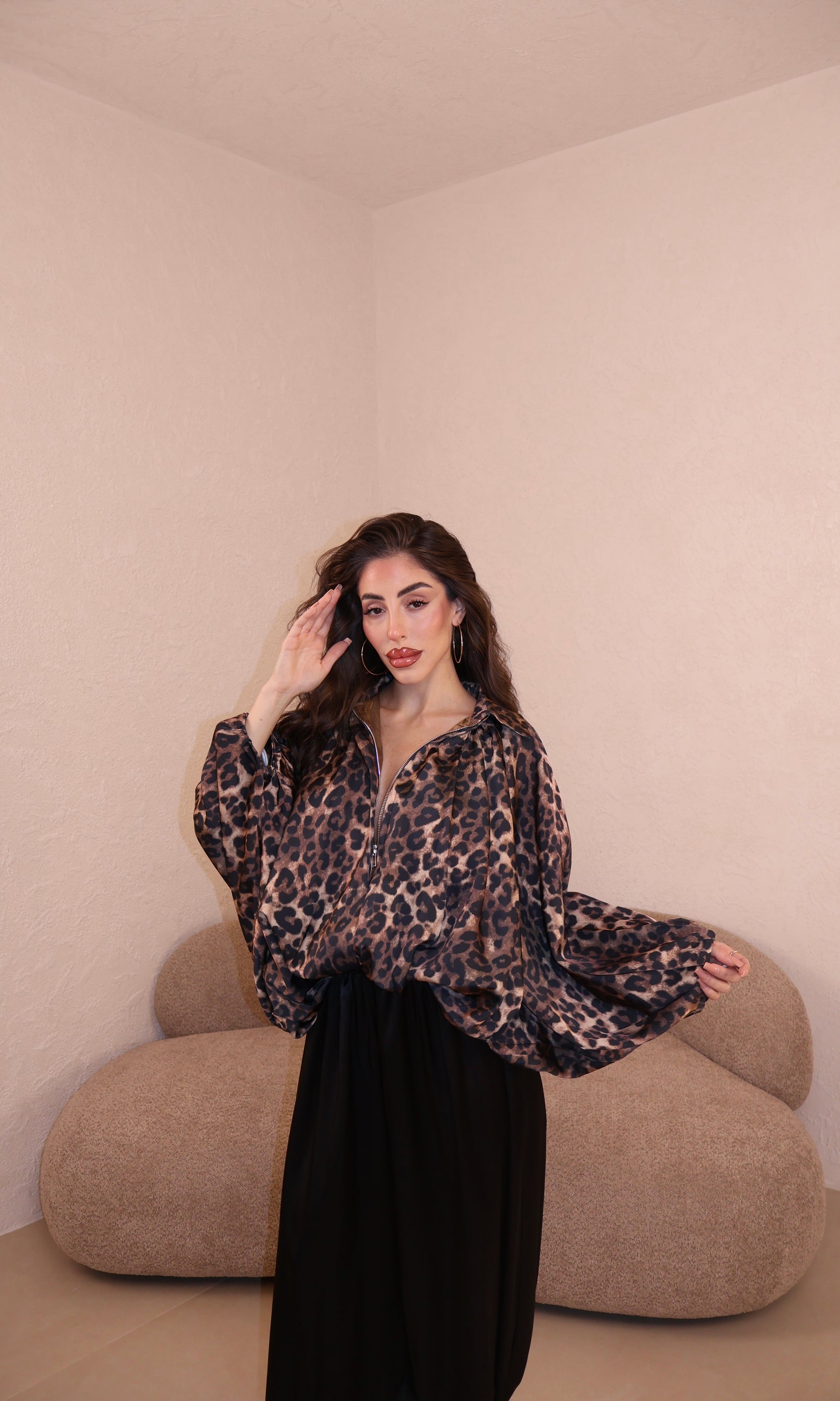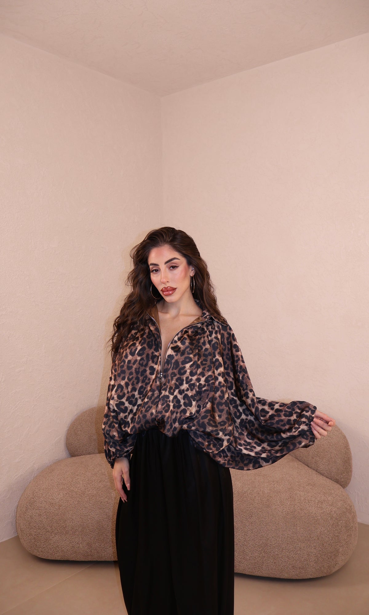 Bomber leopardato in raso con cerniera. Taglia unica.