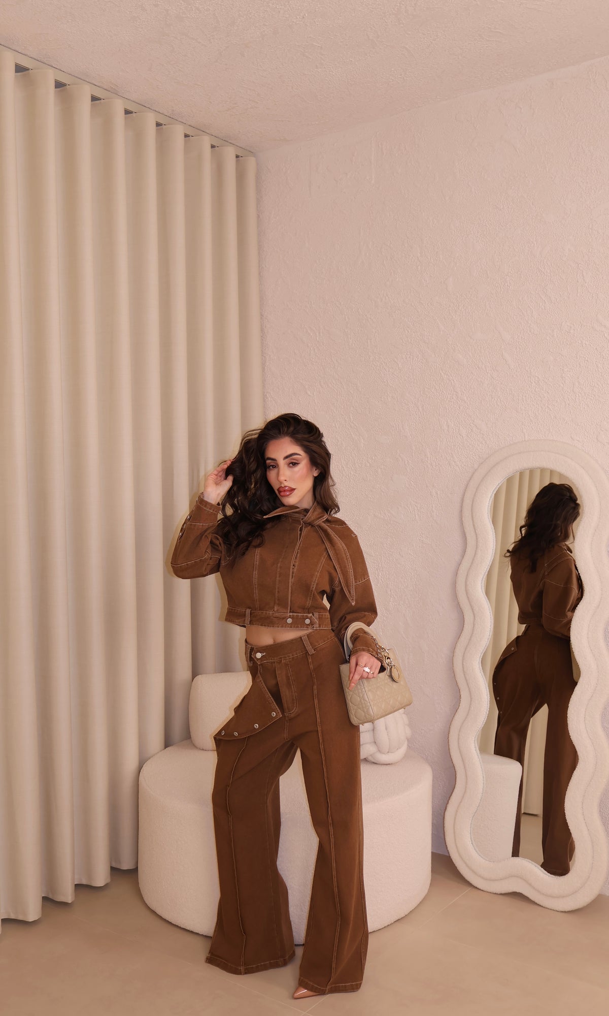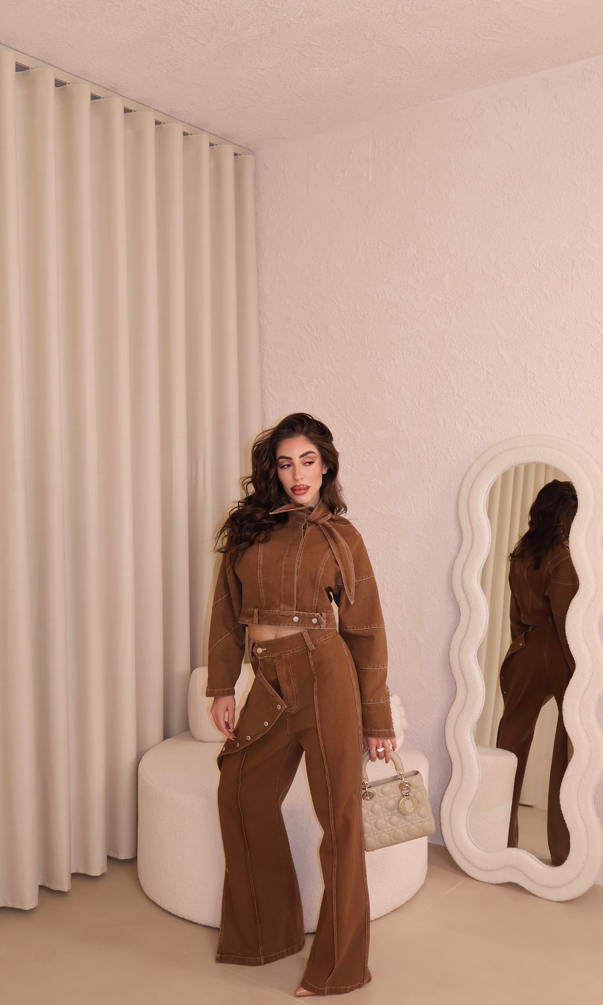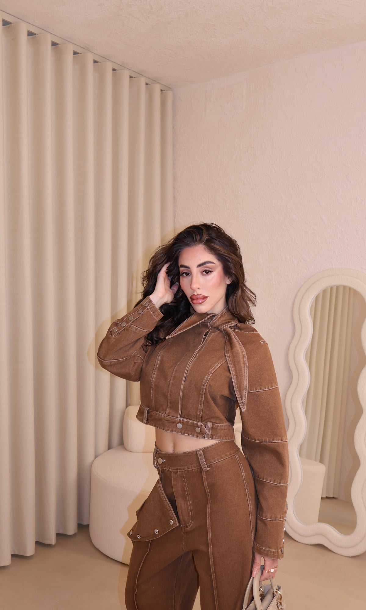 Coordinato in denim composto da jeans con bottoni laterali e giacca corta con fiocco. La modella indossa taglia S/M