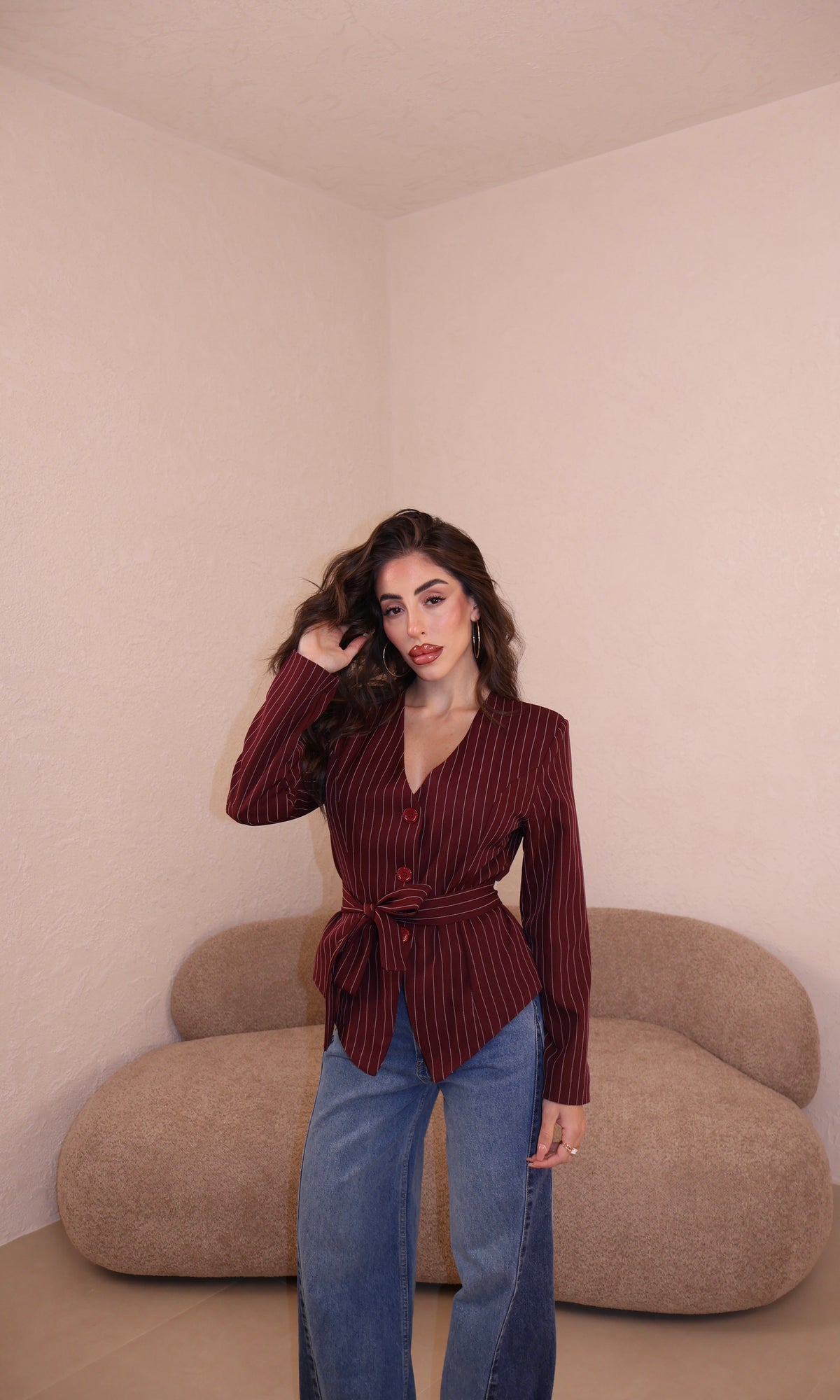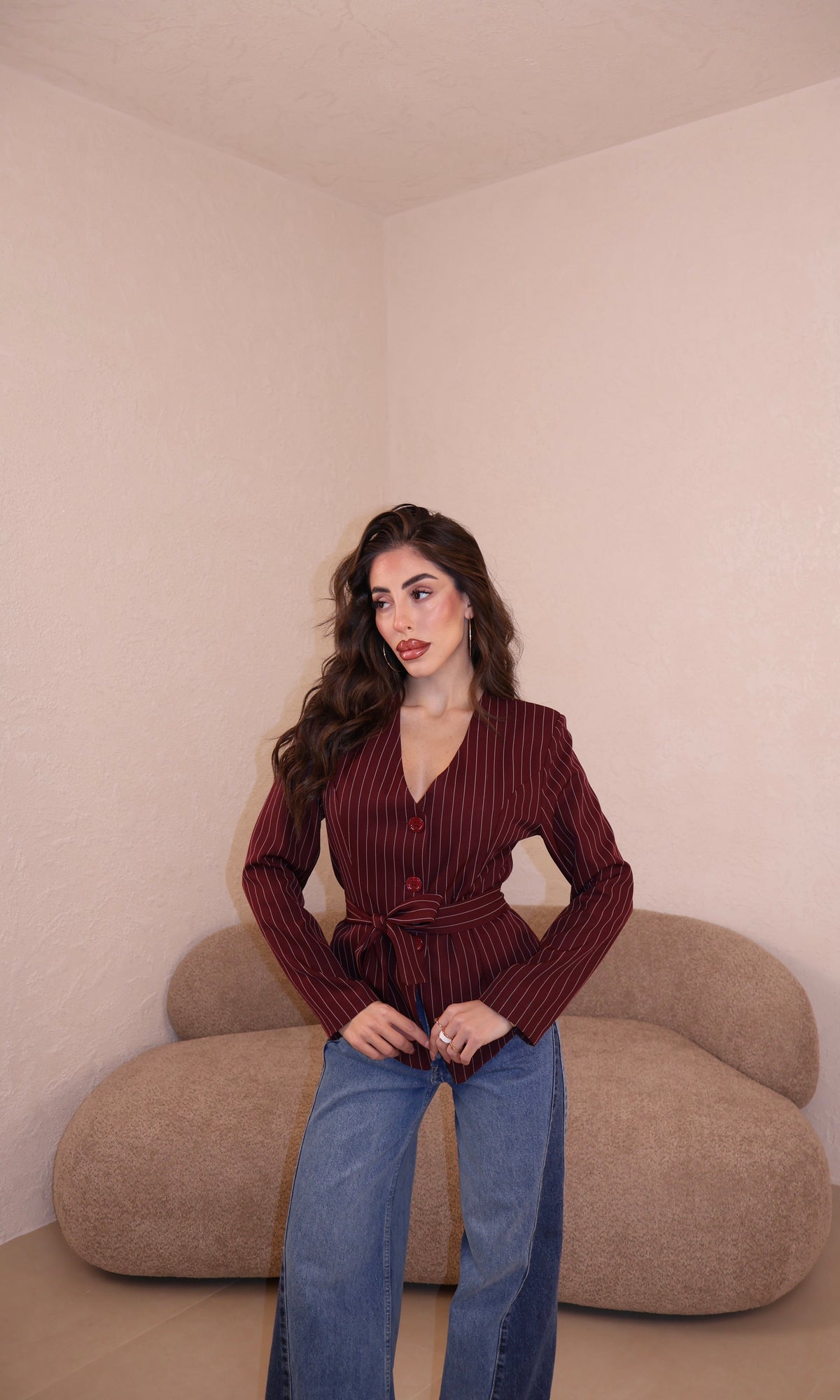 Prezzo unitario / perGiacca gessata con cintura in vita e spalline imbottite.