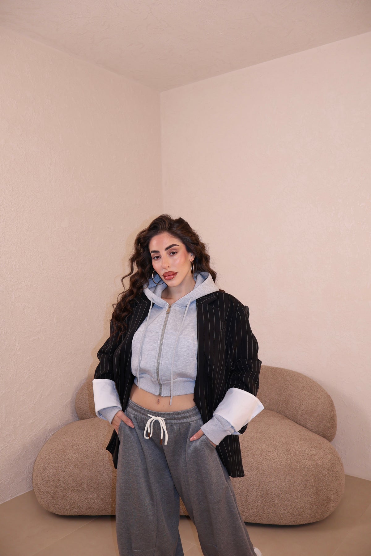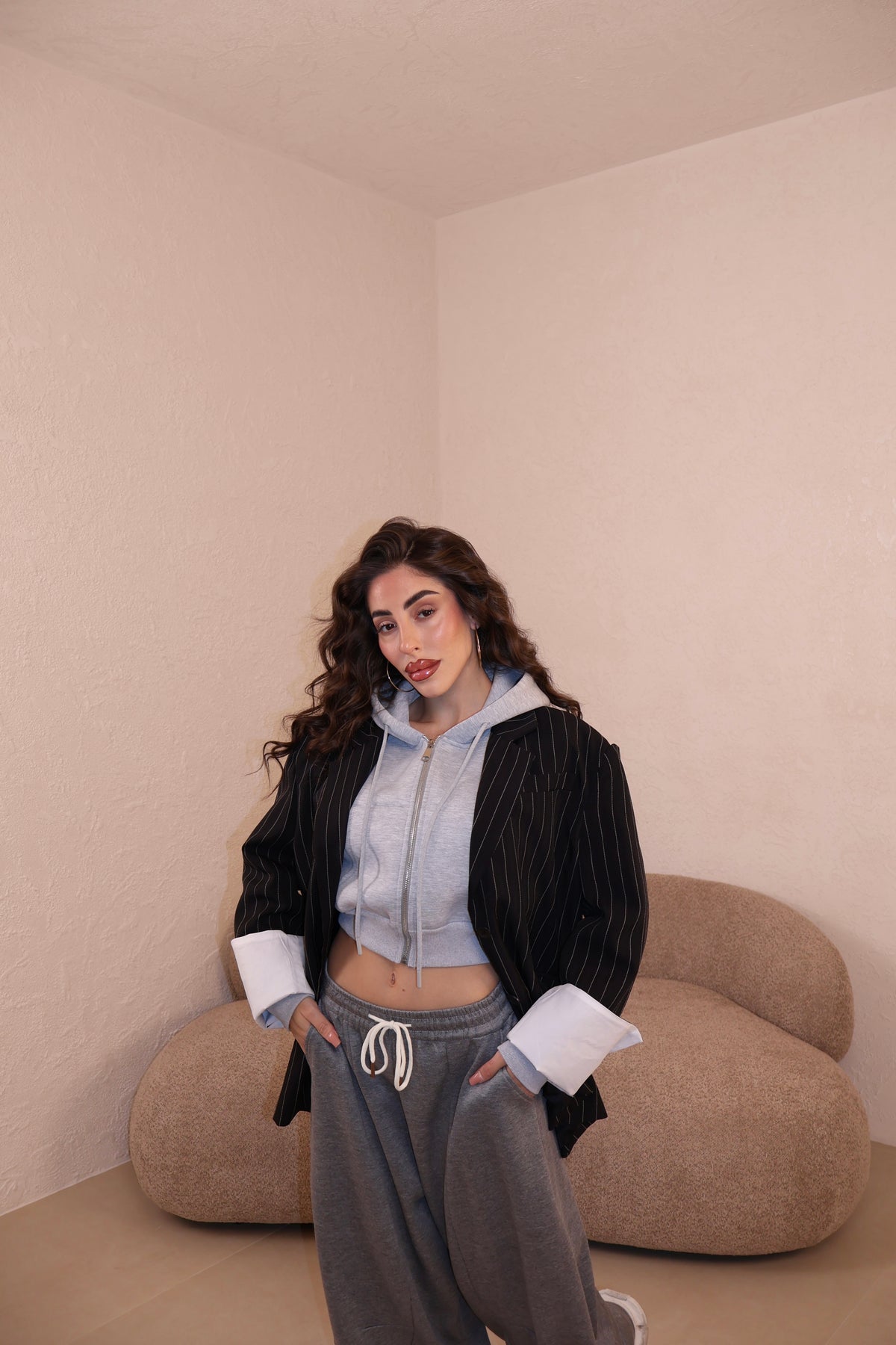 Giacca modello over gessata con dettaglioi risvolti alle maniche. Taglia unica.