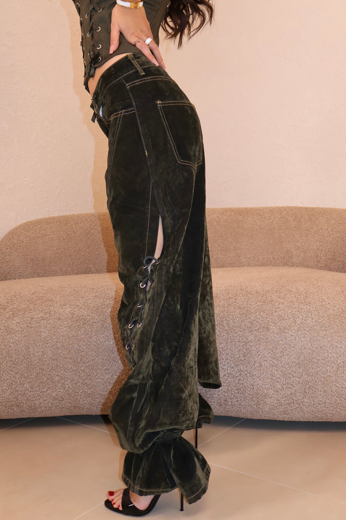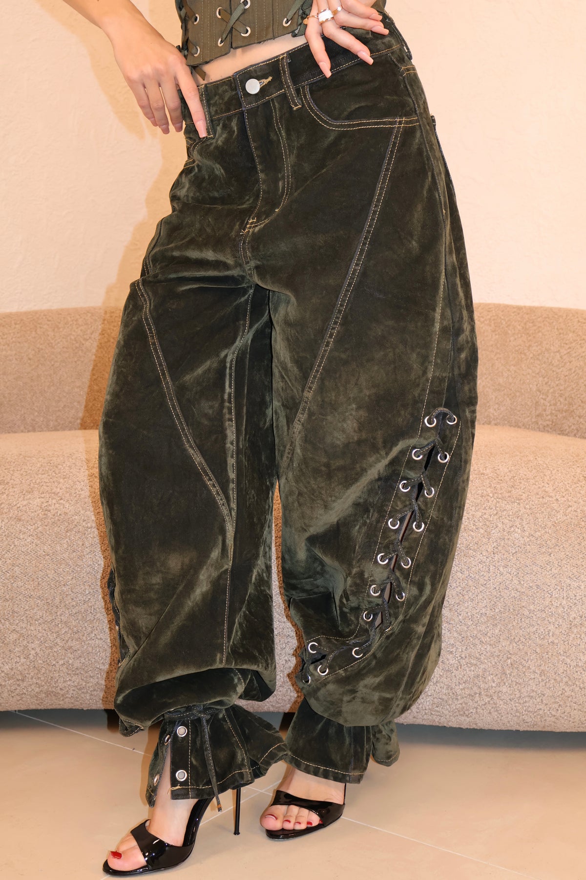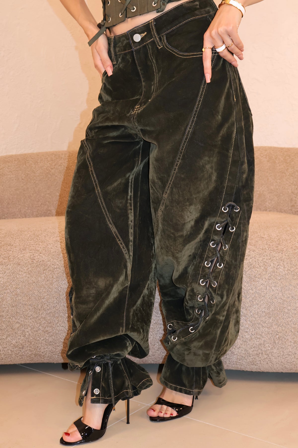 Prezzo unitario / perJeans vita bassa in ciniglia con stringhe. Vestibilità regolare. La modella indossa taglia S.