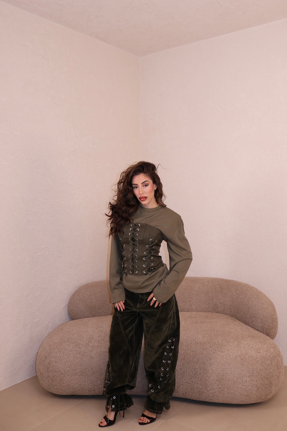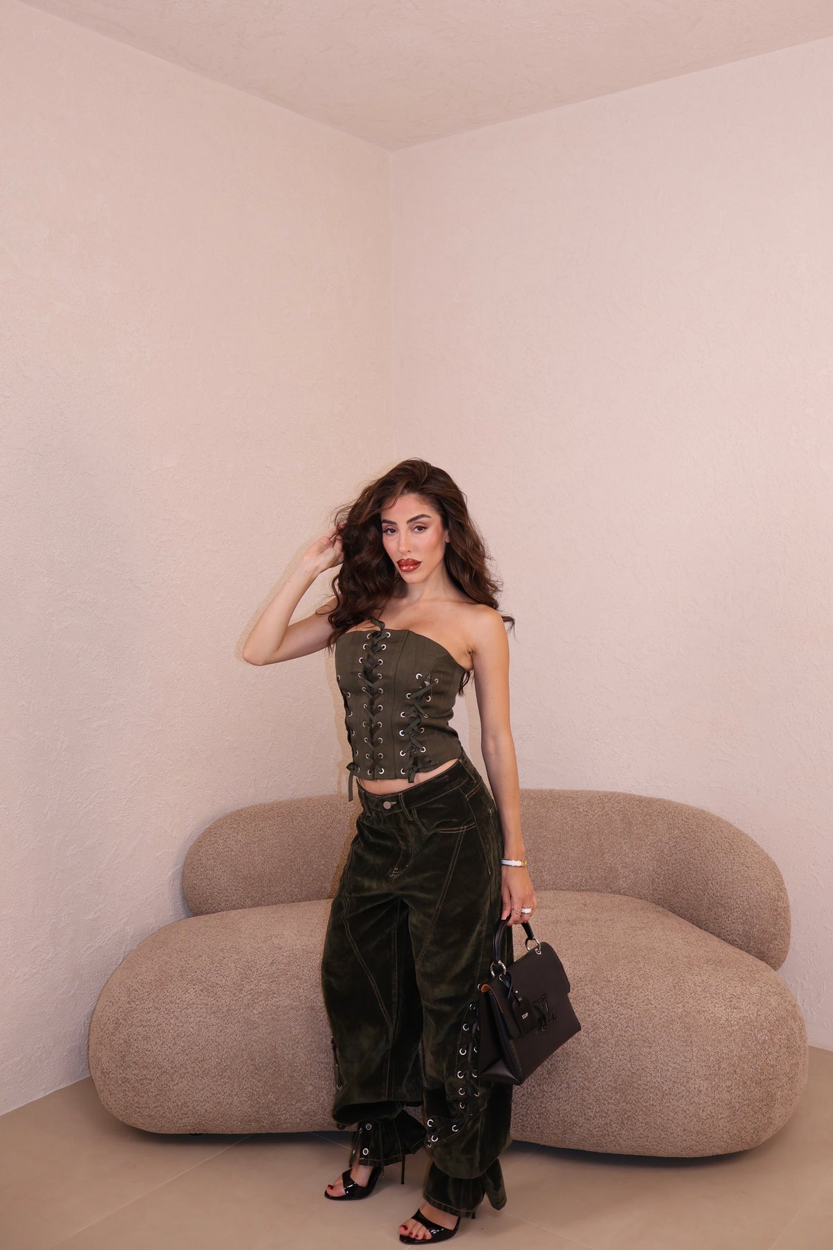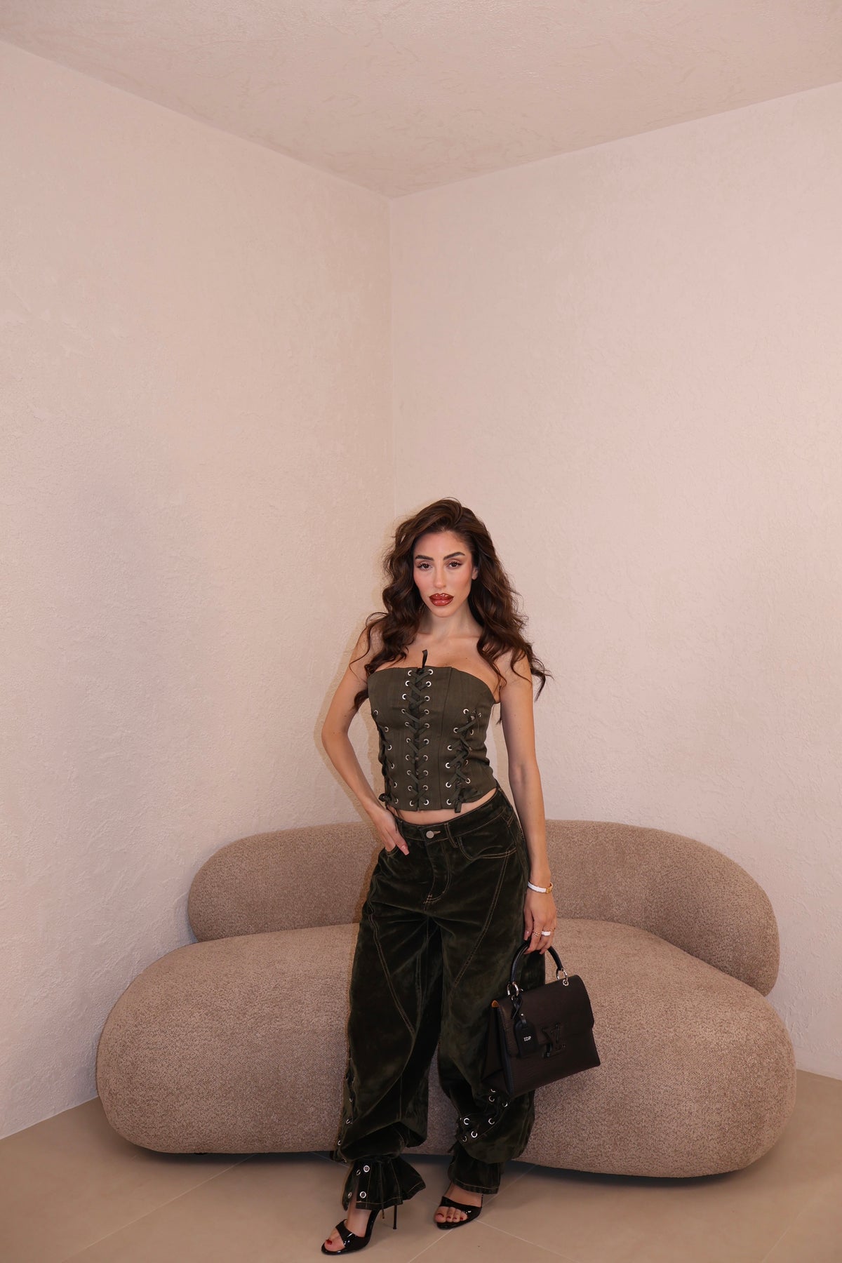 Prezzo unitario / perJeans vita bassa in ciniglia con stringhe. Vestibilità regolare. La modella indossa taglia S.