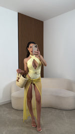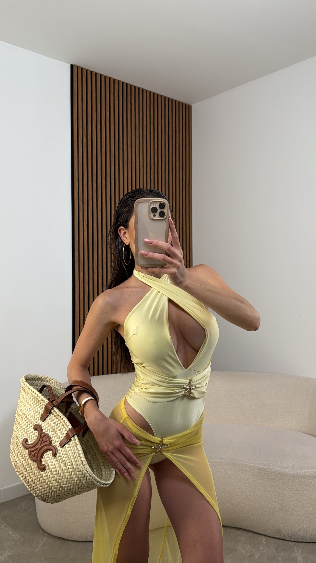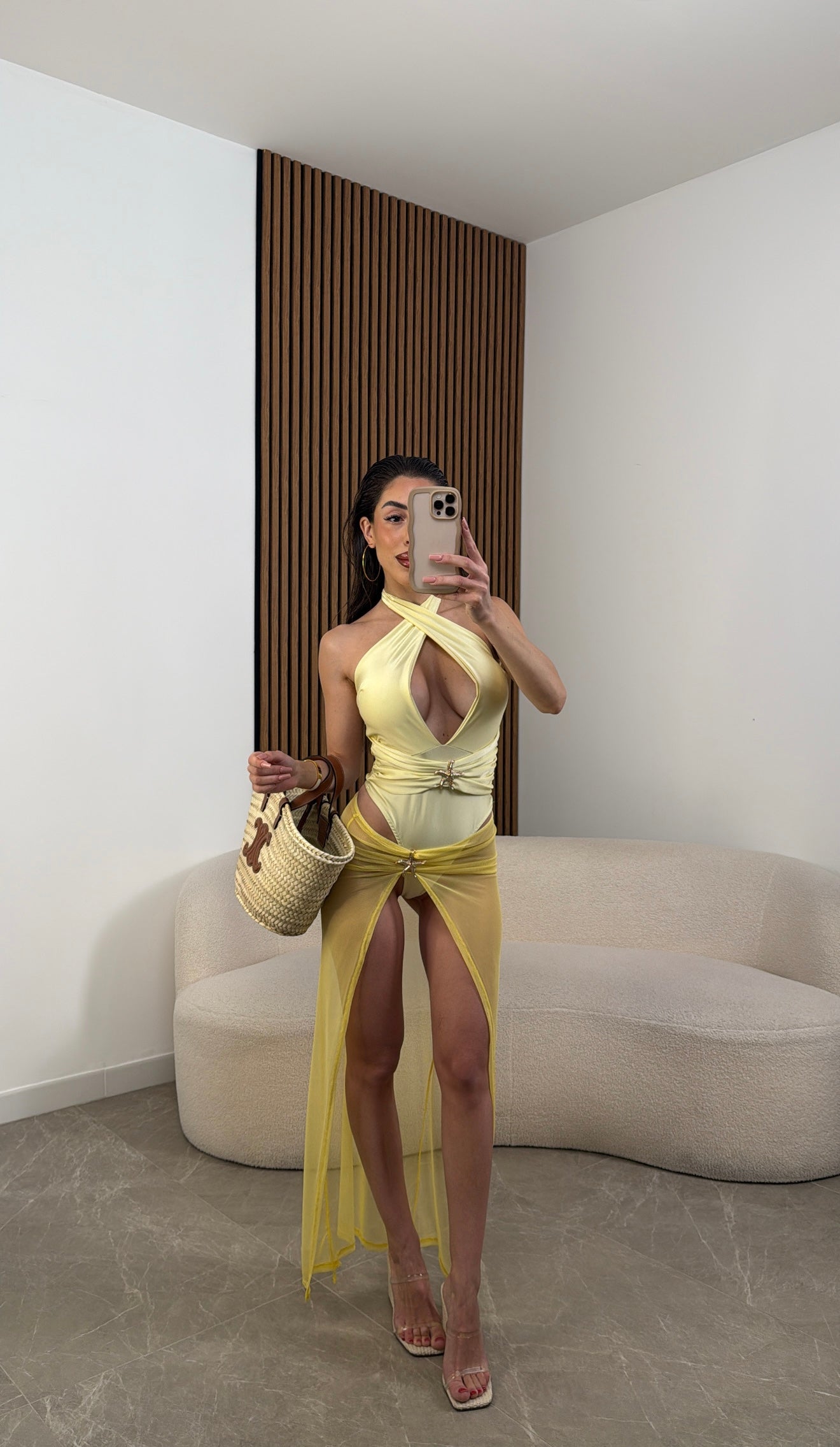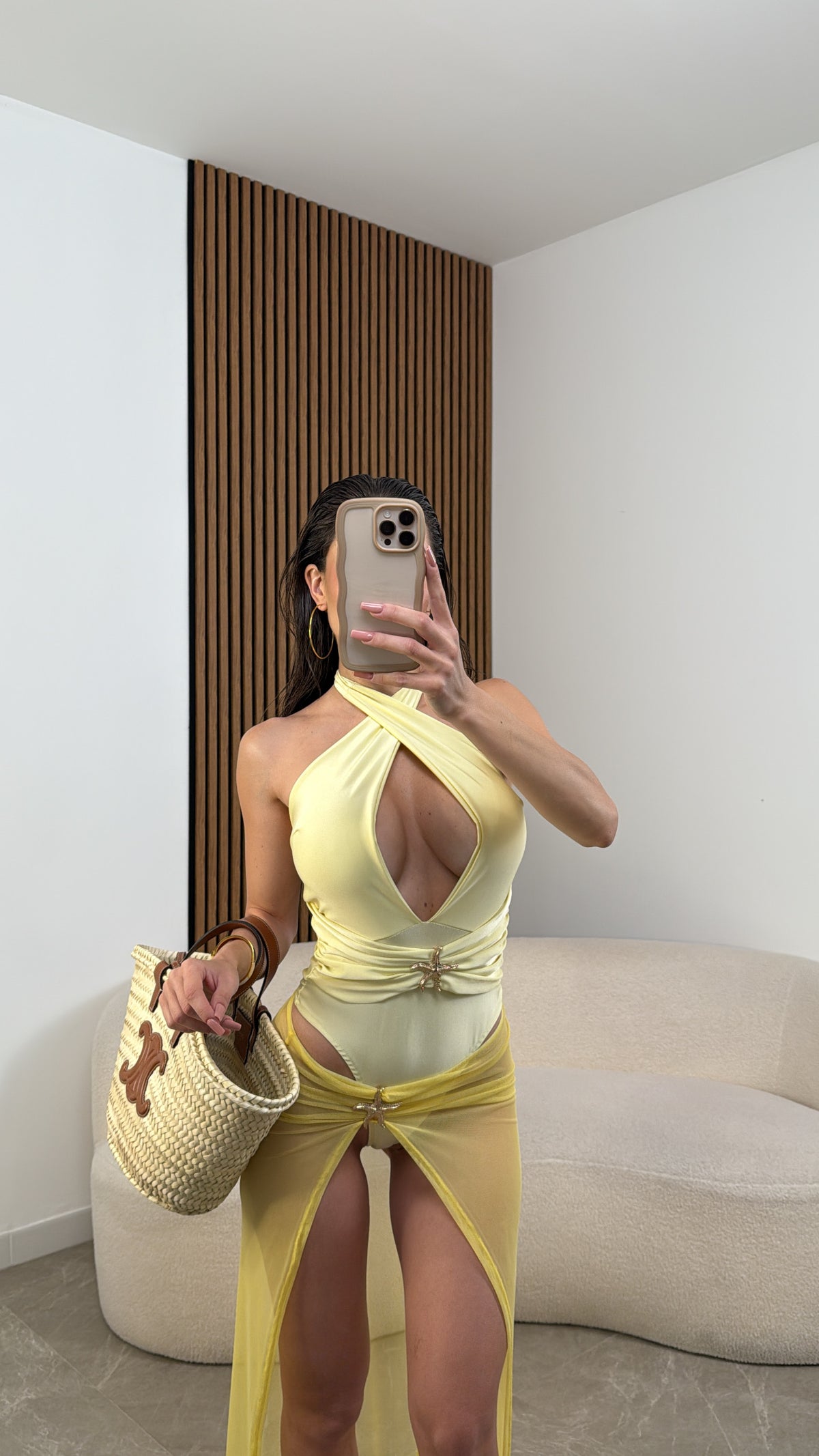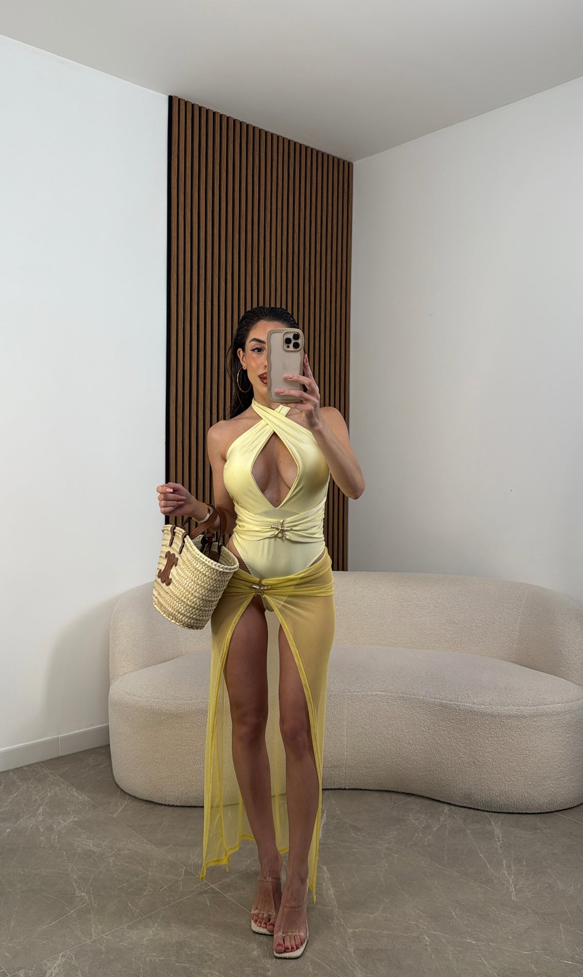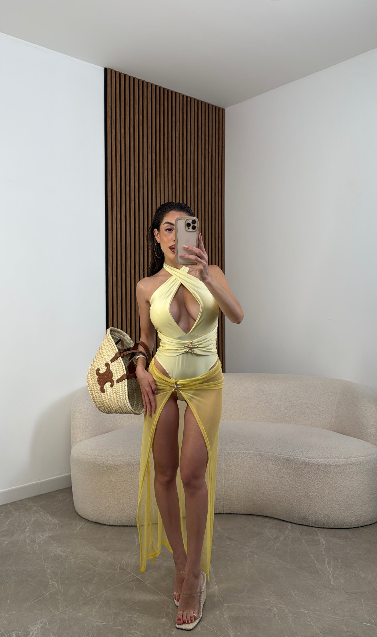 Set composto da intero con dettaglio gioiello e laccetti regolabili. Gonna inclusa. Taglia unica.