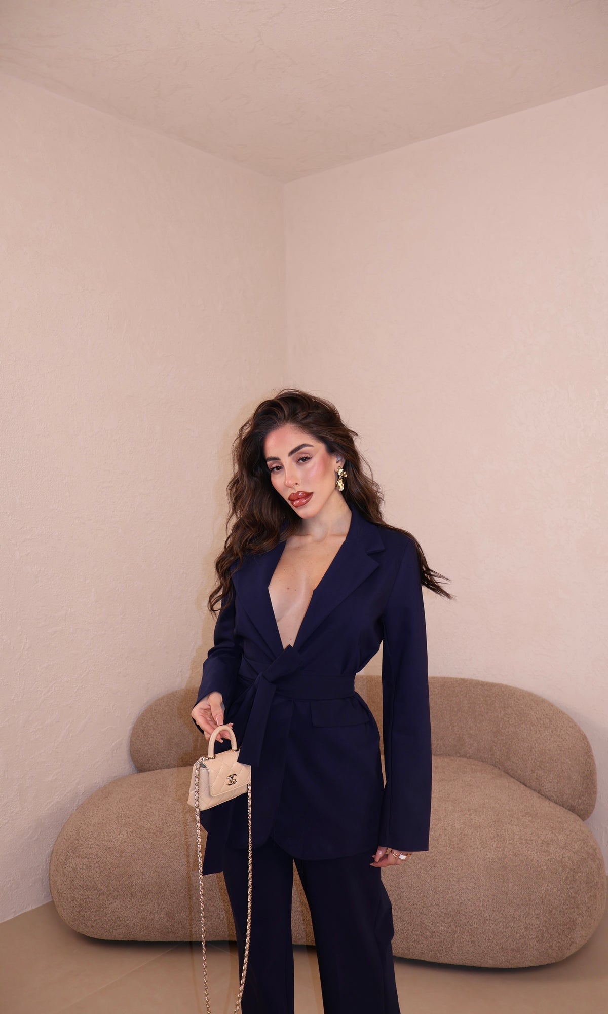 Tailleur composto da pantalone con elastico sul retro e bottone frontale, giacca con spalline leggermente imbottite e cintura in vita. Il tailleur veste fino ad una 46/48. Composizione: 95% Poliestere 5% Elastan.