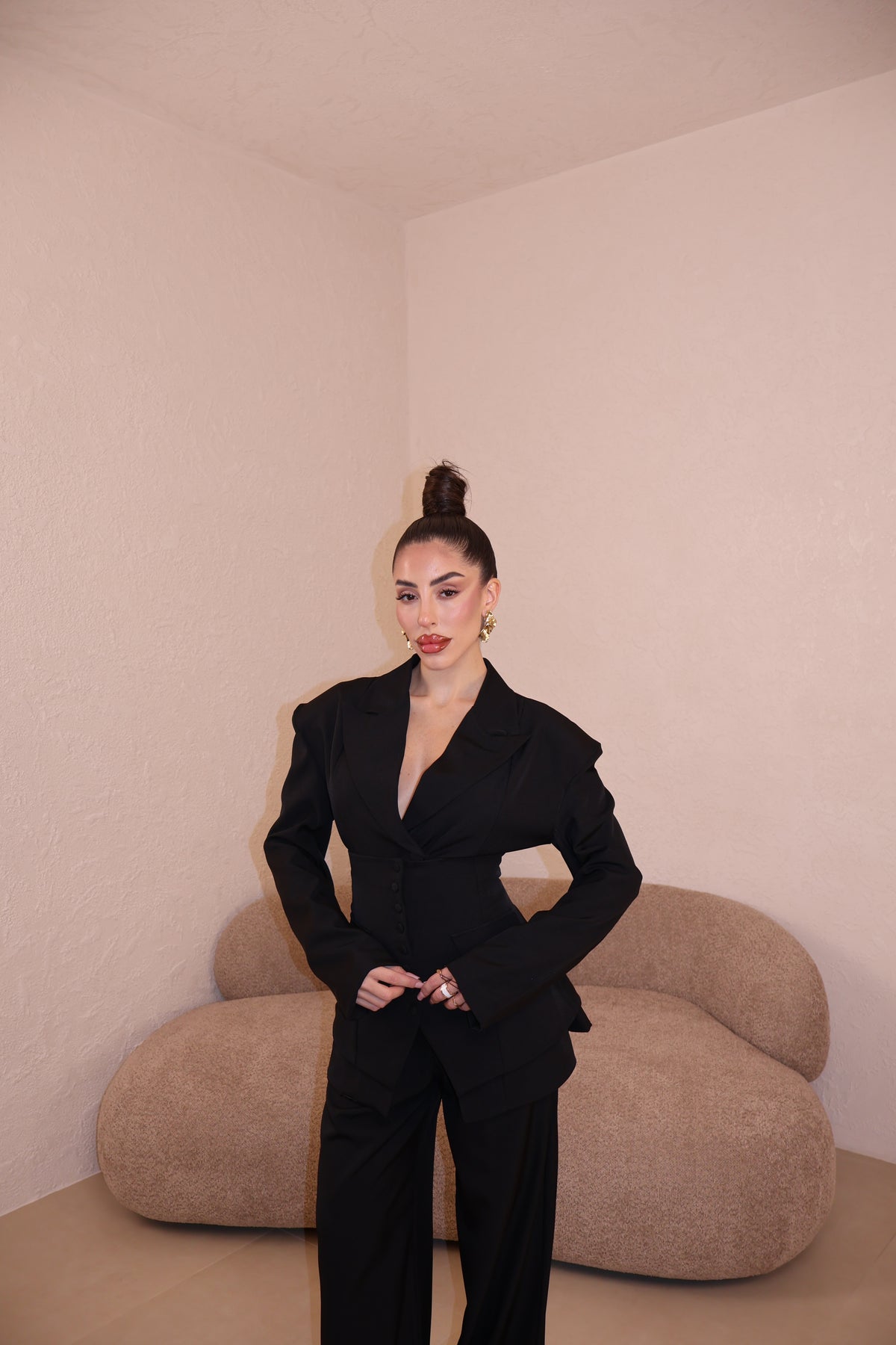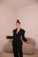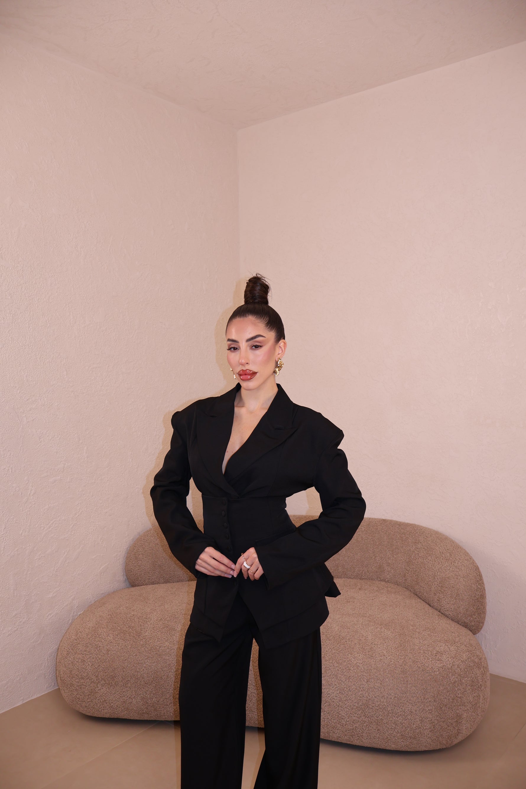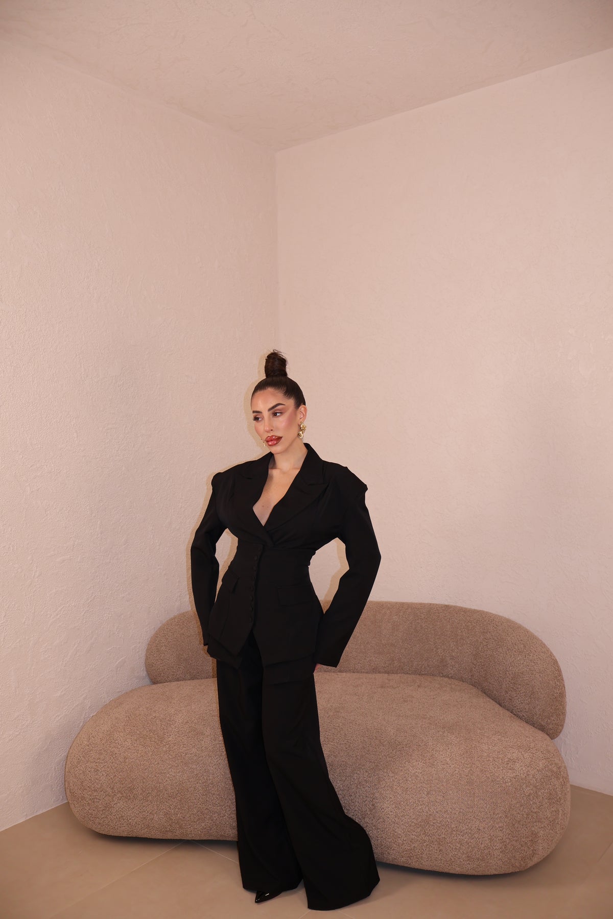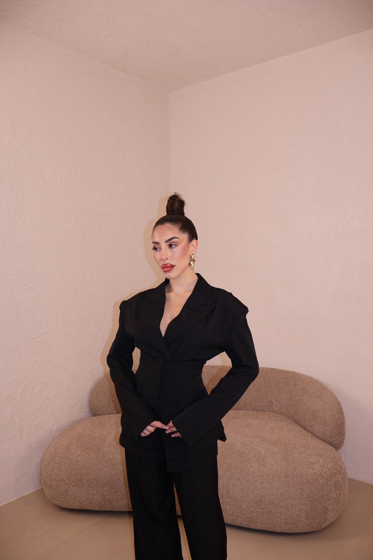 Tailleur composto da pantaloni con elastico sul retro e giacca con bustino in vita regolabile sul retro. Taglia unica.