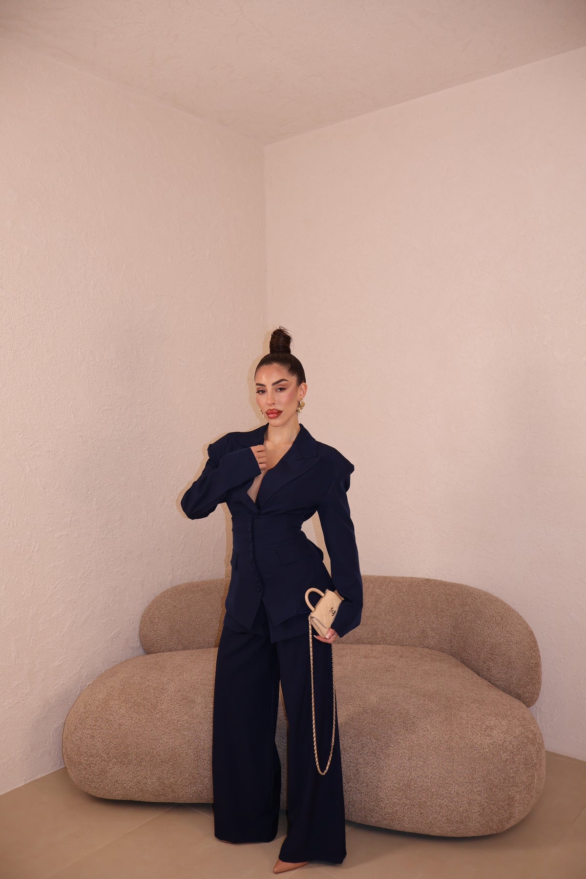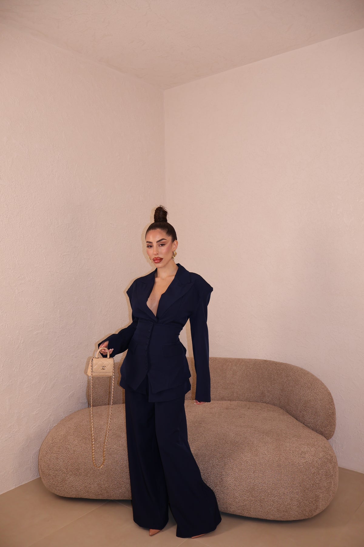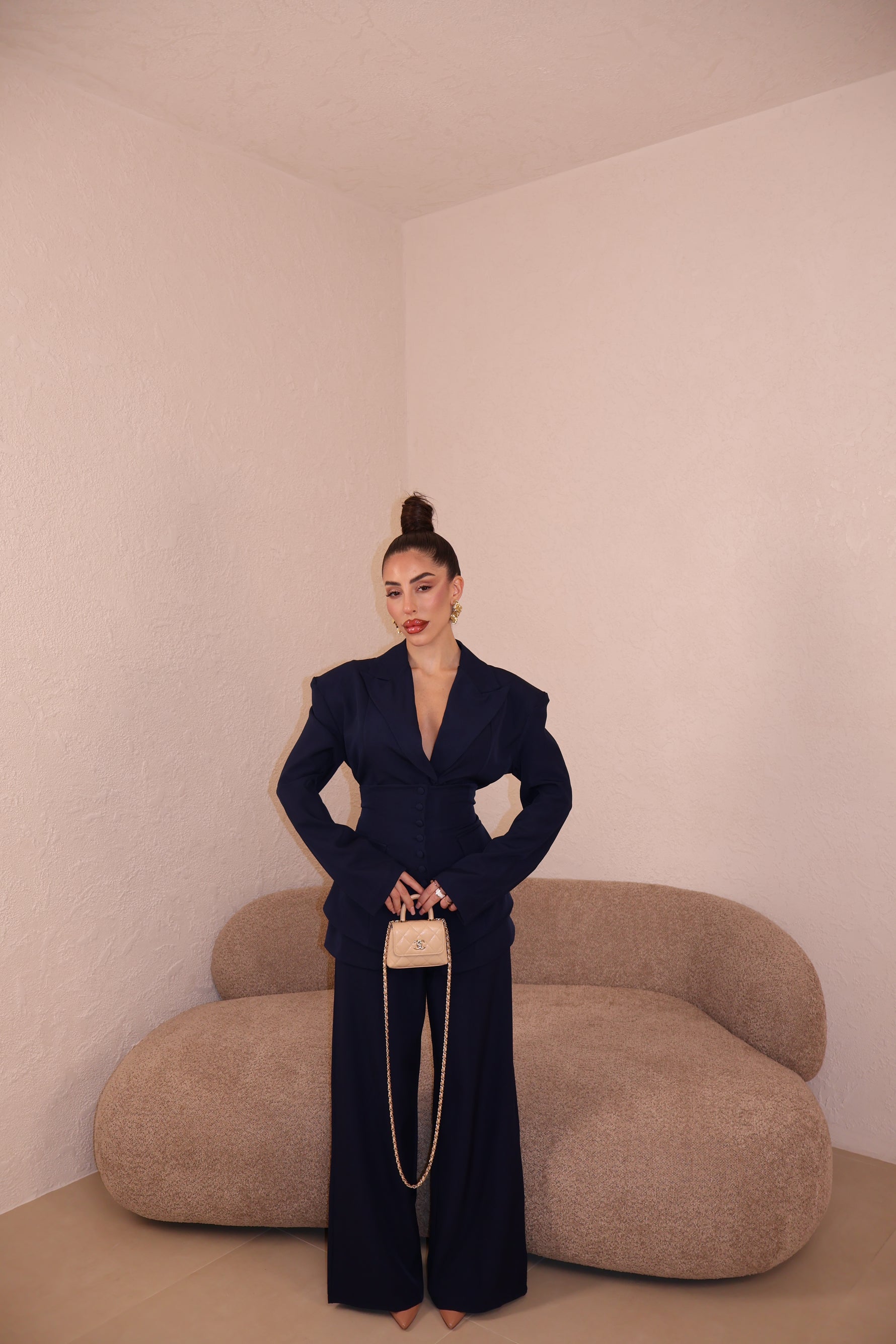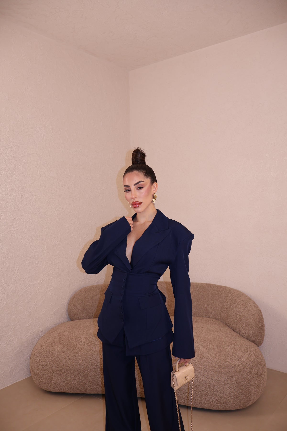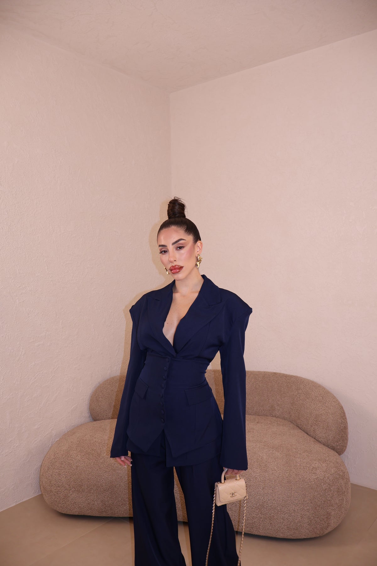 Tailleur composto da pantaloni con elastico sul retro e giacca con bustino in vita regolabile sul retro. Taglia unica.