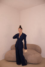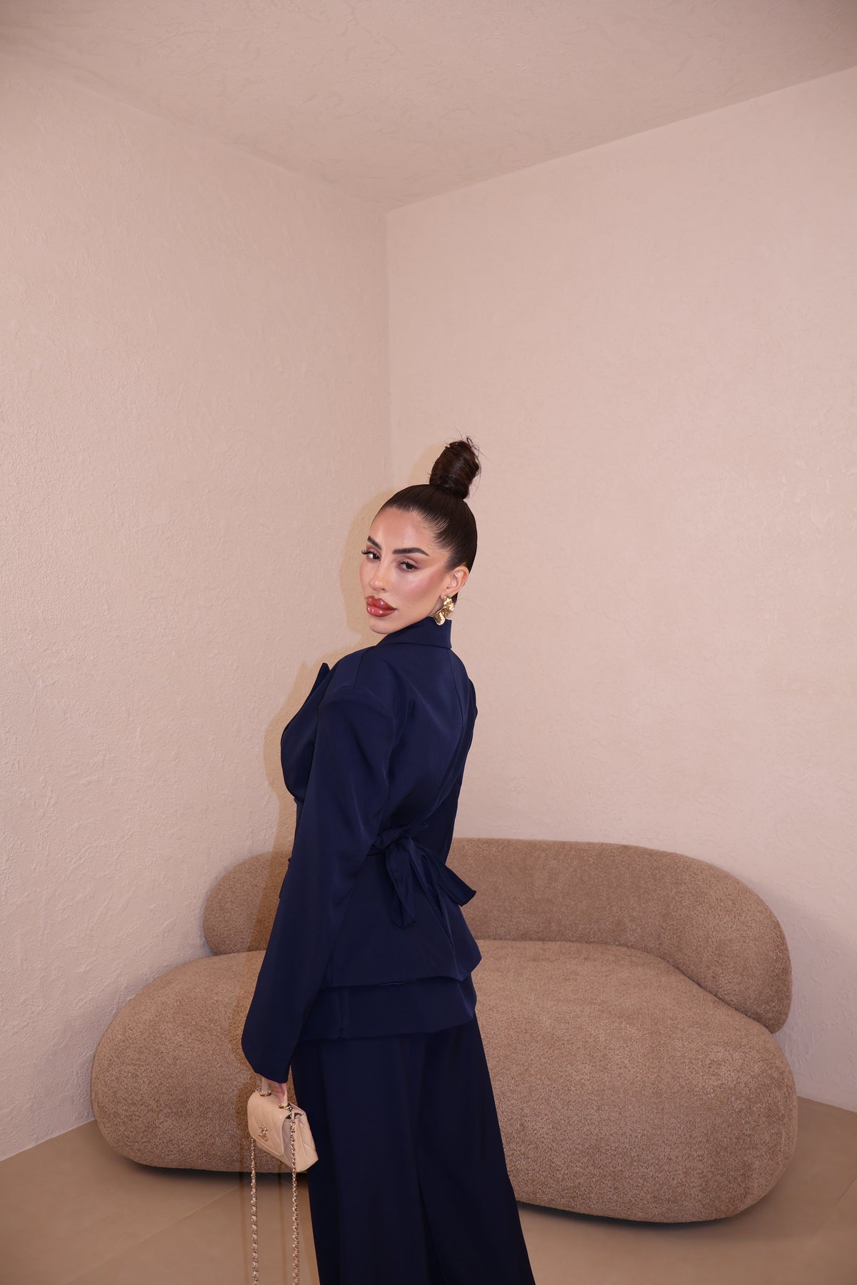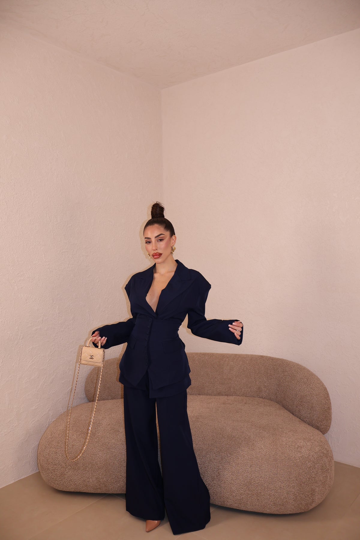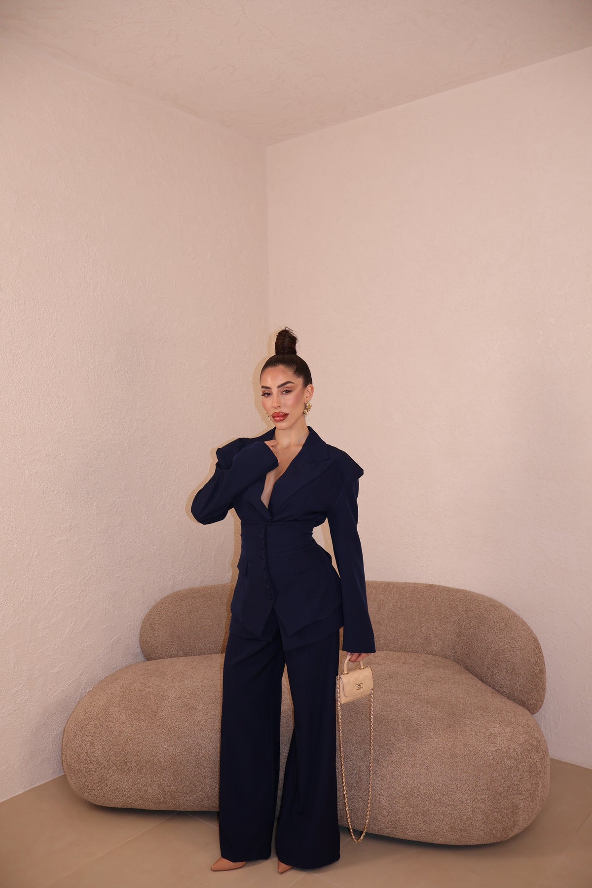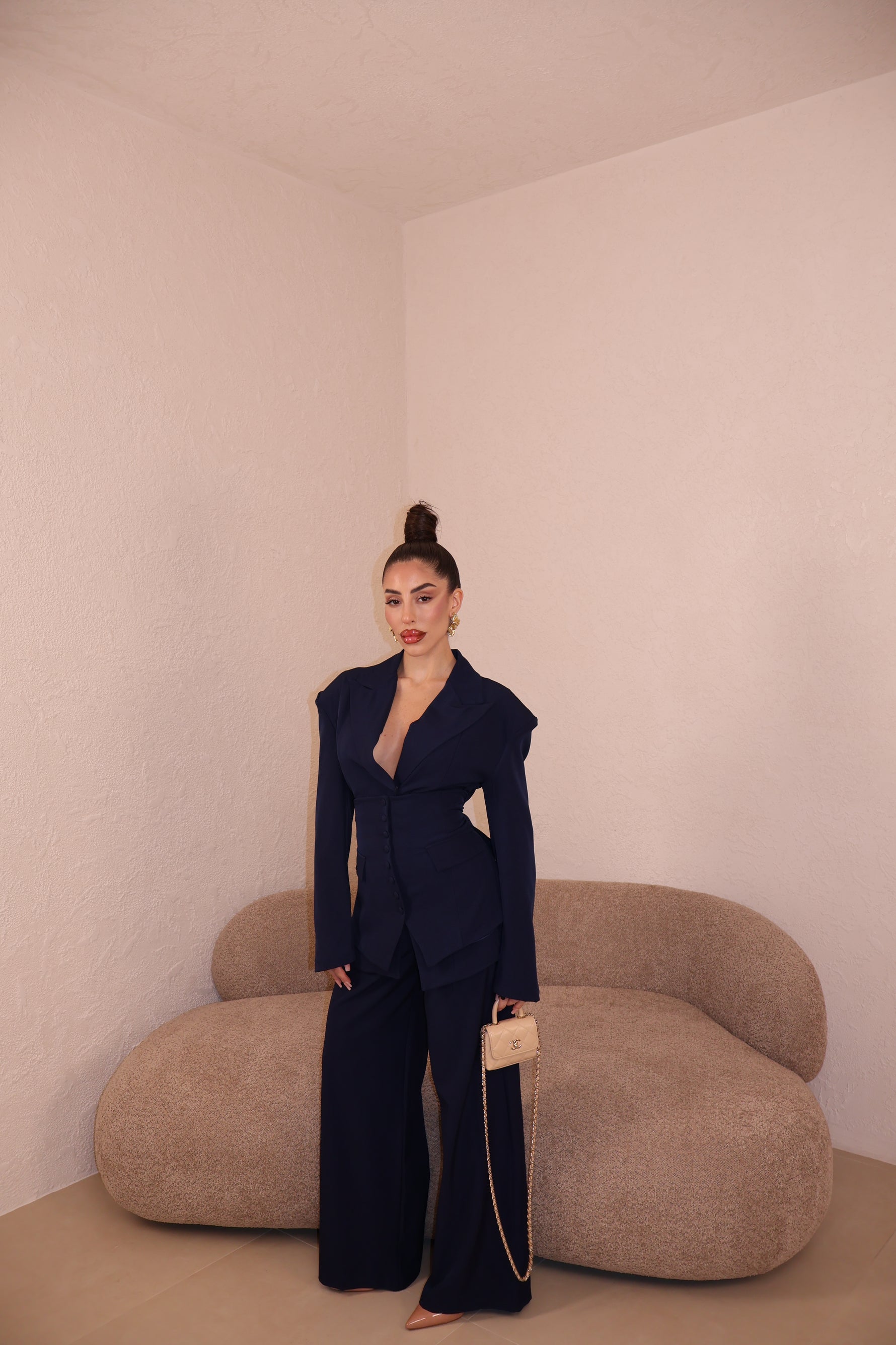 Tailleur composto da pantaloni con elastico sul retro e giacca con bustino in vita regolabile sul retro. Taglia unica.