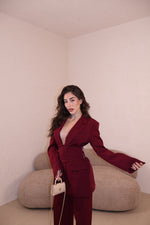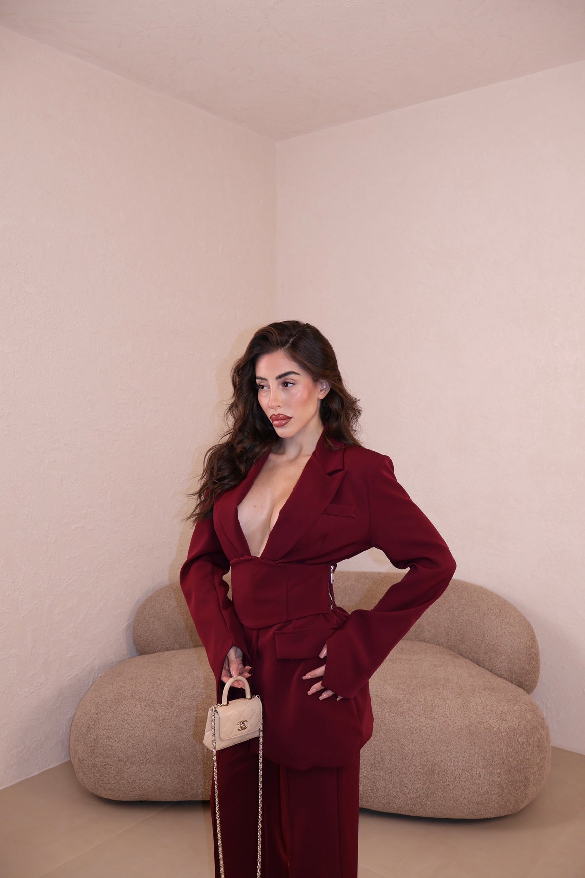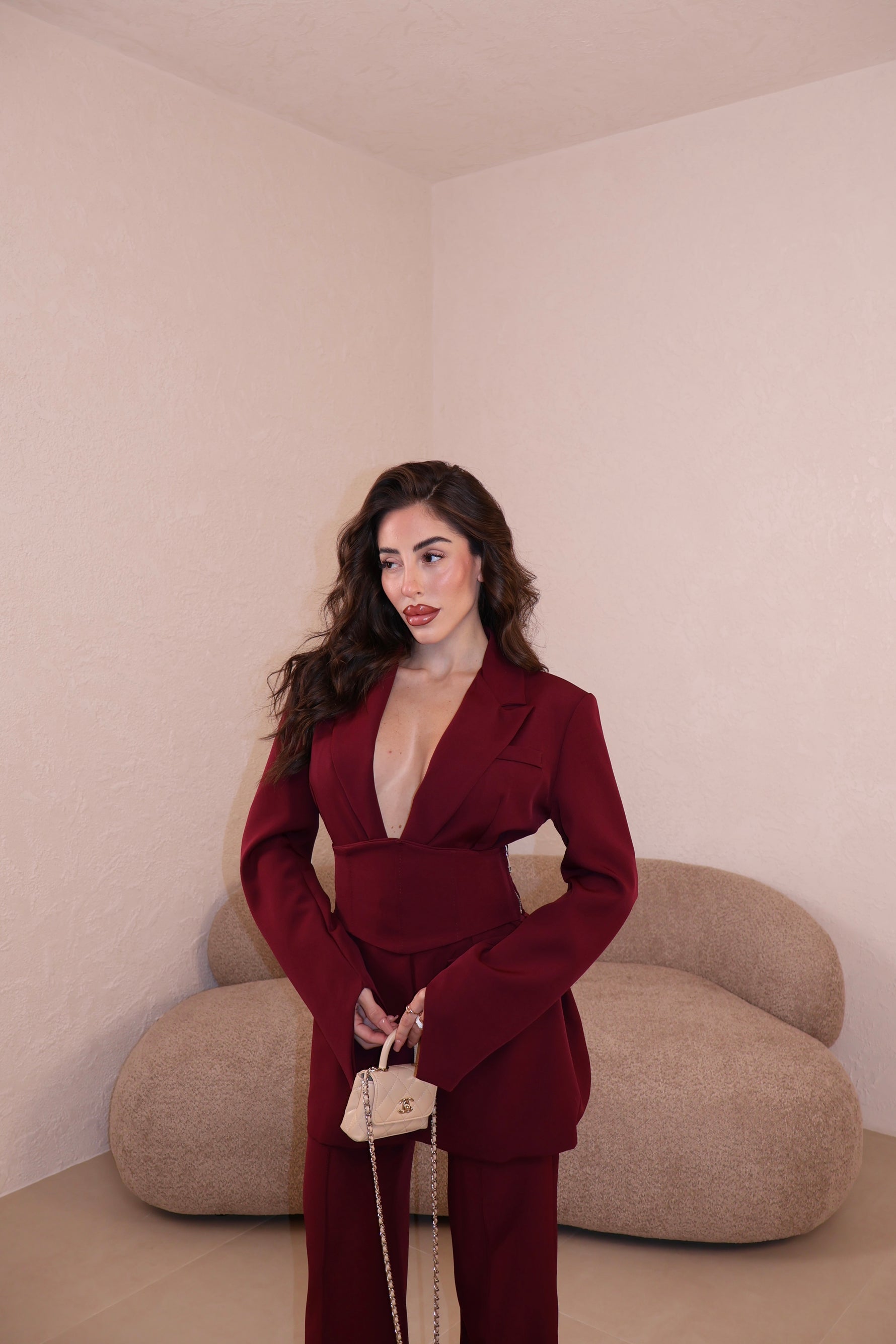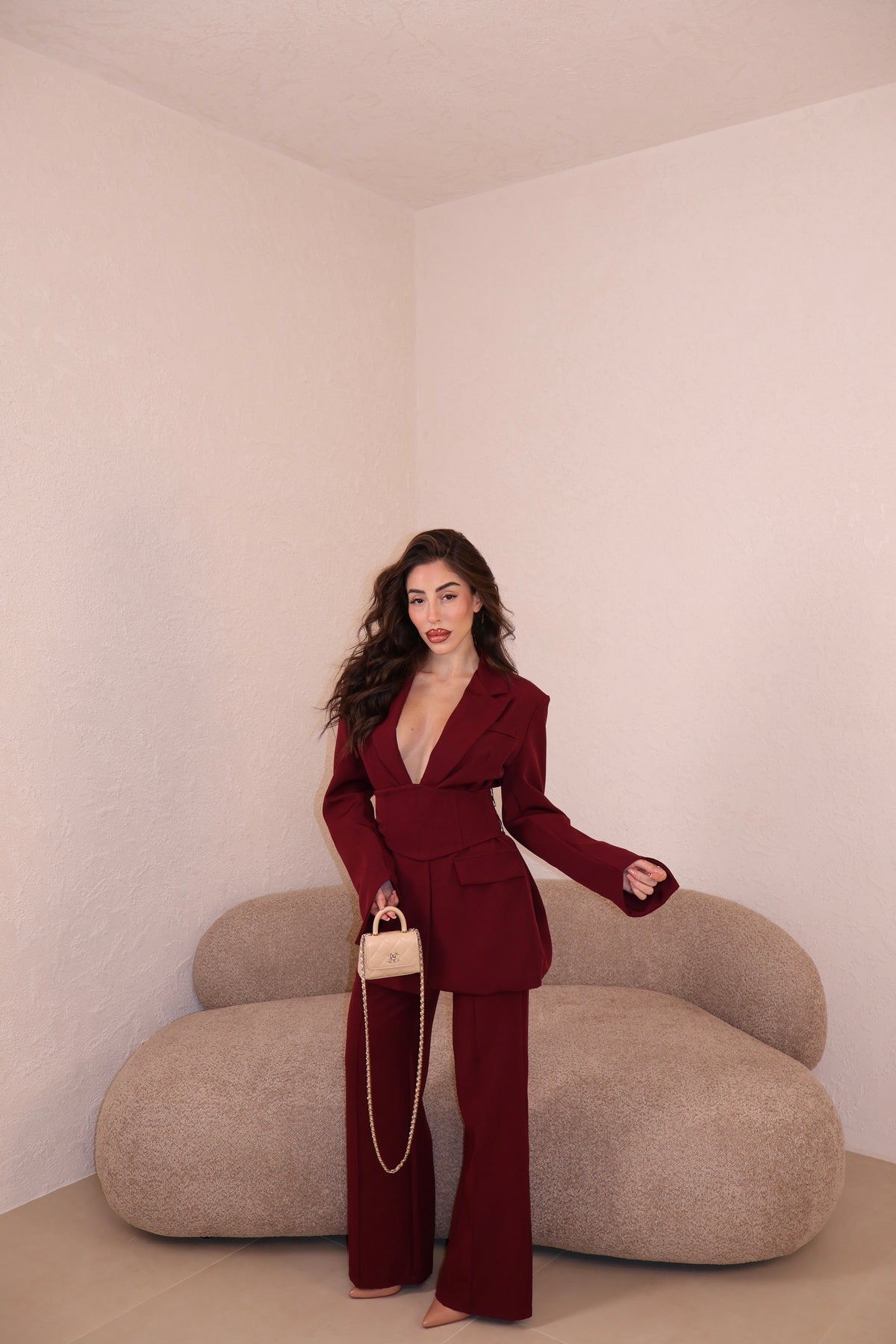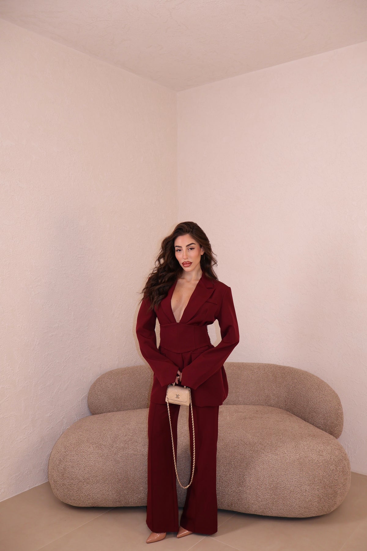 Tailleur composto da pantalone vita alta con elastico sul retro e giacca con fascia in vita elasticizzata e cerniera laterale. Taglia unica.