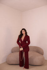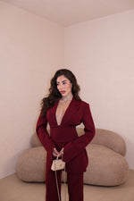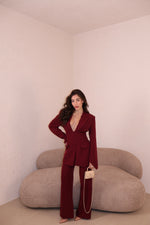 Prezzo unitario / perTailleur composto da pantalone vita alta con elastico sul retro e giacca con fascia in vita elasticizzata e cerniera laterale. Taglia unica.