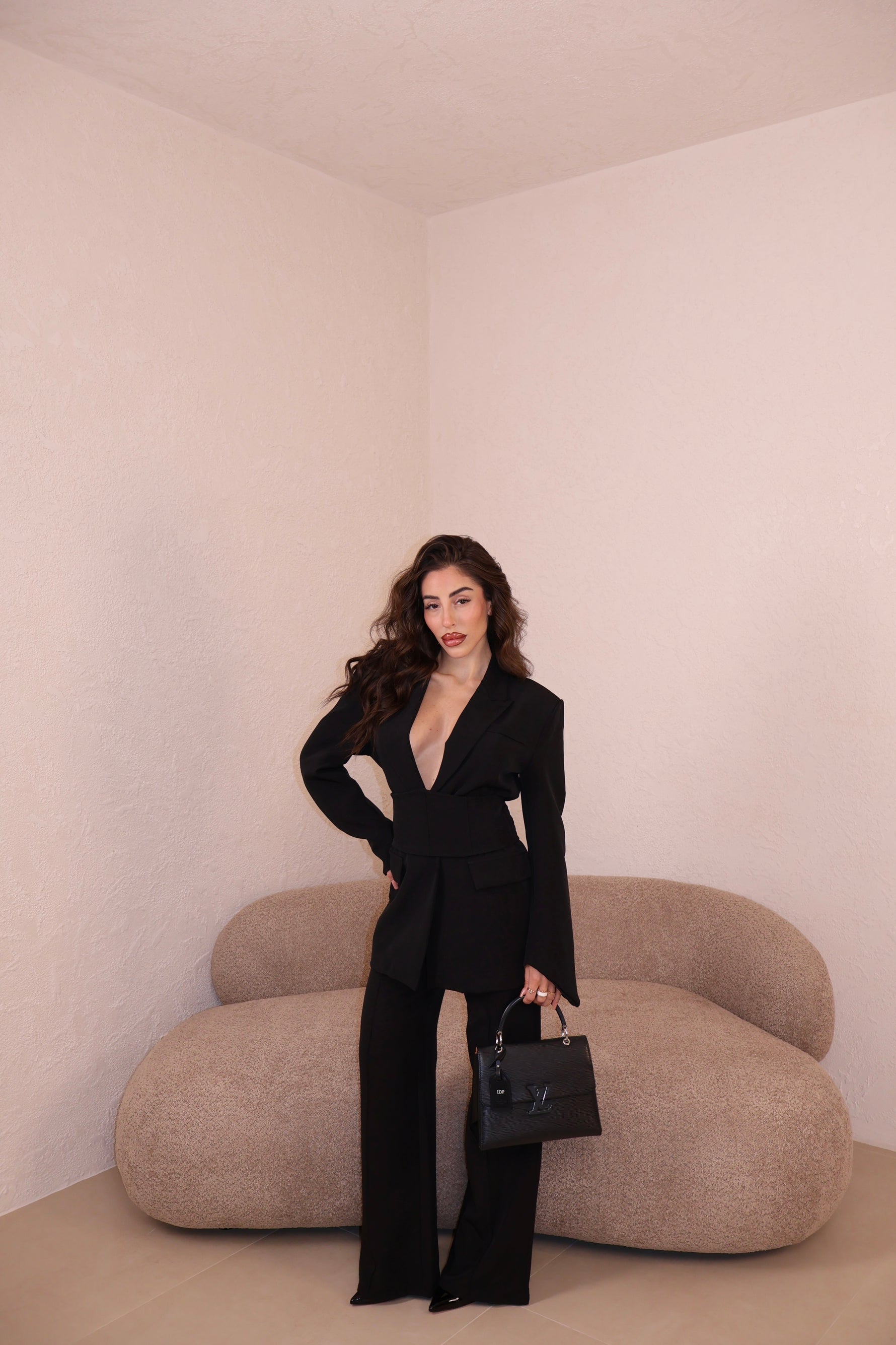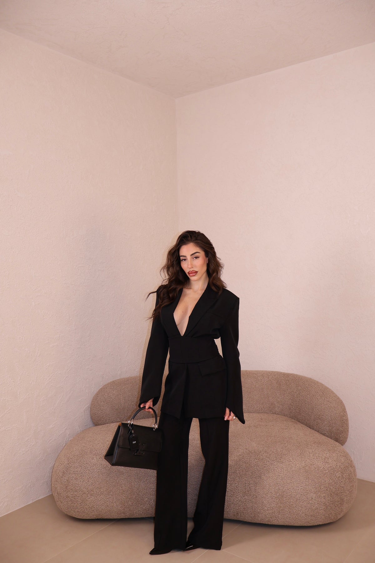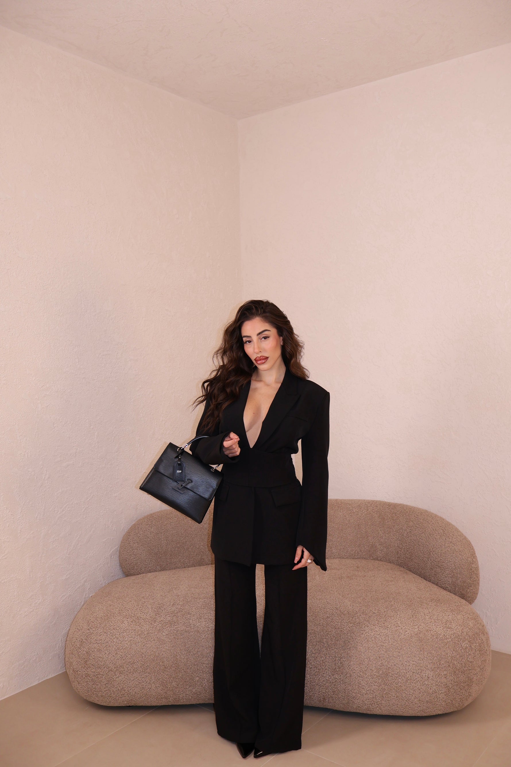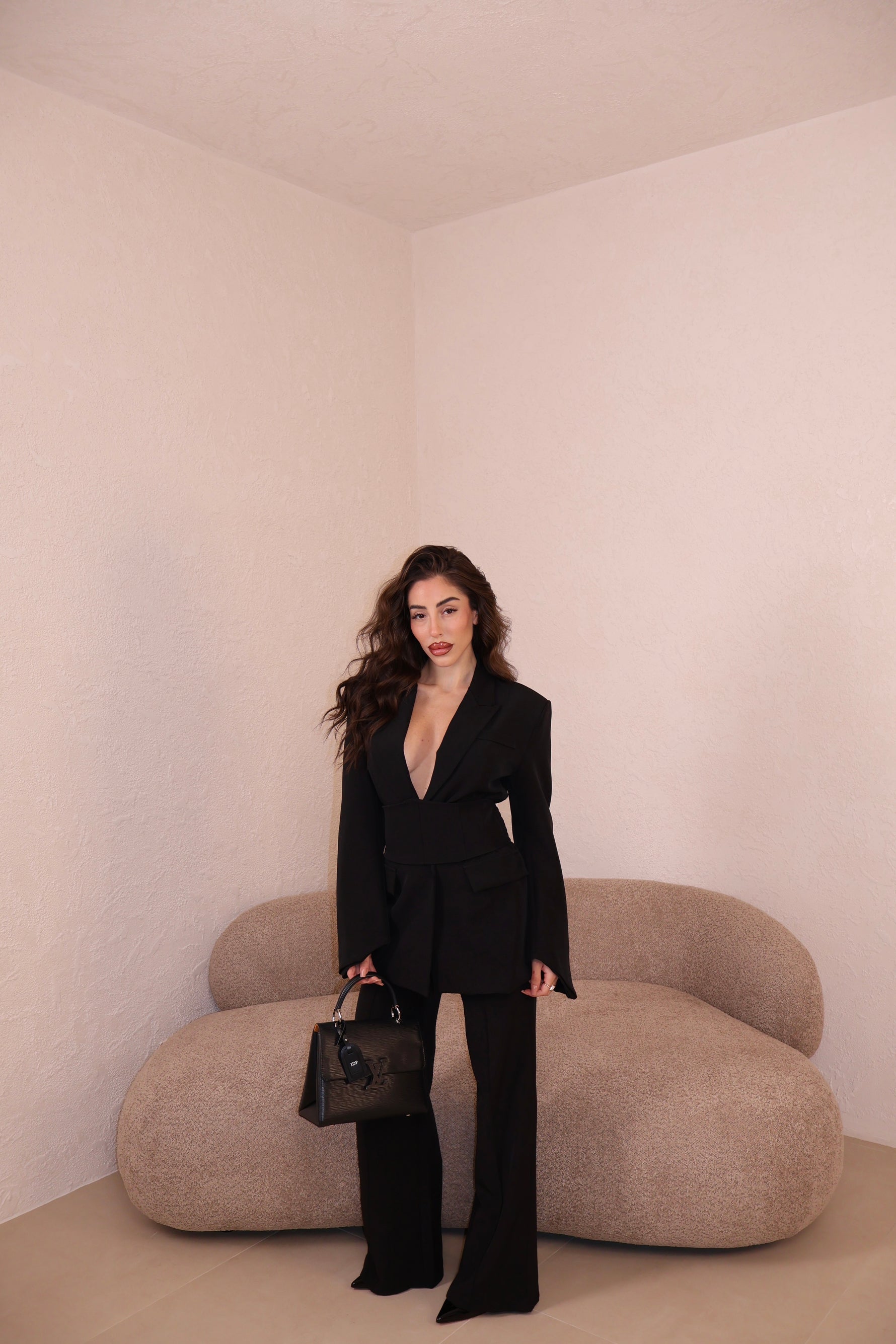 Tailleur composto da pantalone vita alta con elastico sul retro e giacca con fascia in vita elasticizzata e cerniera laterale. Taglia unica.