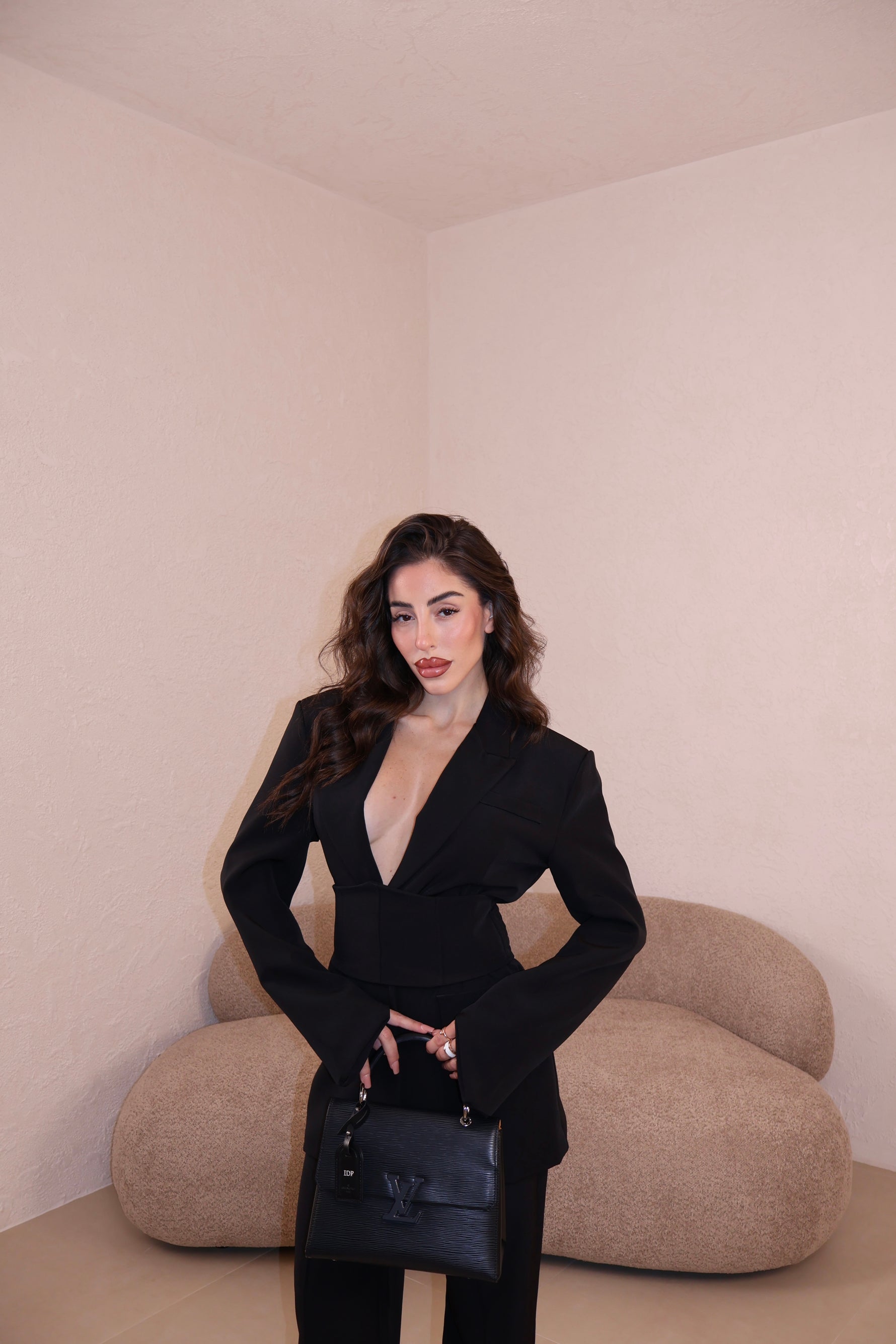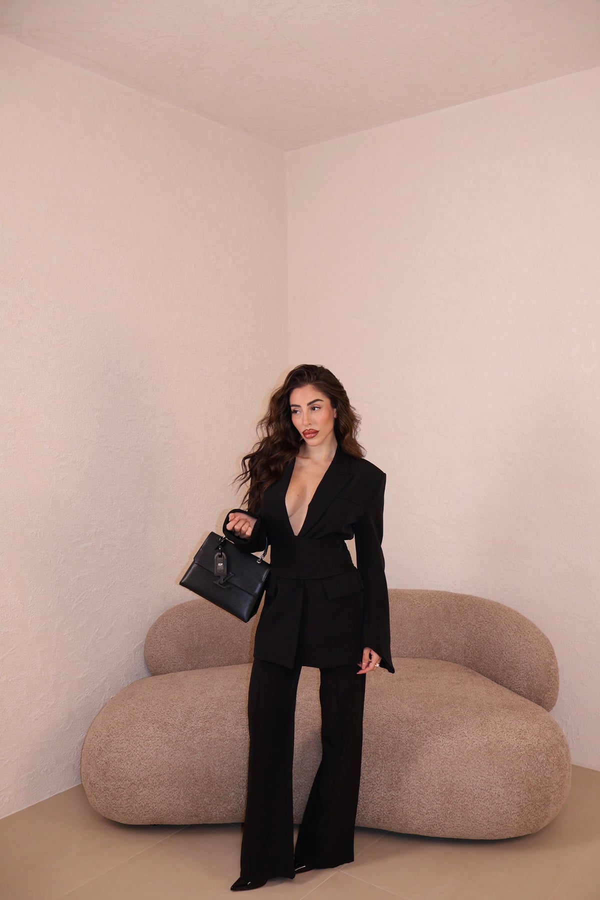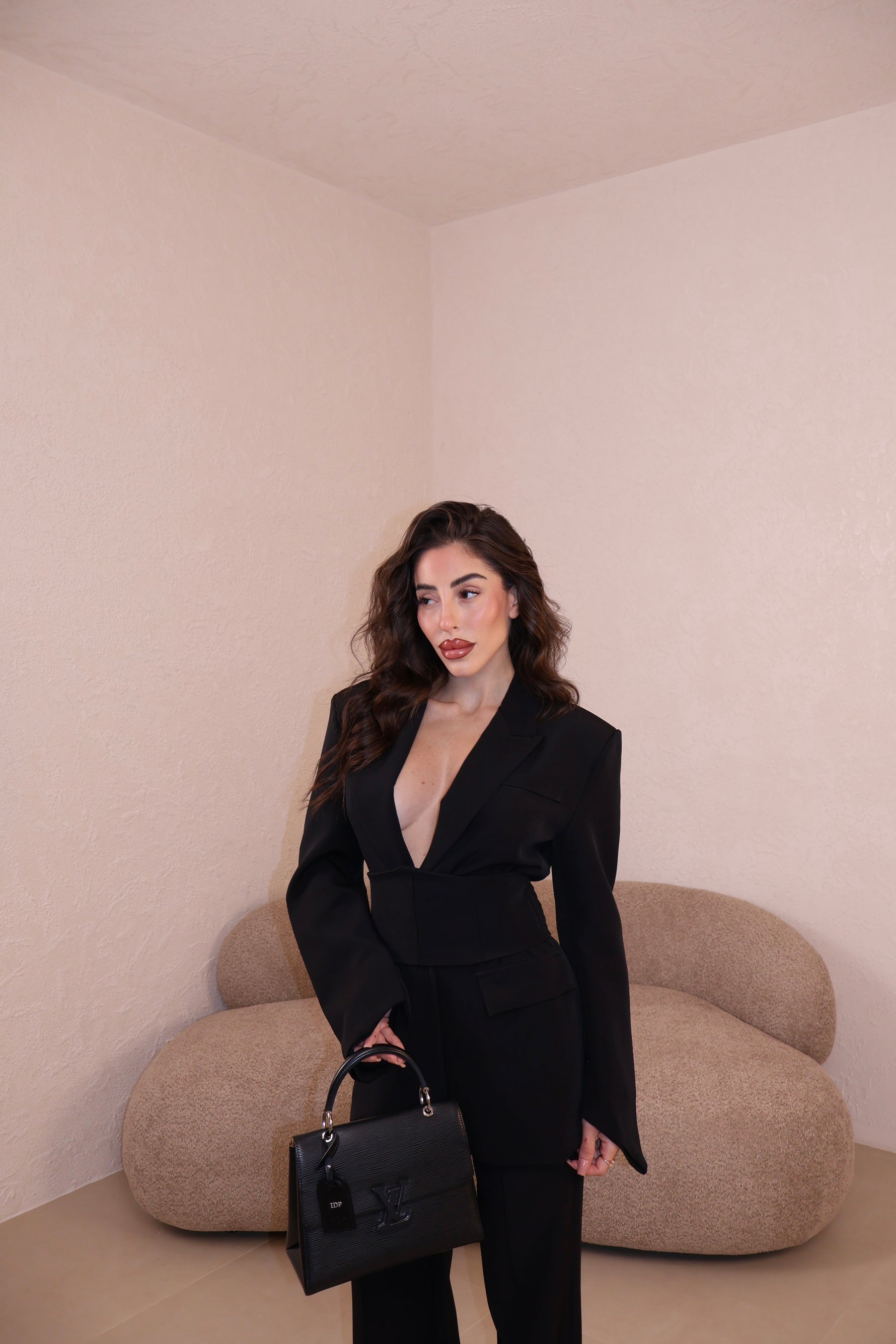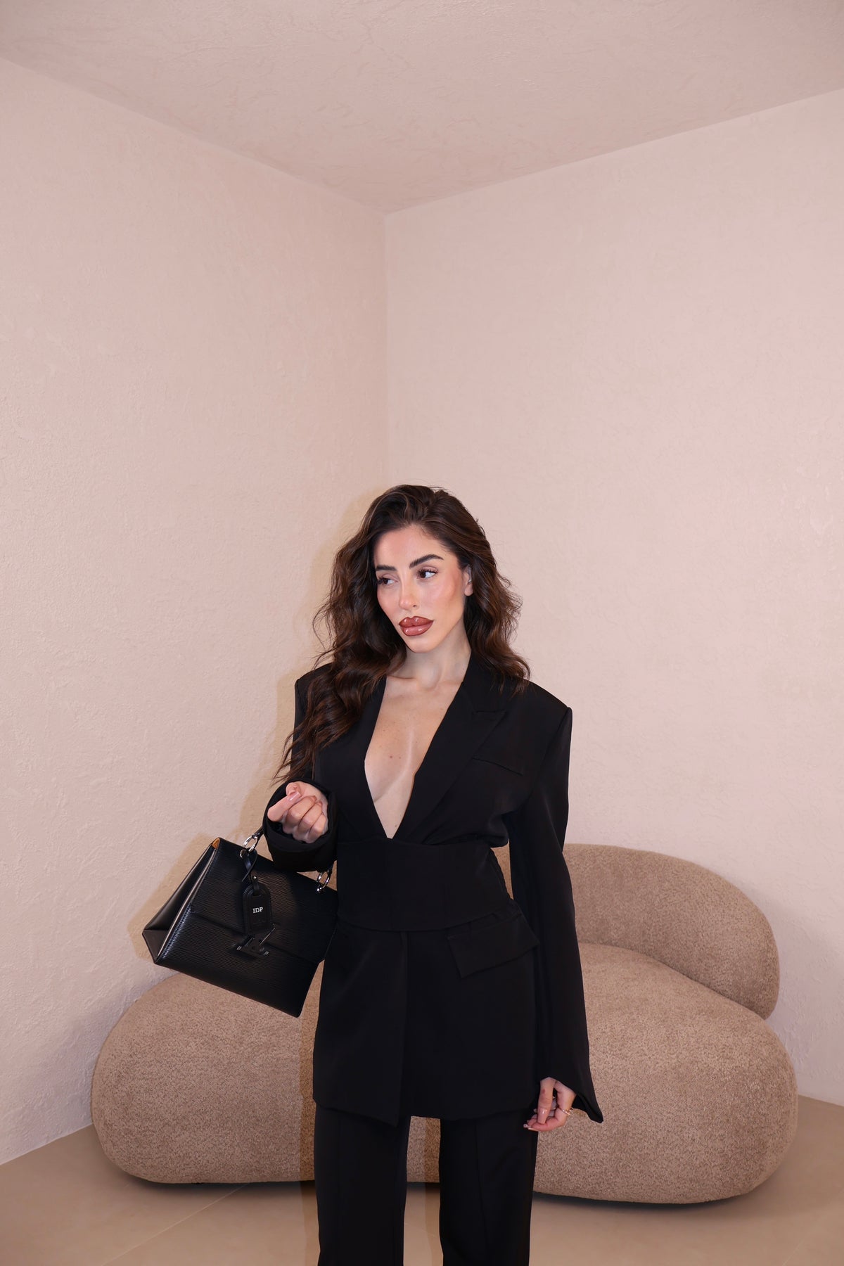 Tailleur composto da pantalone vita alta con elastico sul retro e giacca con fascia in vita elasticizzata e cerniera laterale. Taglia unica.