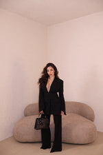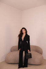 Prezzo unitario / perTailleur composto da pantalone vita alta con elastico sul retro e giacca con fascia in vita elasticizzata e cerniera laterale. Taglia unica.