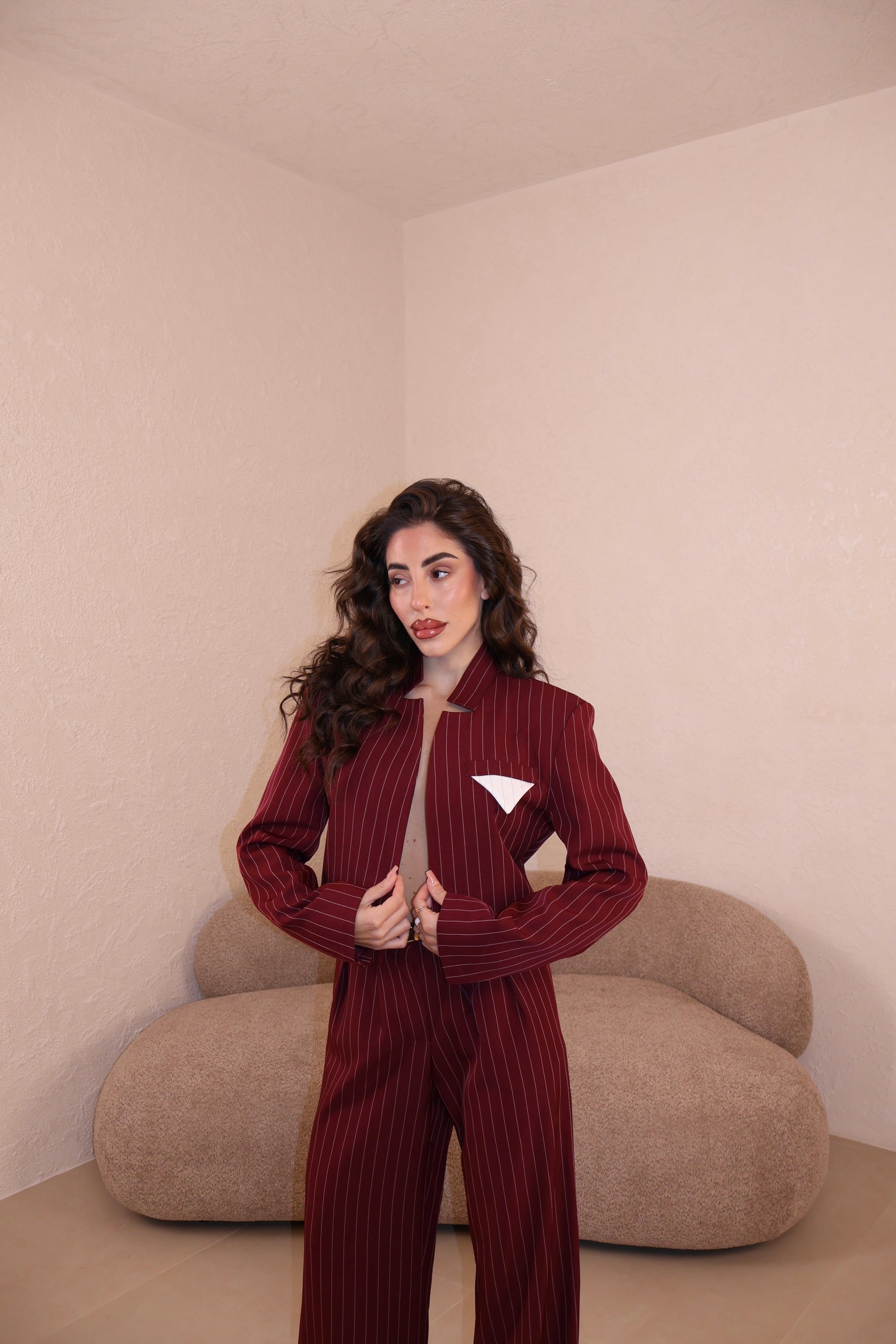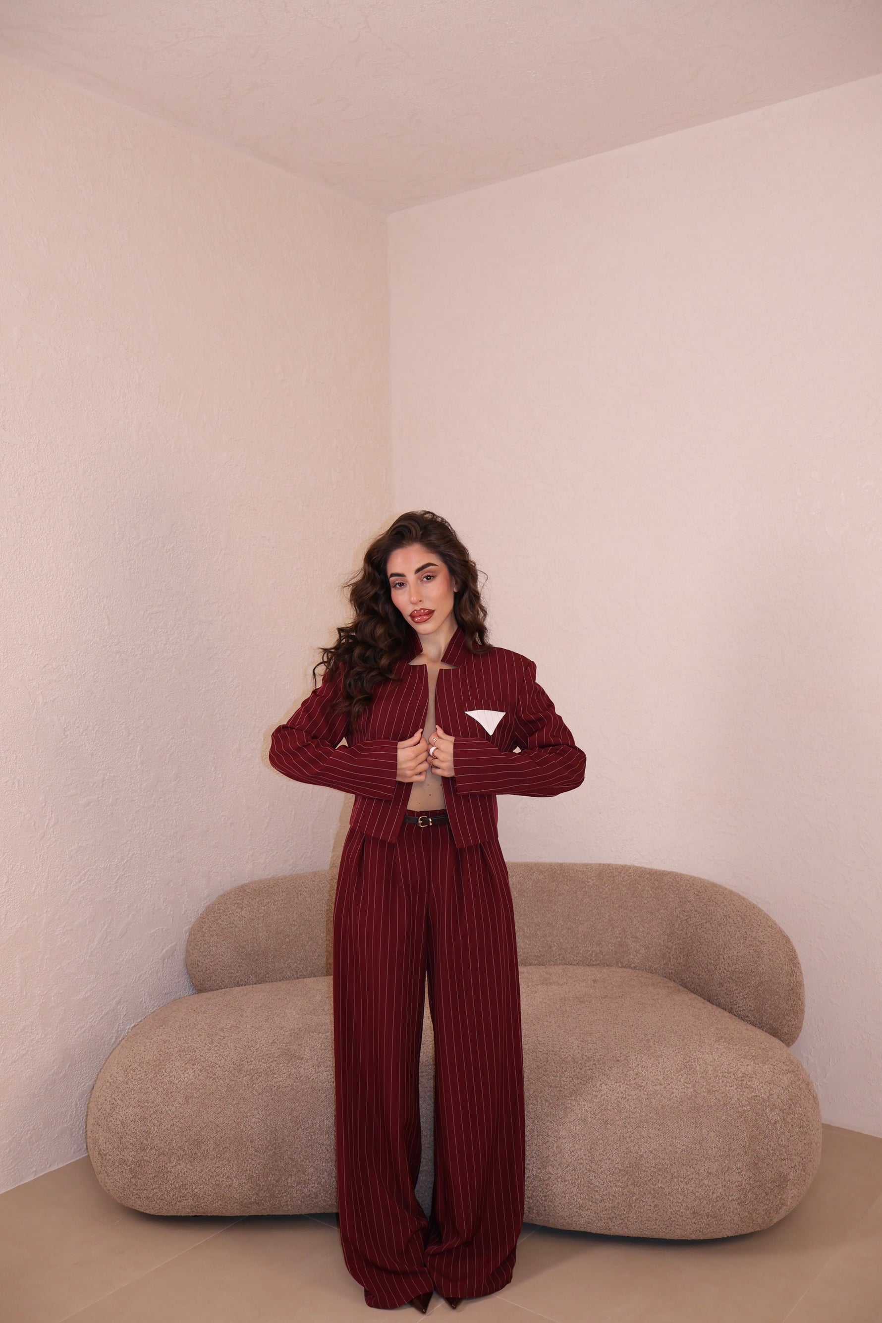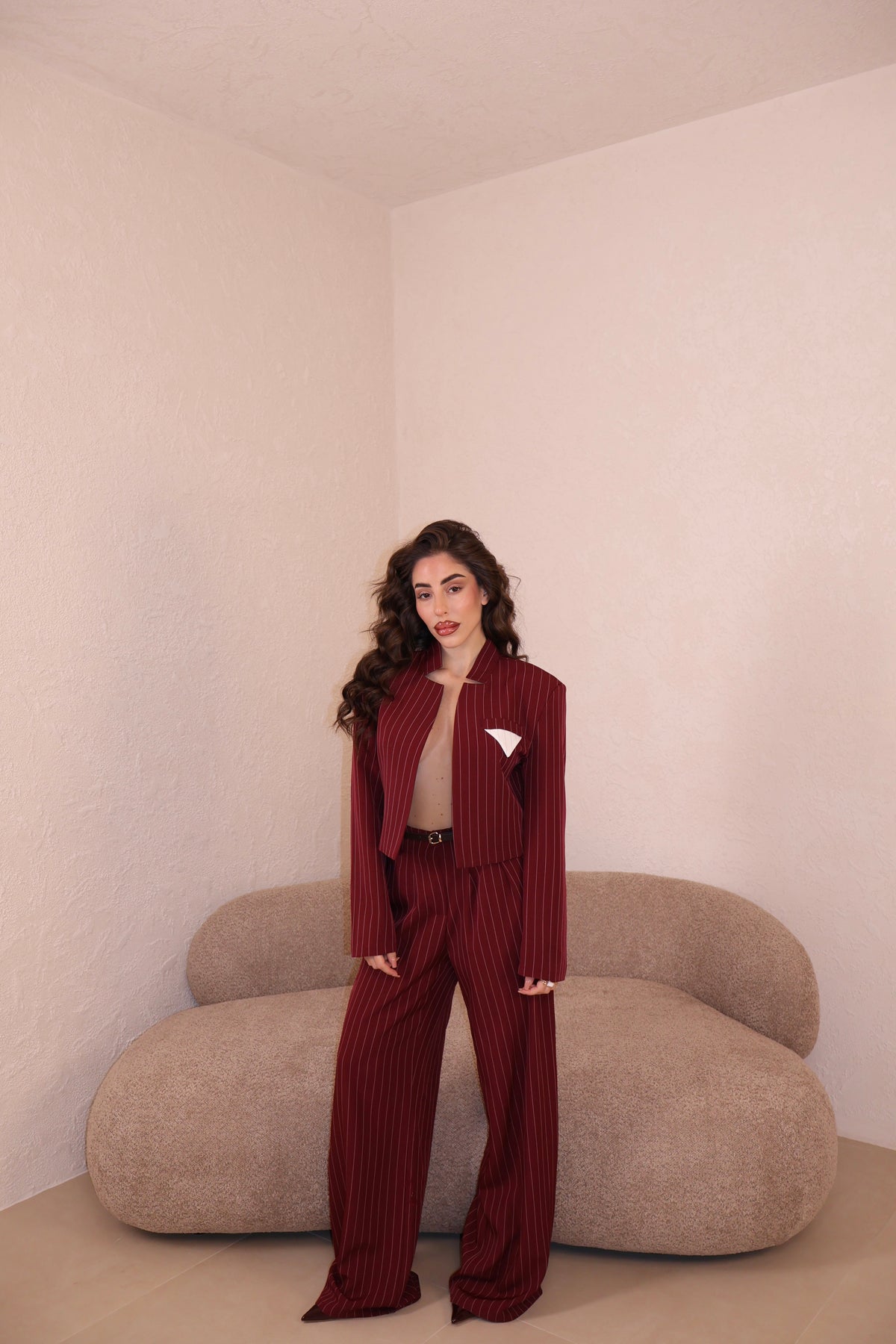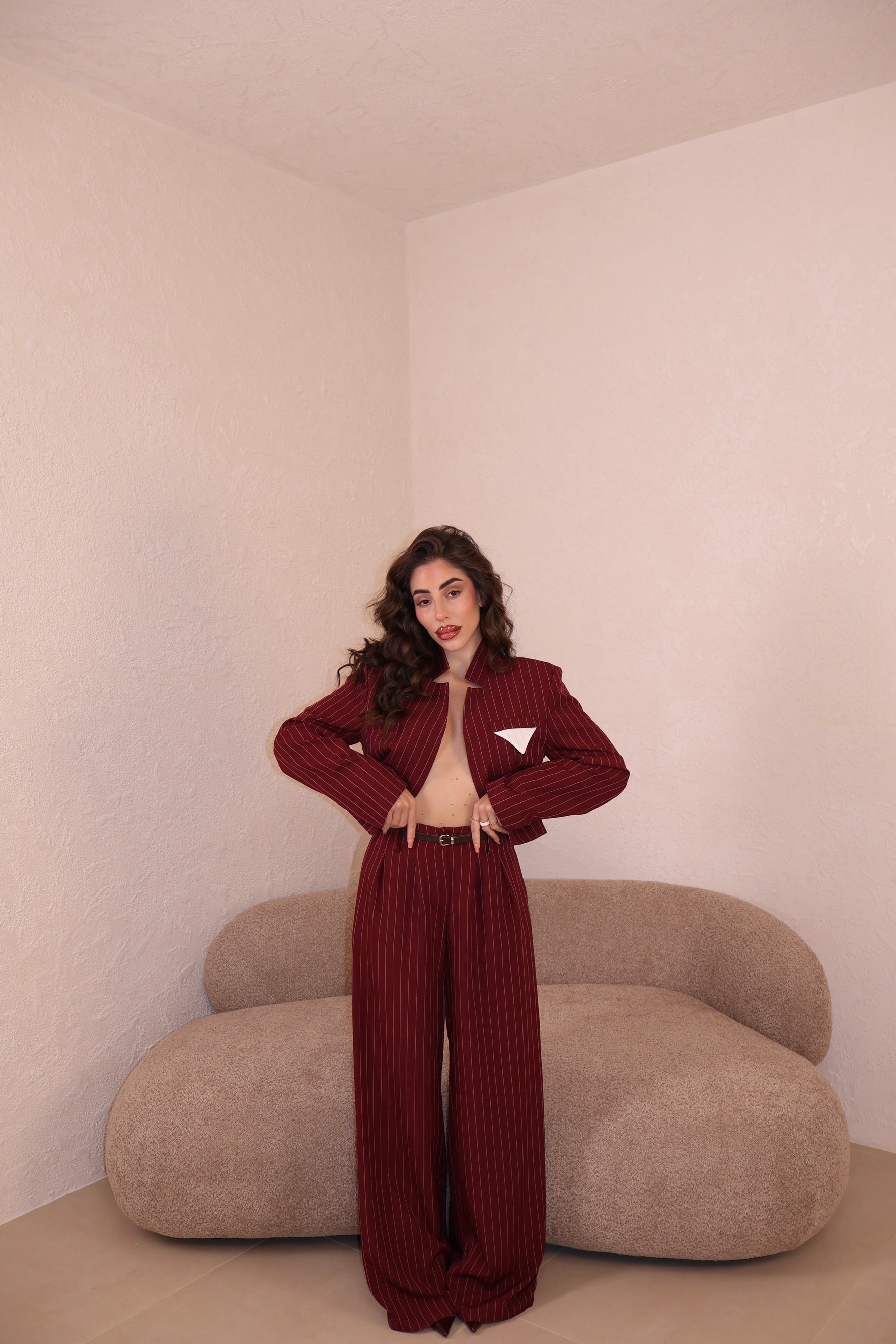 Tailleur composto da pantalone con cintura inclusa ed elastico sul retro, giacca crop con taschino. Taglia unica.