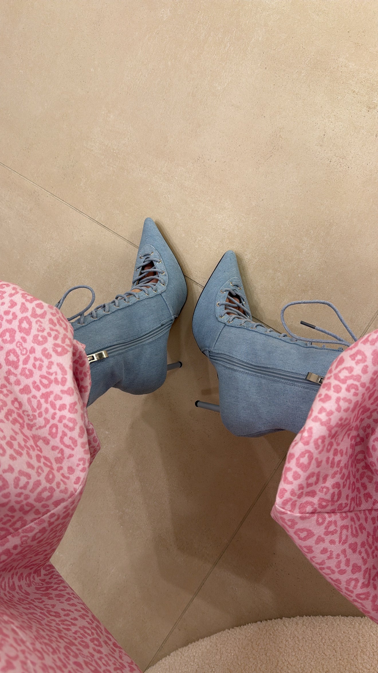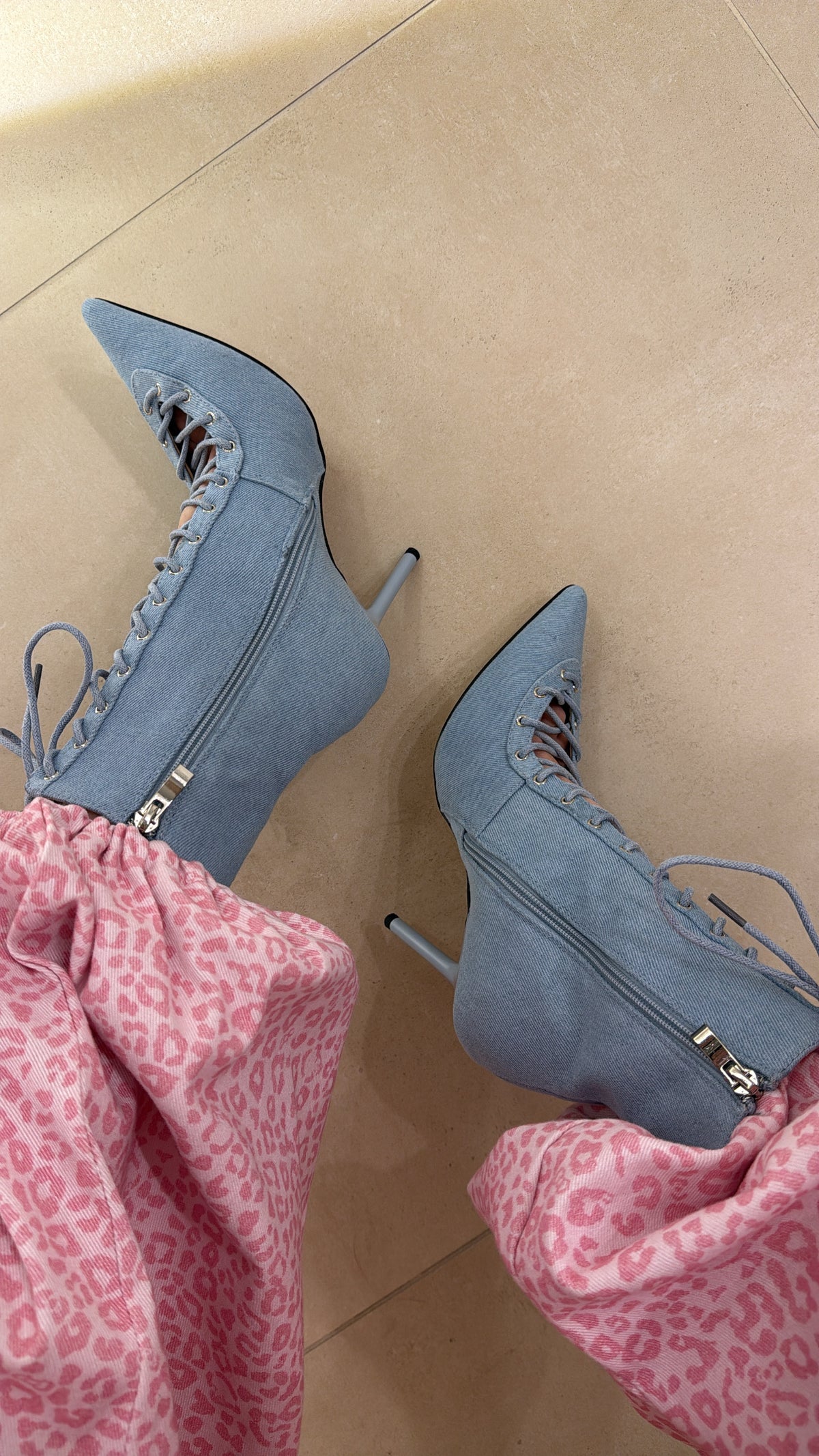 Prezzo unitario / perStivale in denim stringato con cerniera laterale. Calzata facile e regolare. Modello a punta. Tacco 10cm.