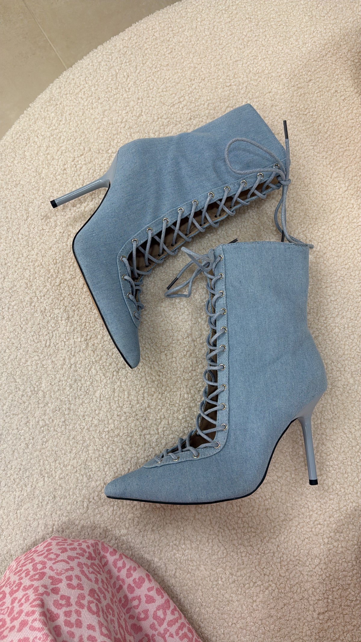Stivale in denim stringato con cerniera laterale. Calzata facile e regolare. Modello a punta. Tacco 10cm.