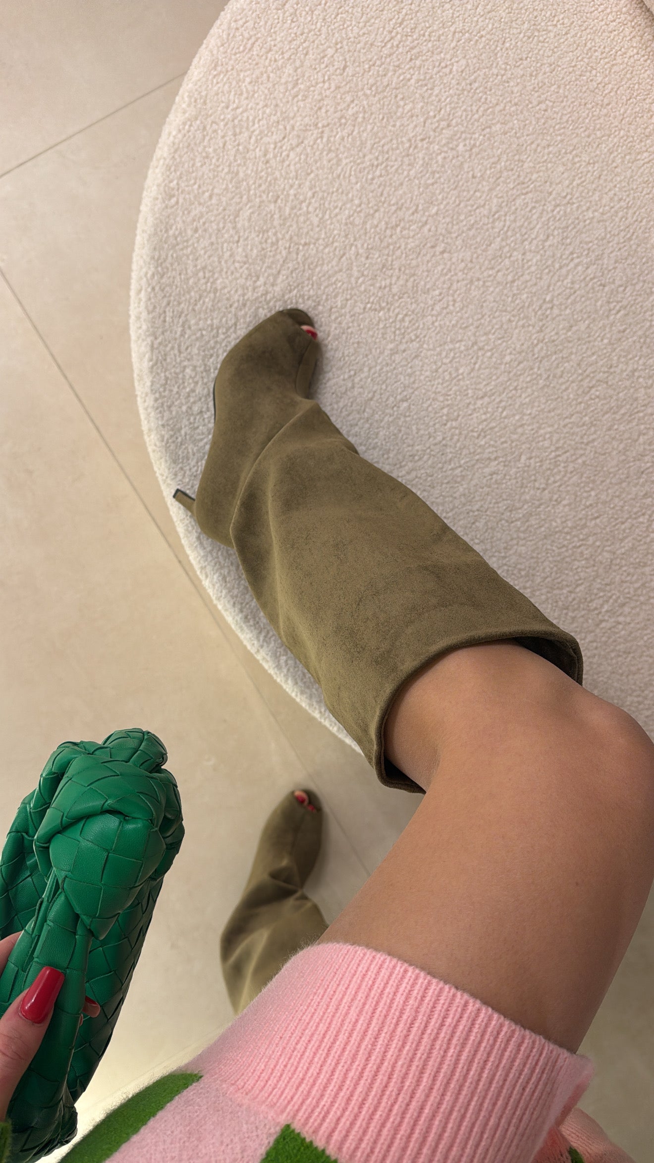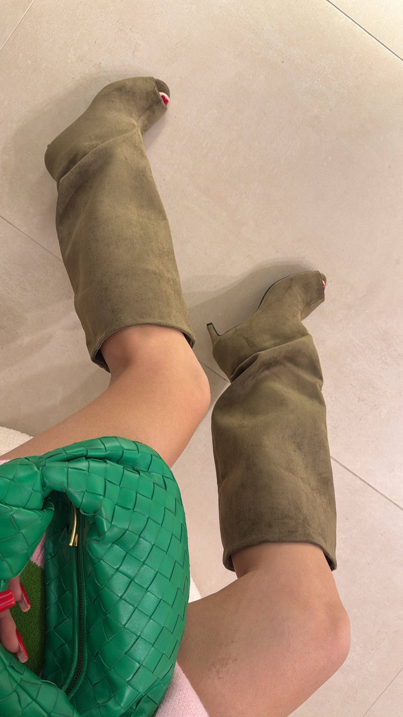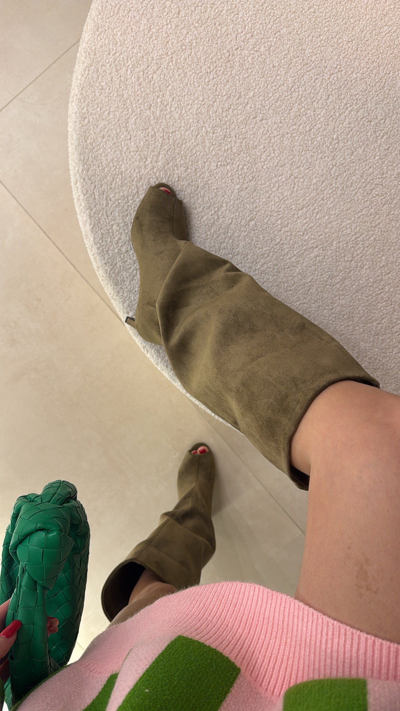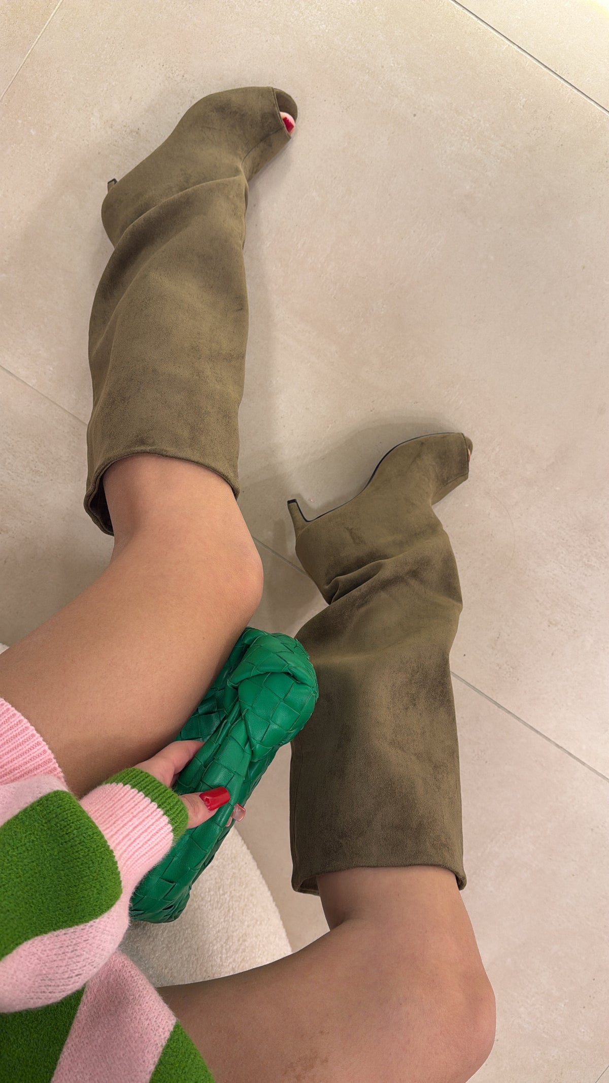 Stivali in ecocamoscio con apertura sul davanti. Tacco 7 cm. Dettaglio gambale arricciato. Calzata facile e regolare. Modello a punta rotonda.