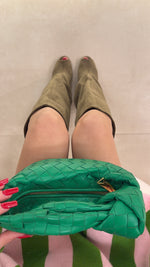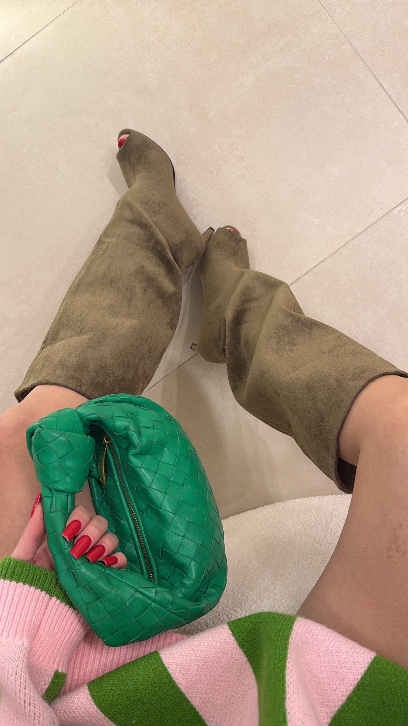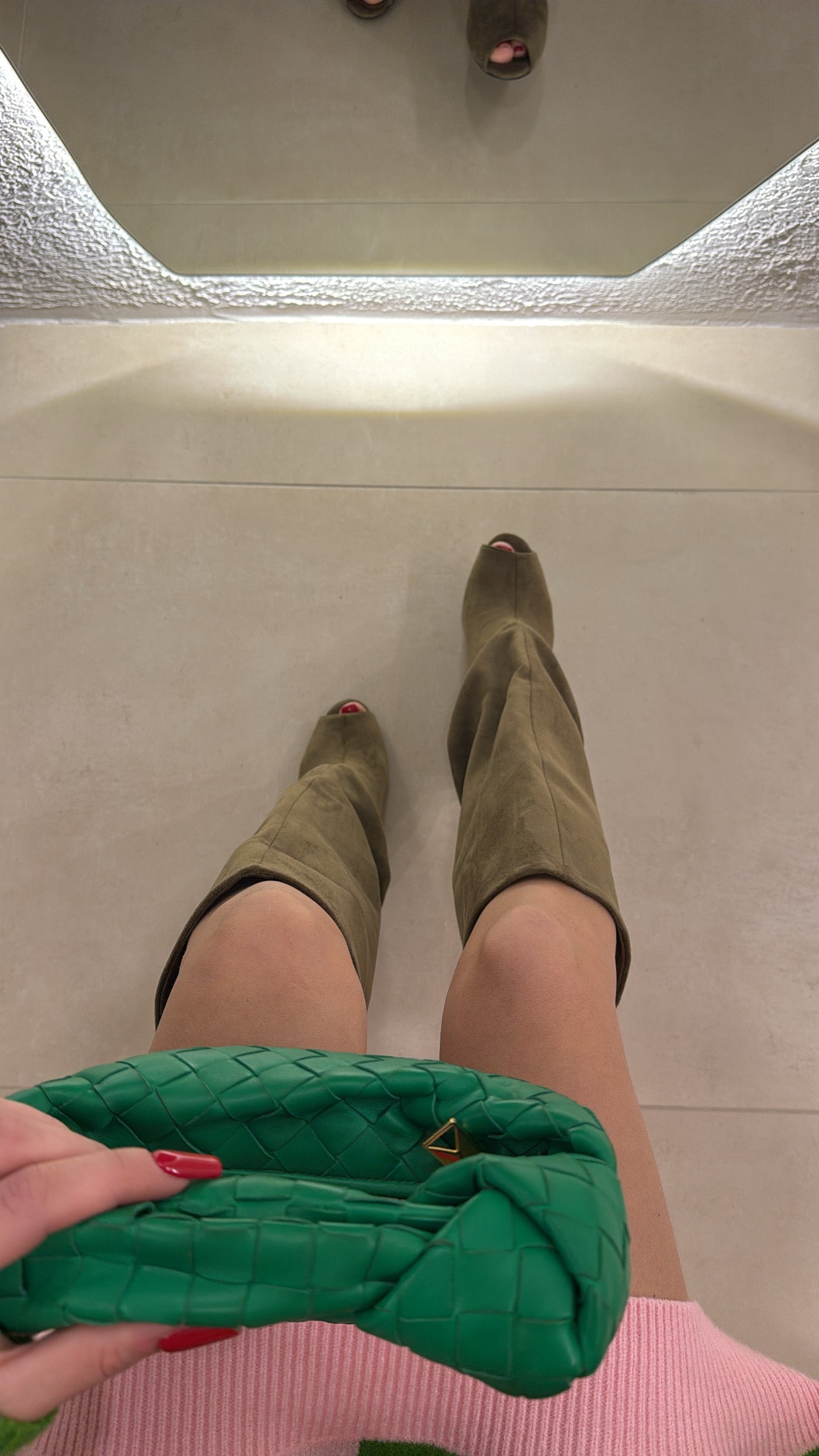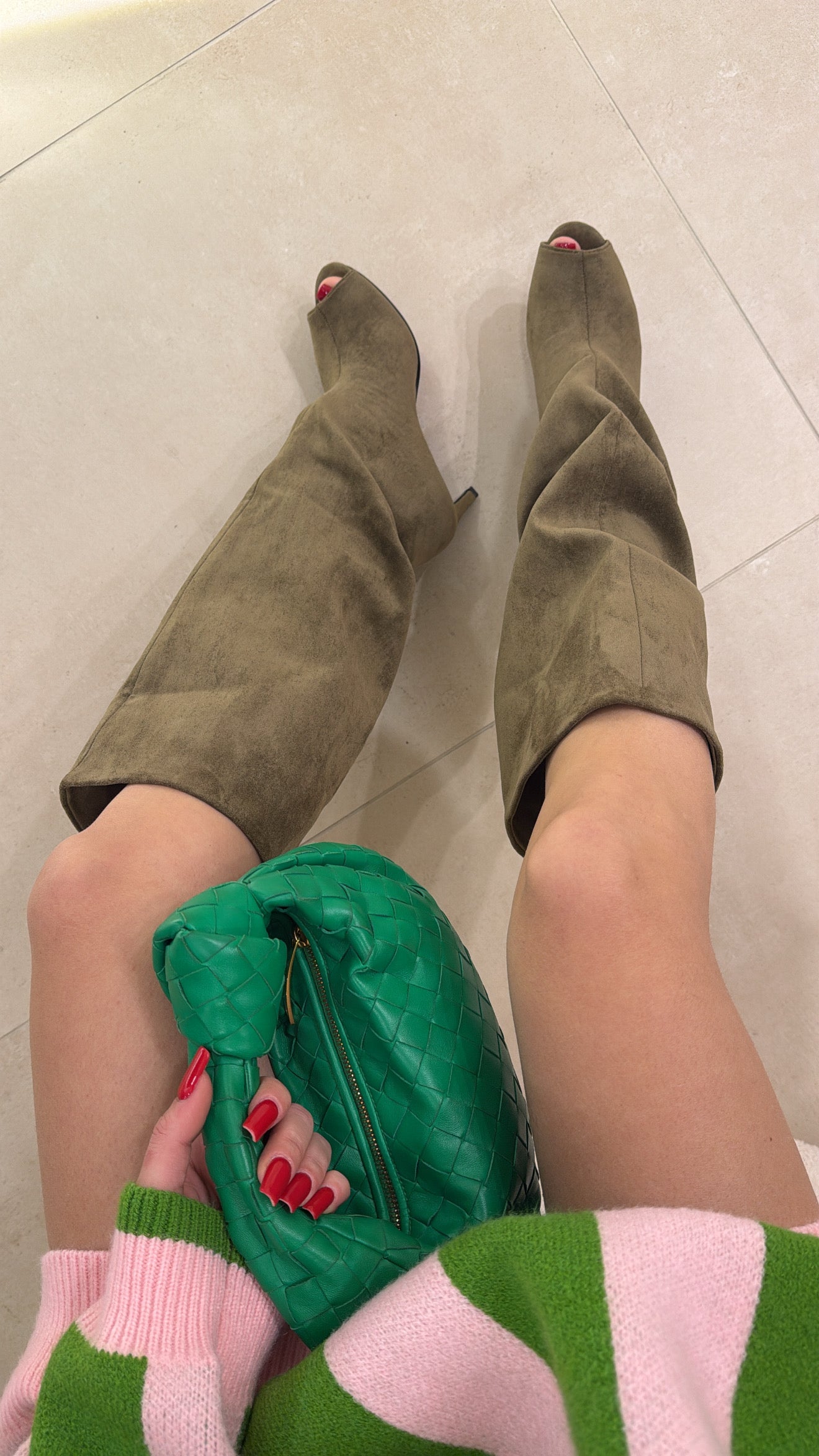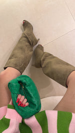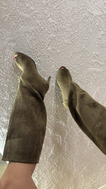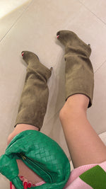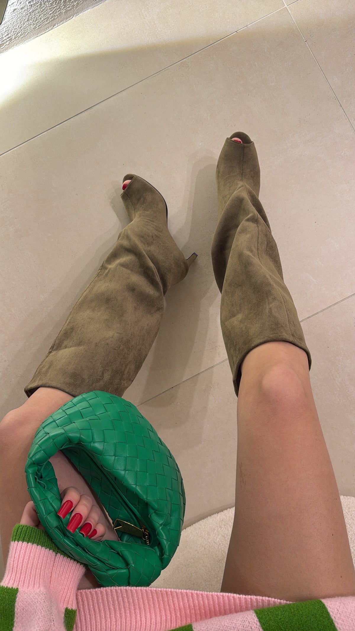 Stivali in ecocamoscio con apertura sul davanti. Tacco 7 cm. Dettaglio gambale arricciato. Calzata facile e regolare. Modello a punta rotonda.