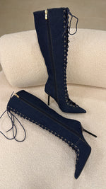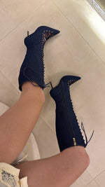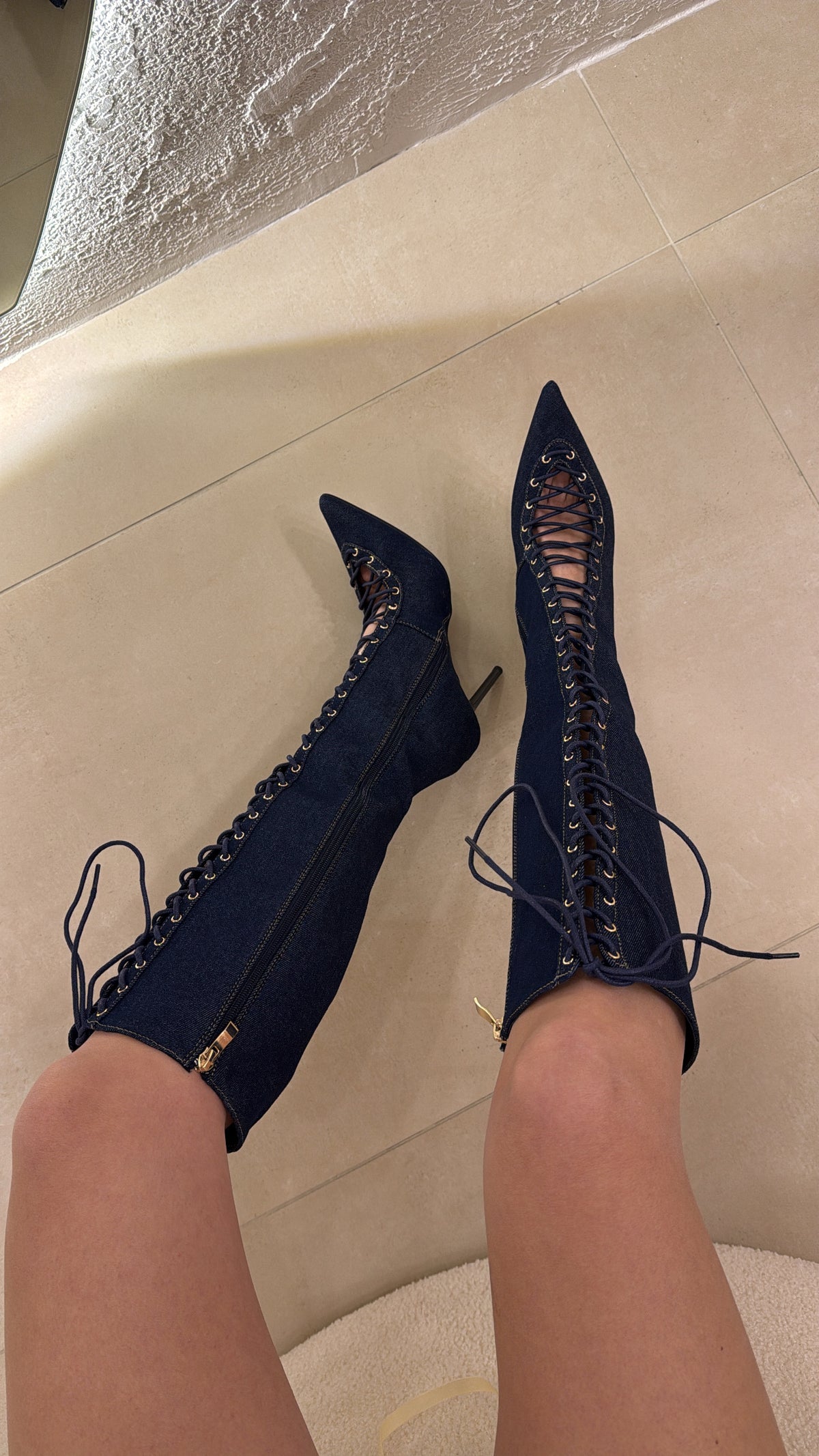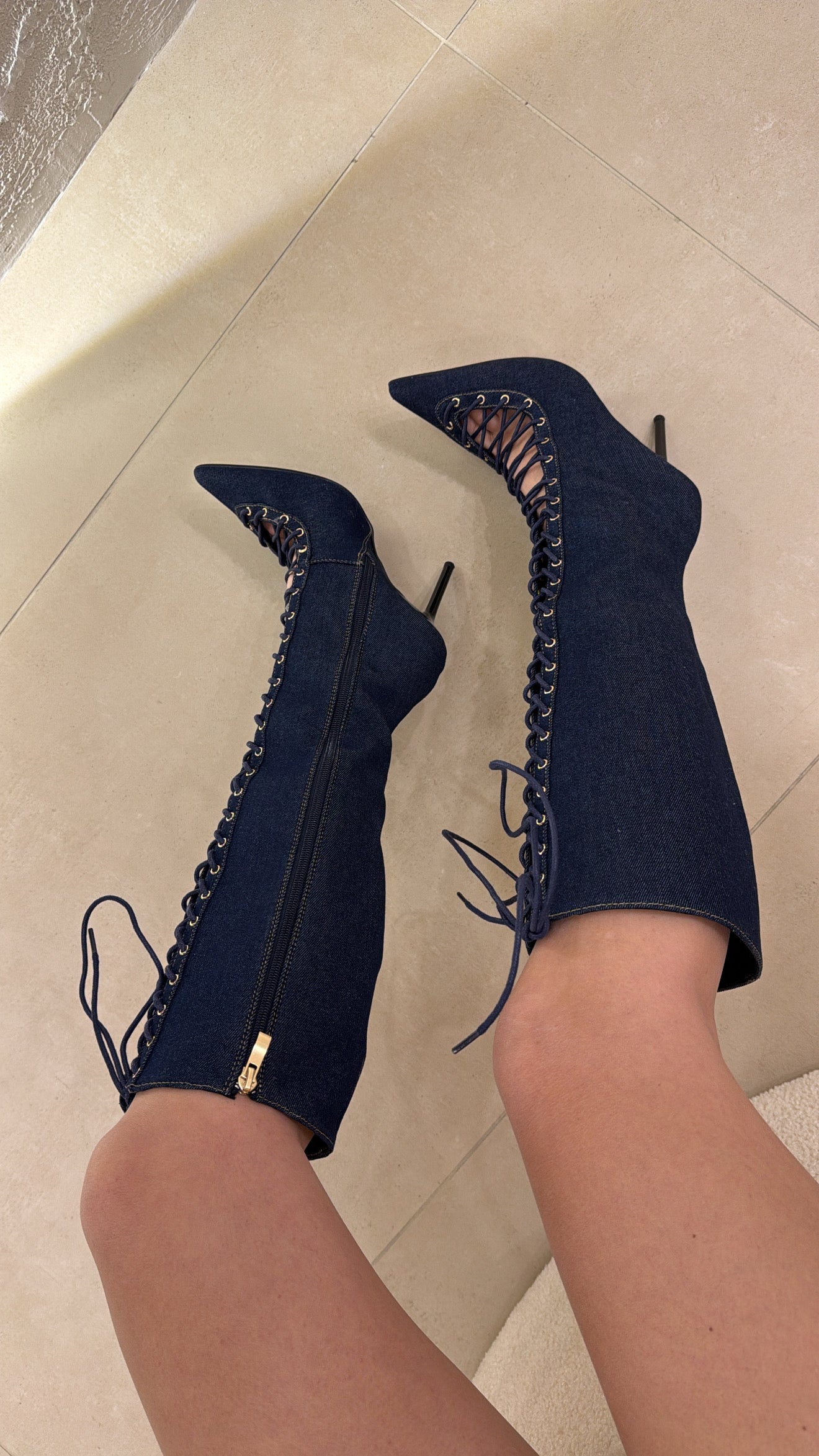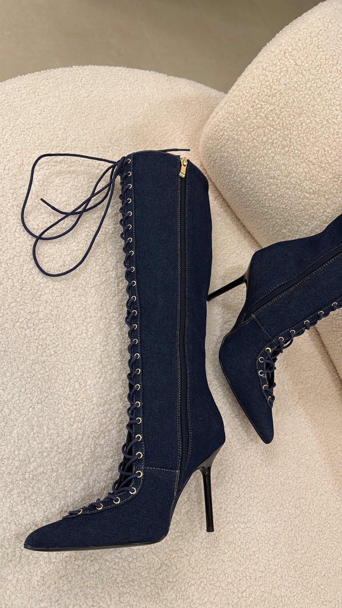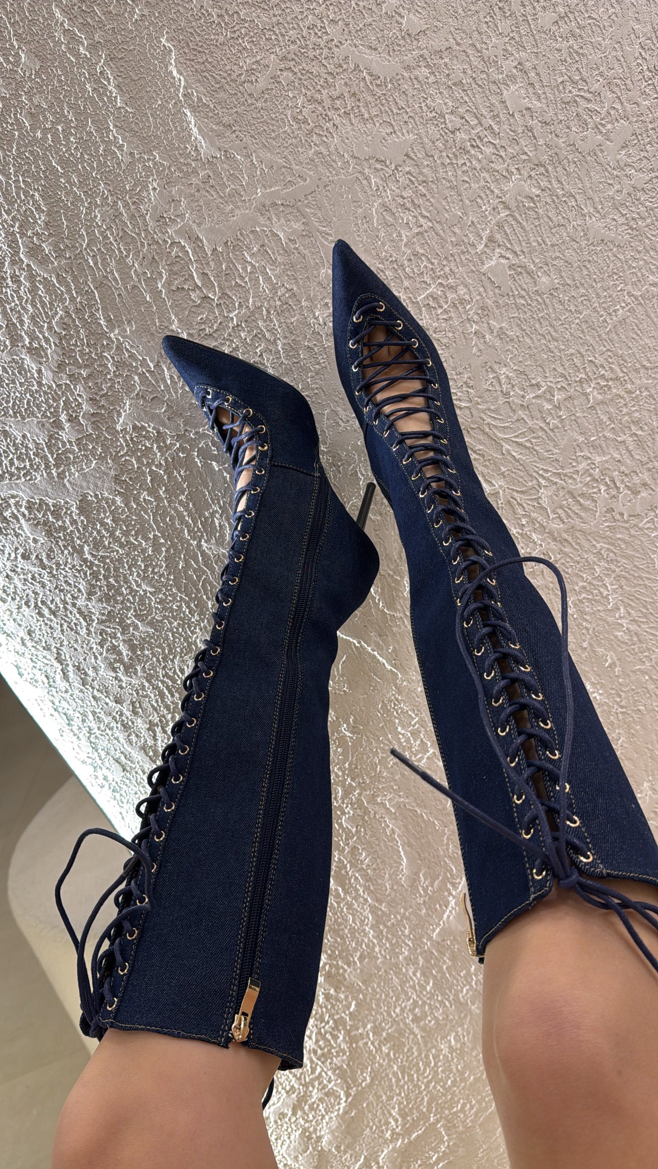 Stivale in denim con gambale tubolare e stringato. Cerniera laterale. Calzata facile e regolare. Modello a punta. Tacco 10cm.