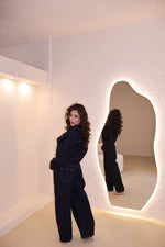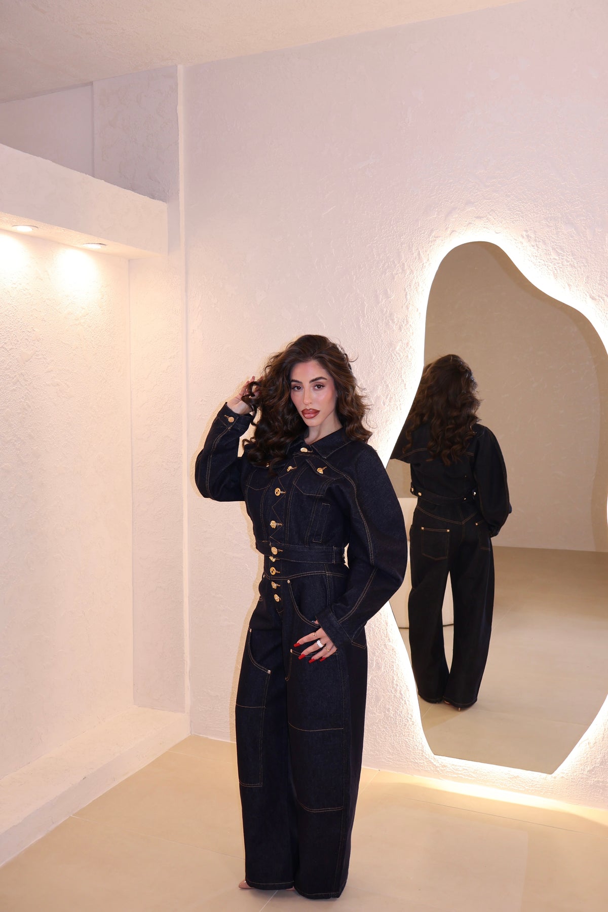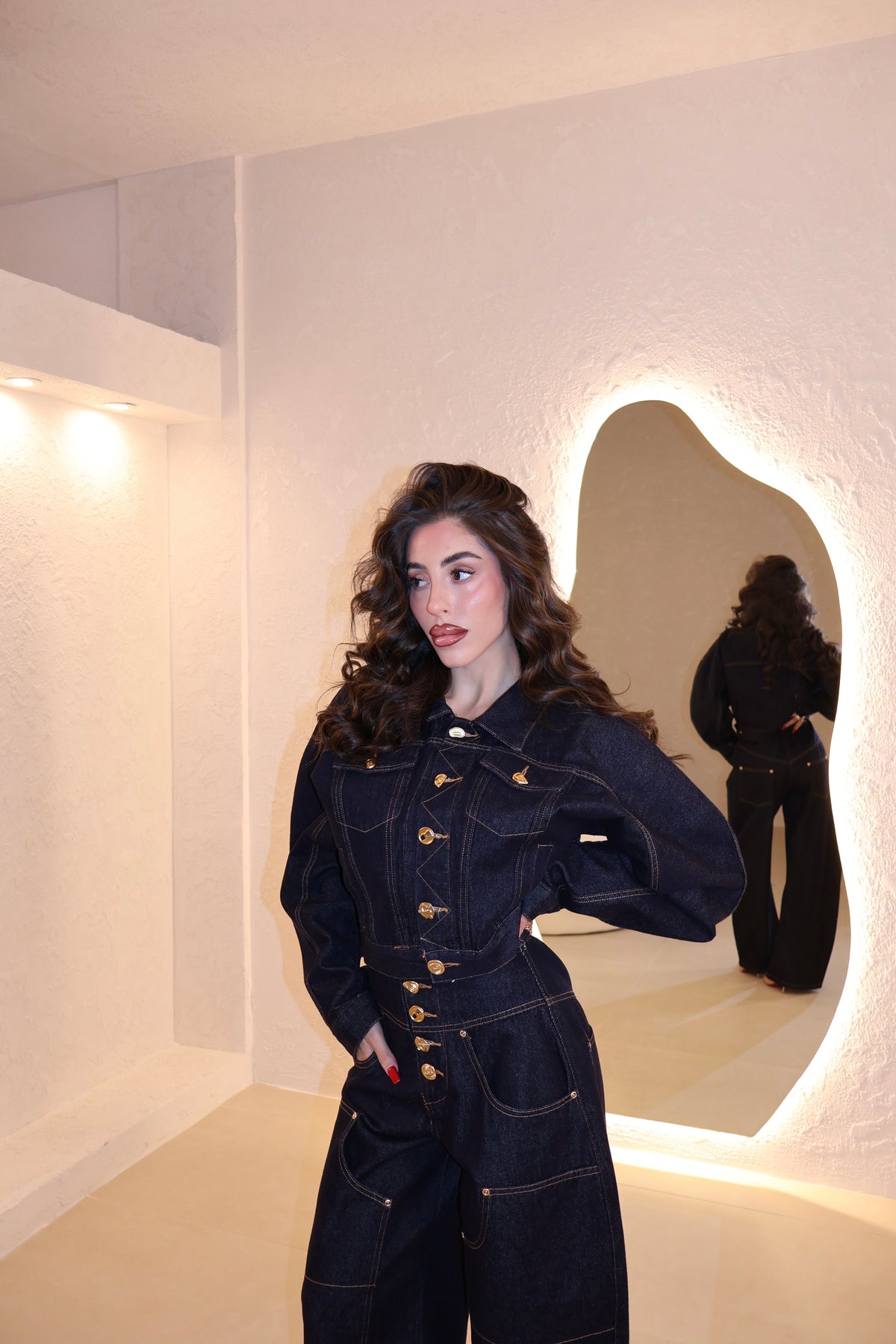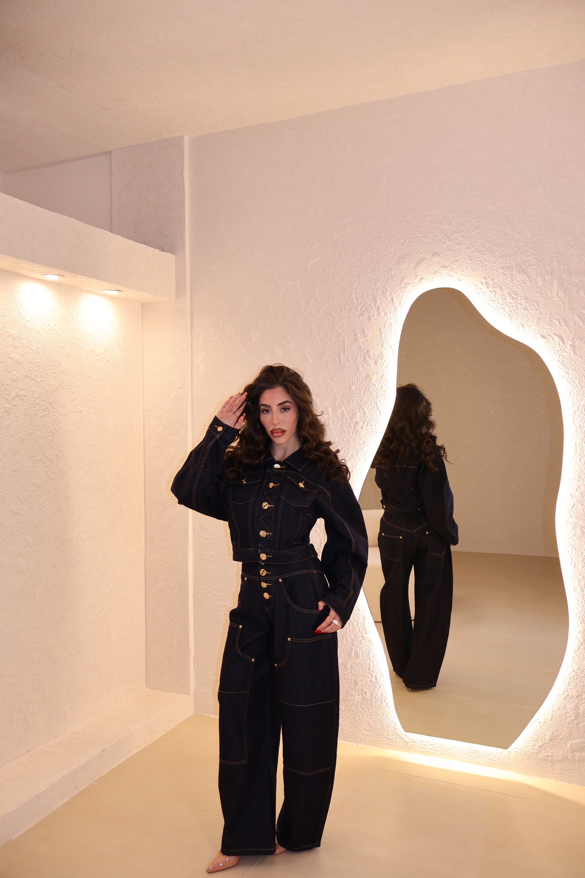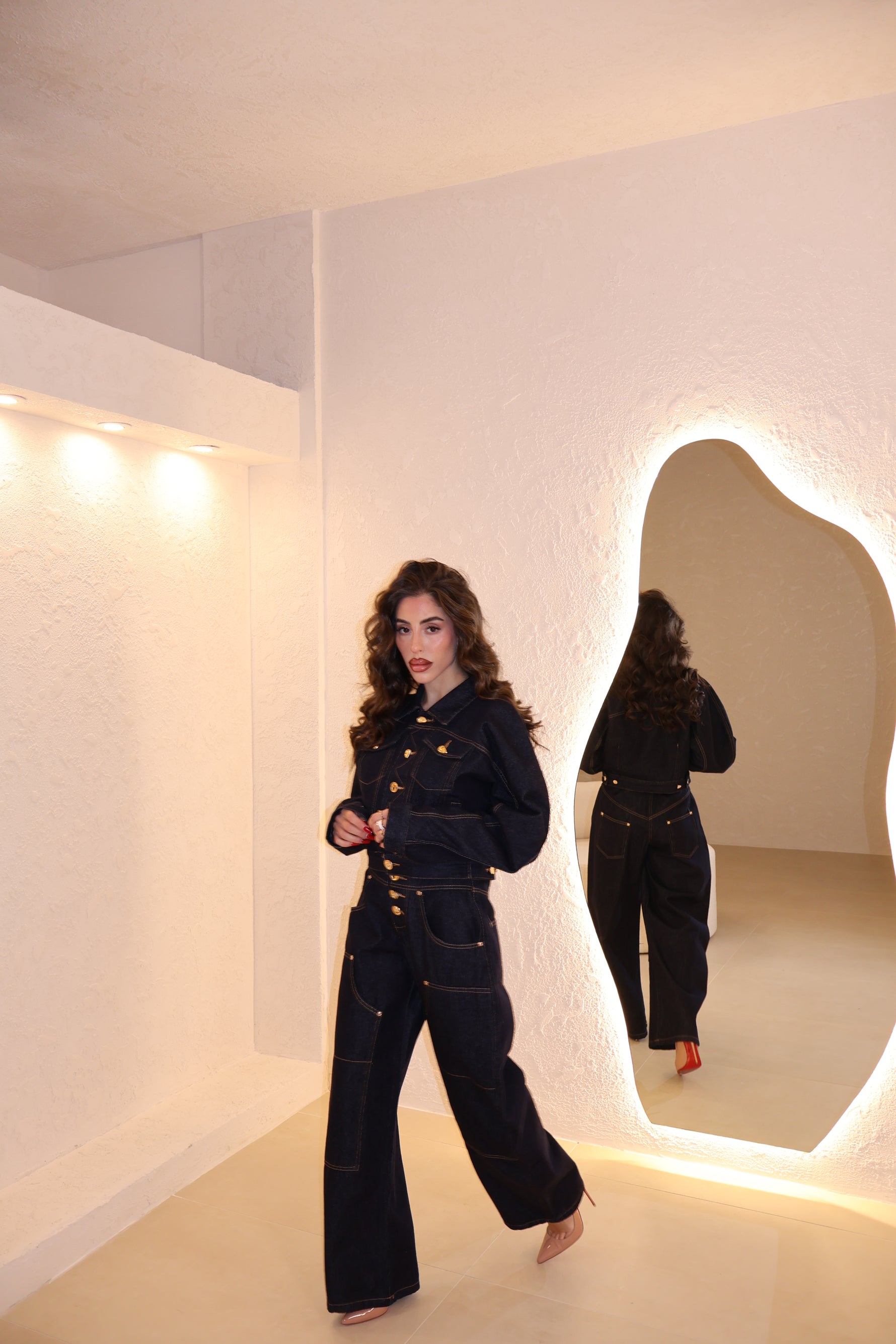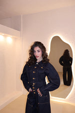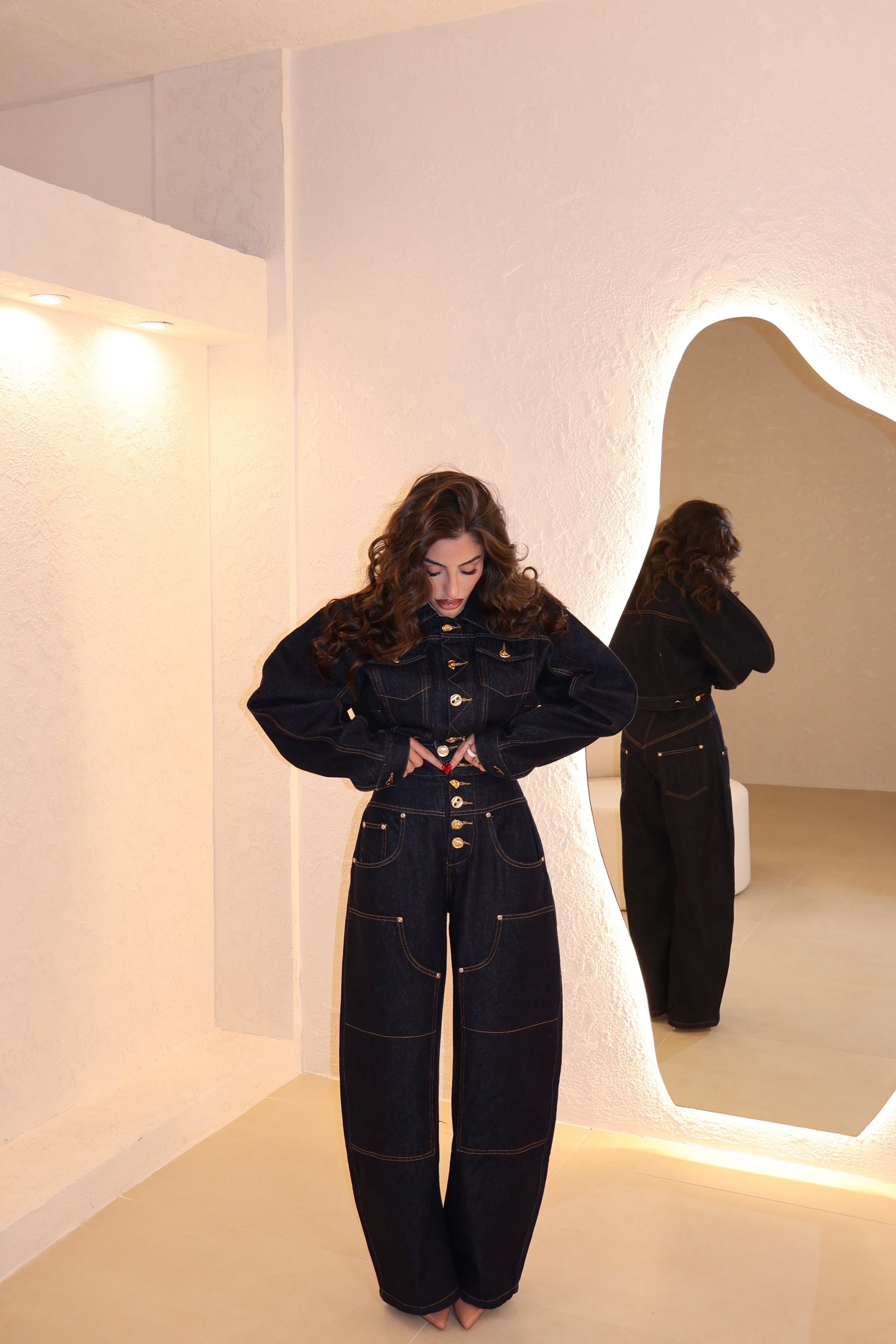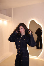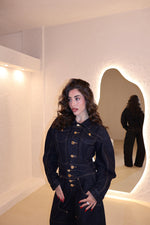 Coordinato in denim composto da jeans modello balloon e giacca corta con bottoni in oro. La modella indossa taglia S.