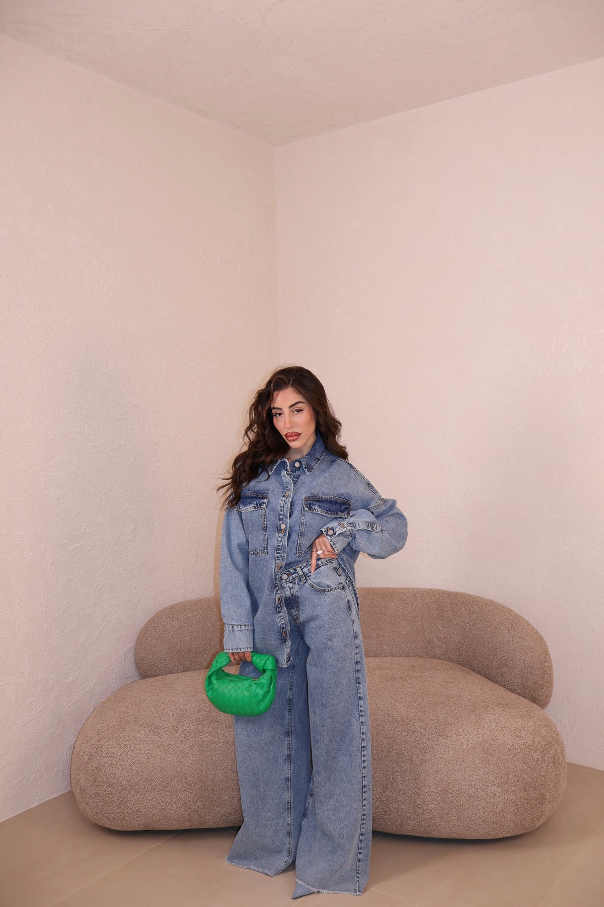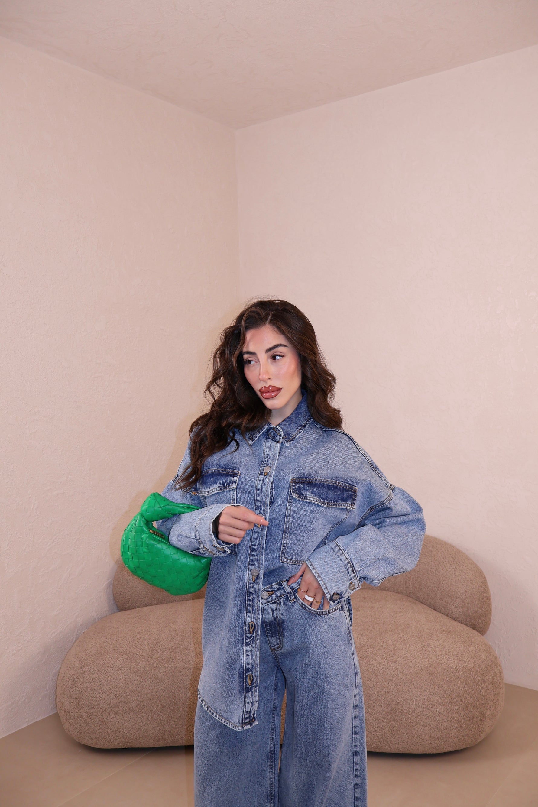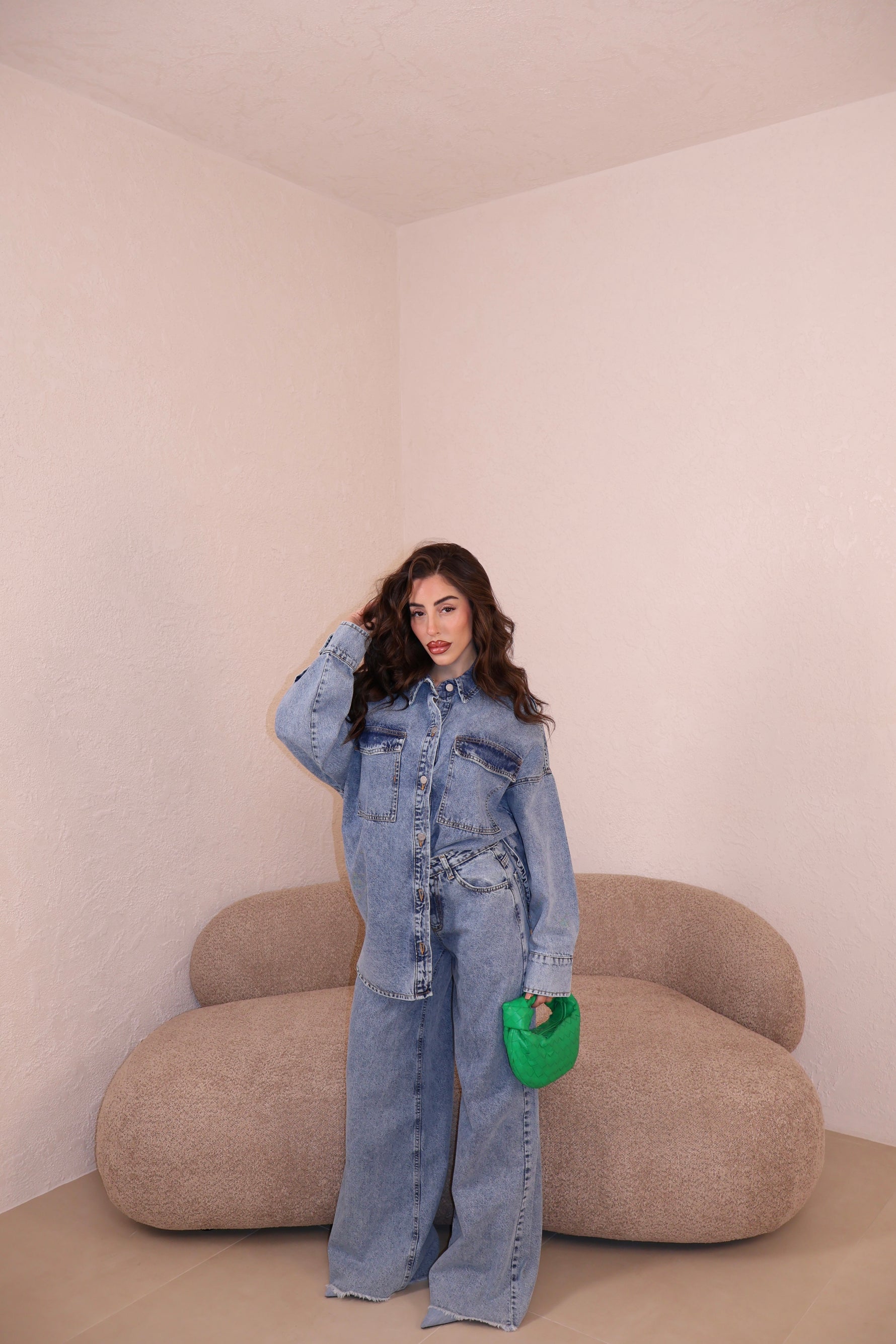 Coordinato composto da jeans vita alta e camicia over. Vestibilità regolare.