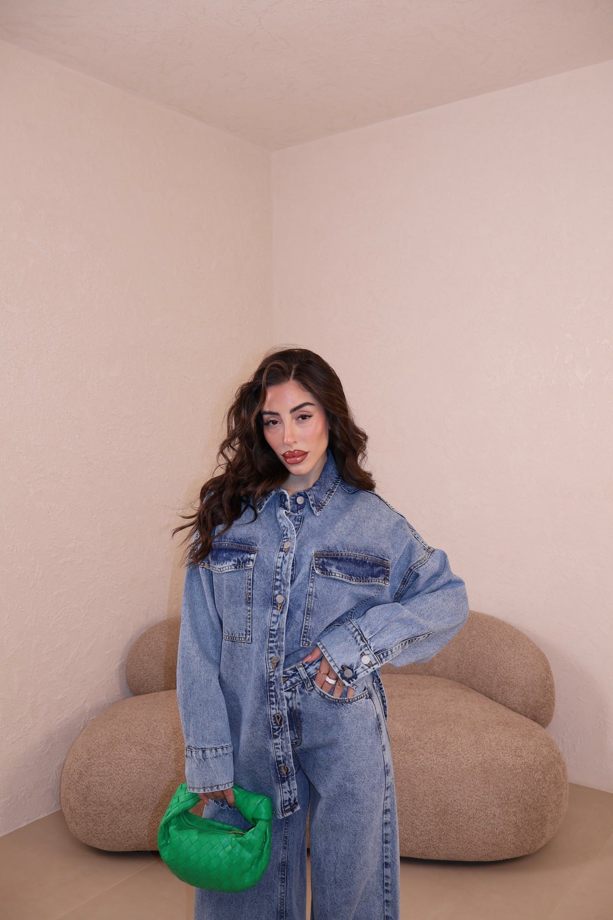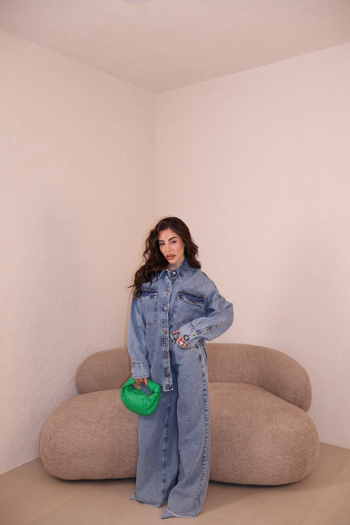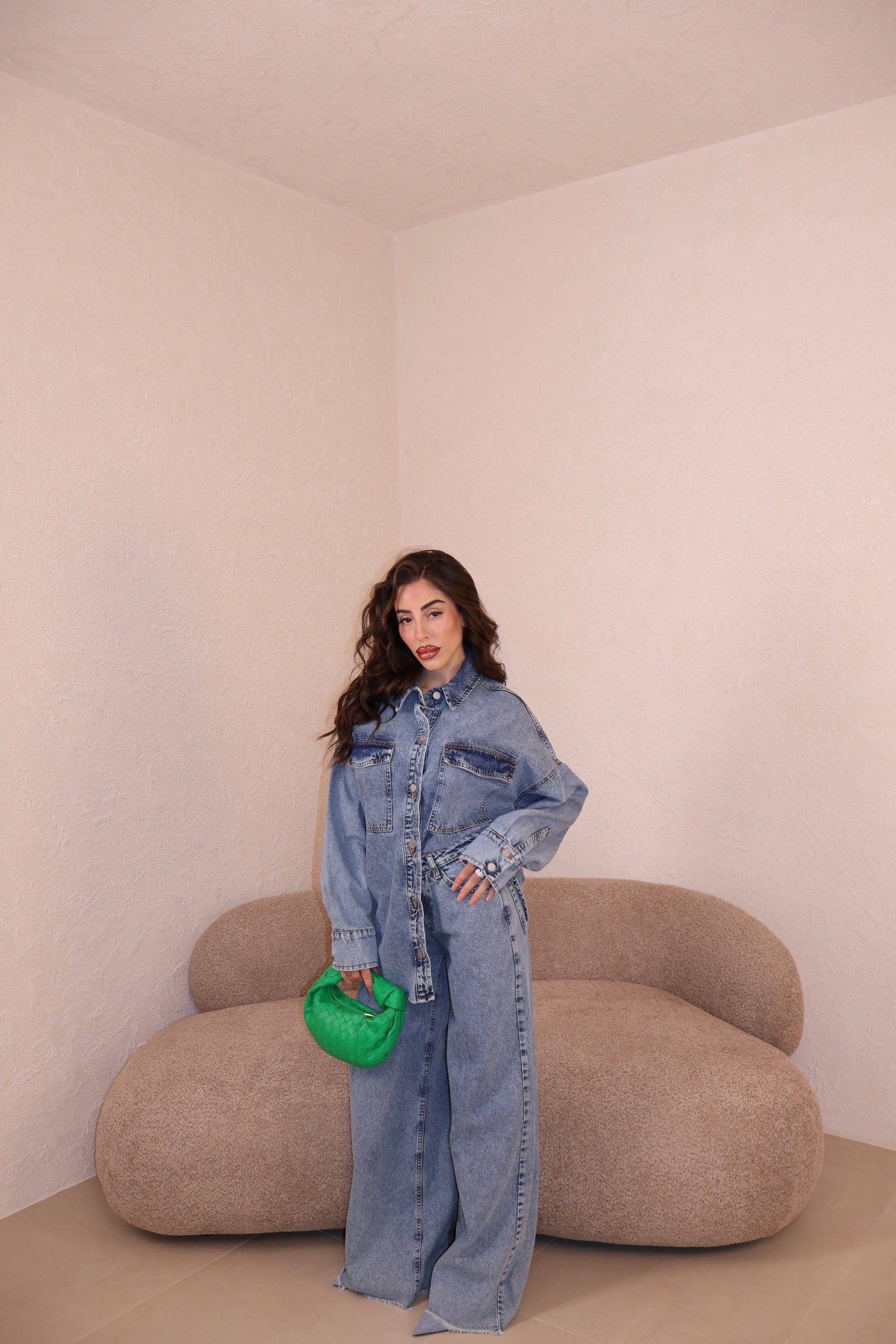 Coordinato composto da jeans vita alta e camicia over. Vestibilità regolare.