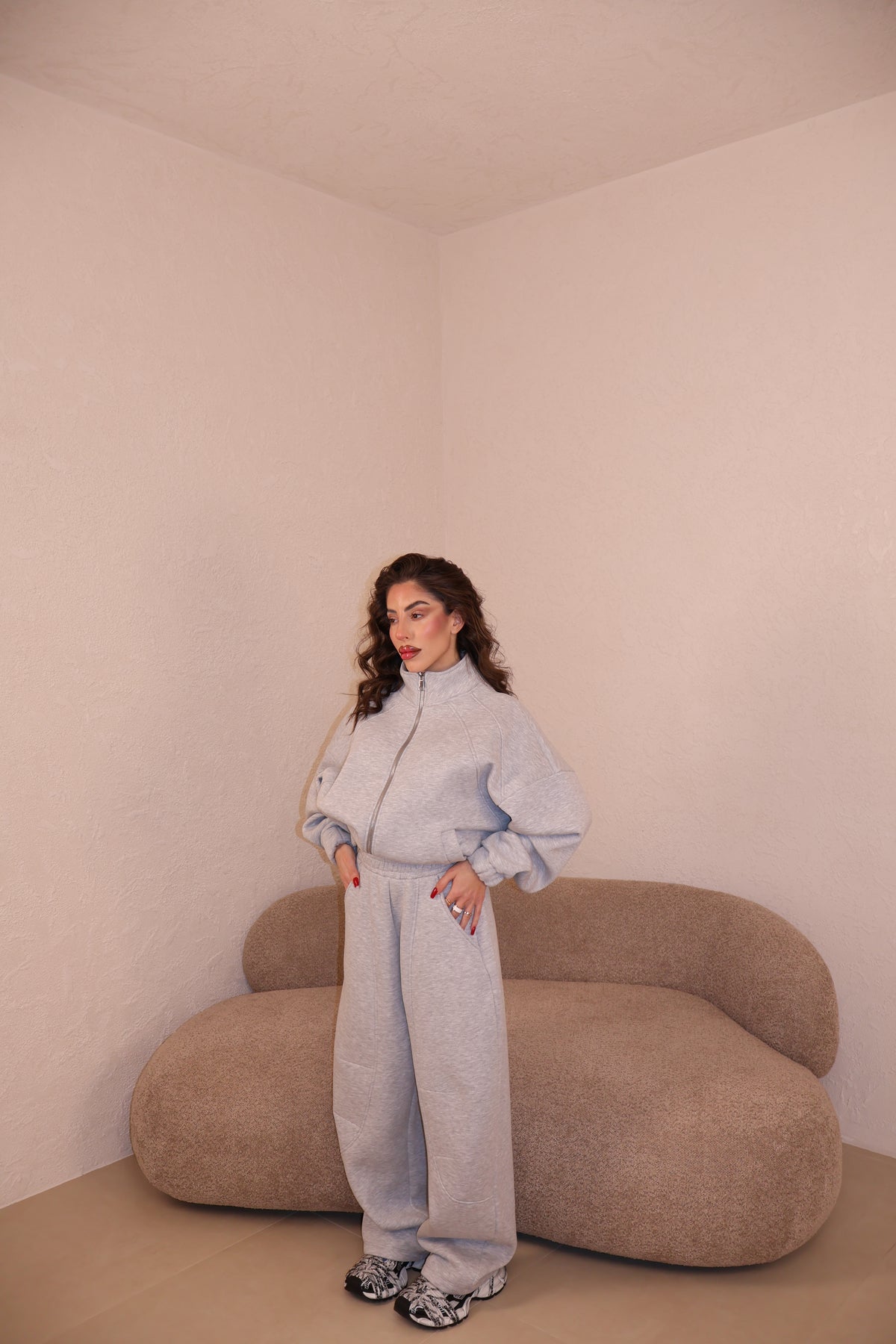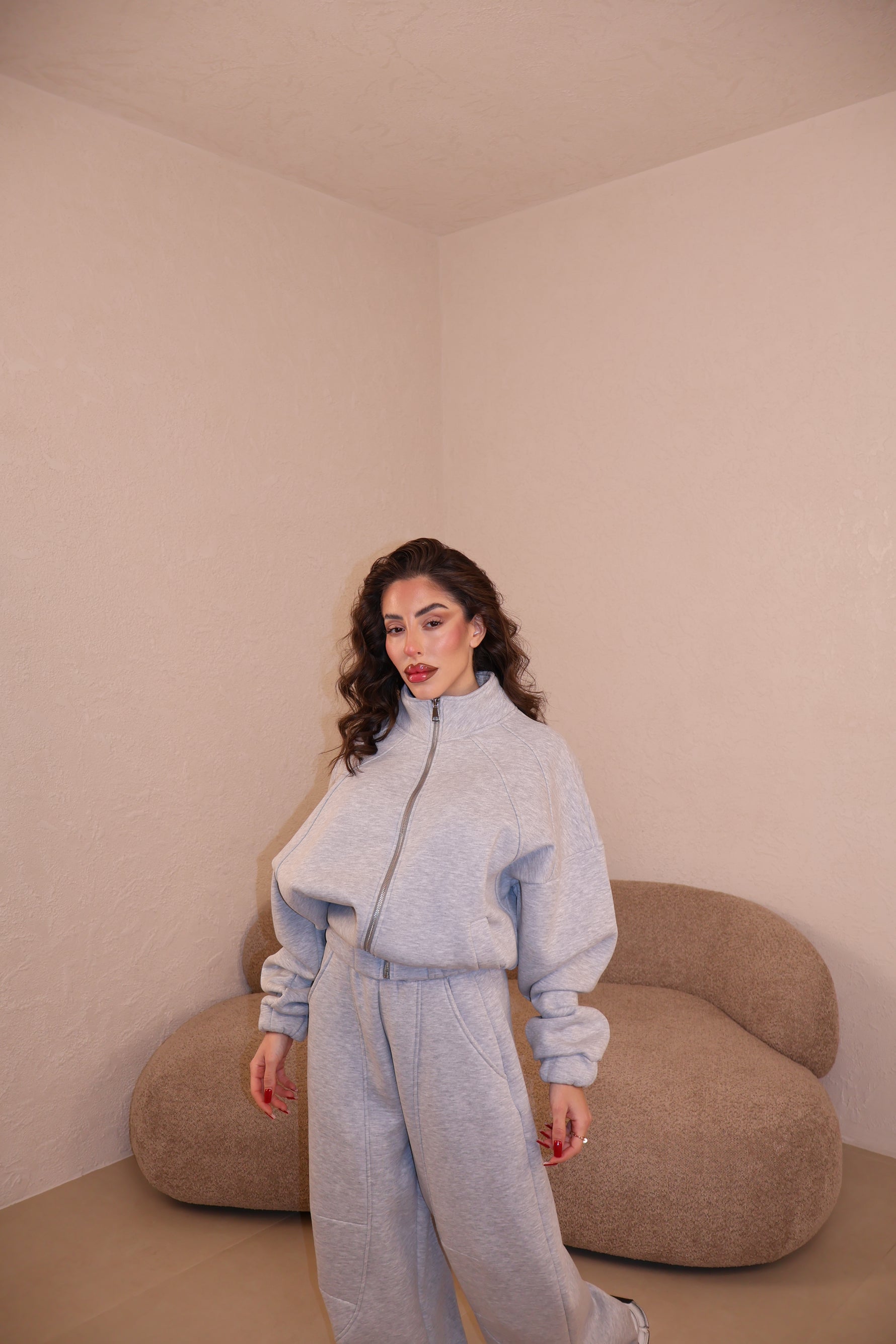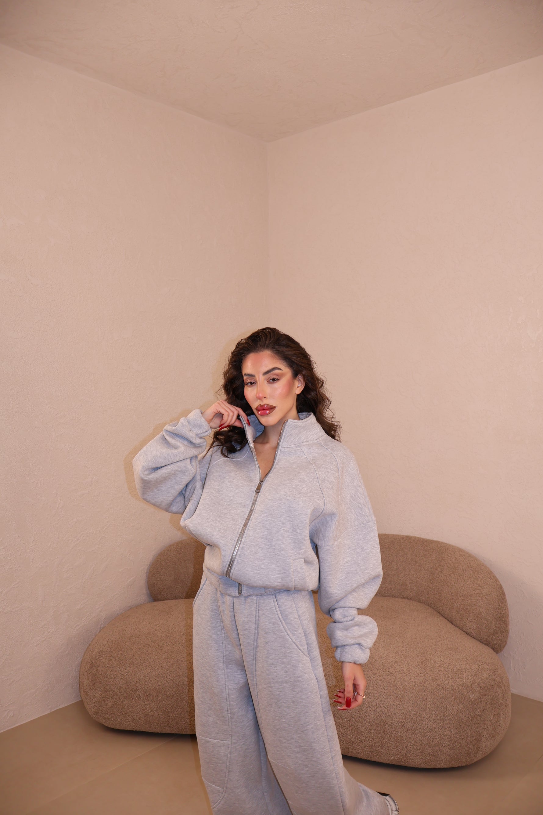 Coordinato di tuta felpato composto da pantaloni modello balloon con elastico in vita e felpa con cerniera. Taglia unica.