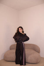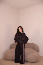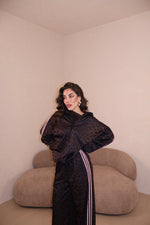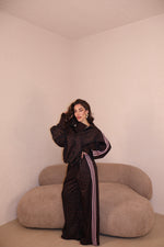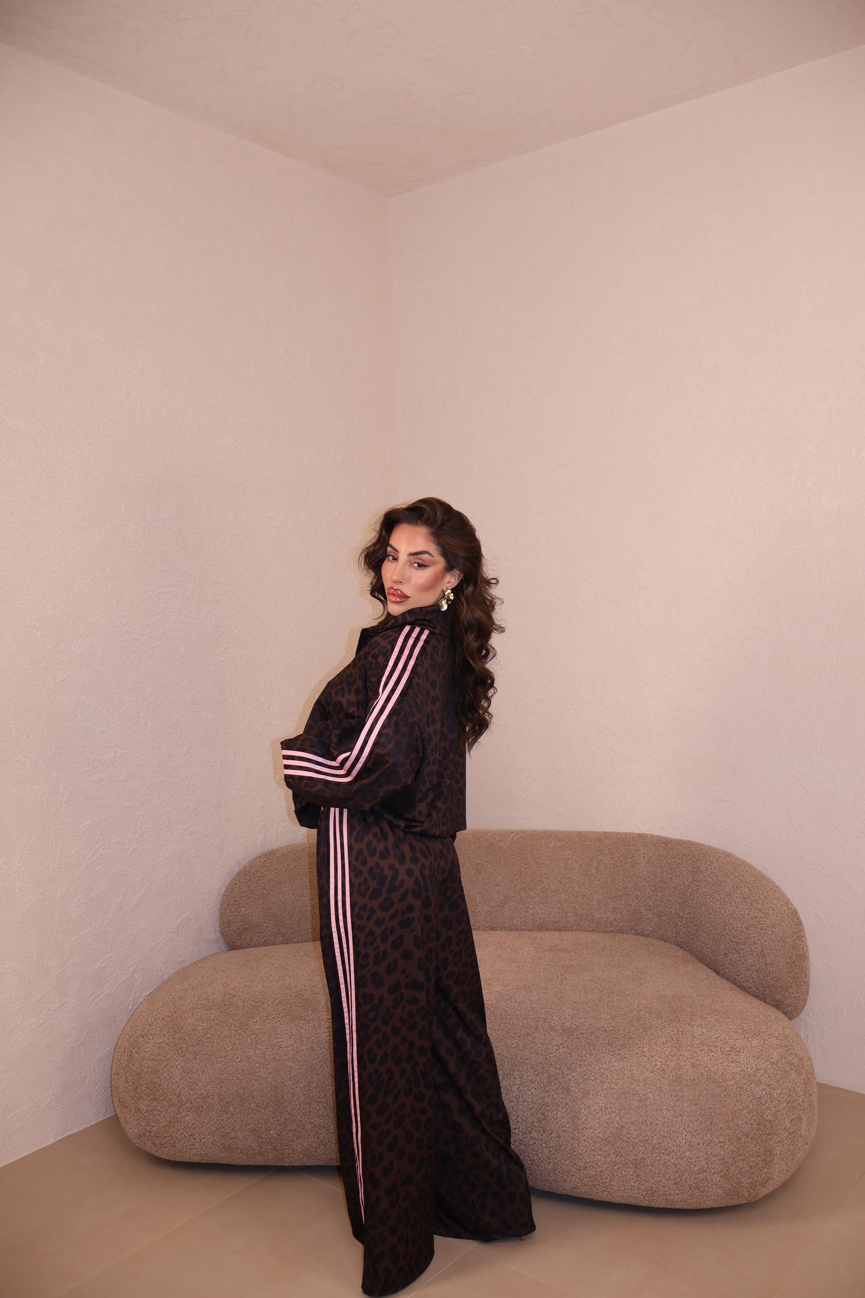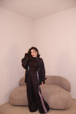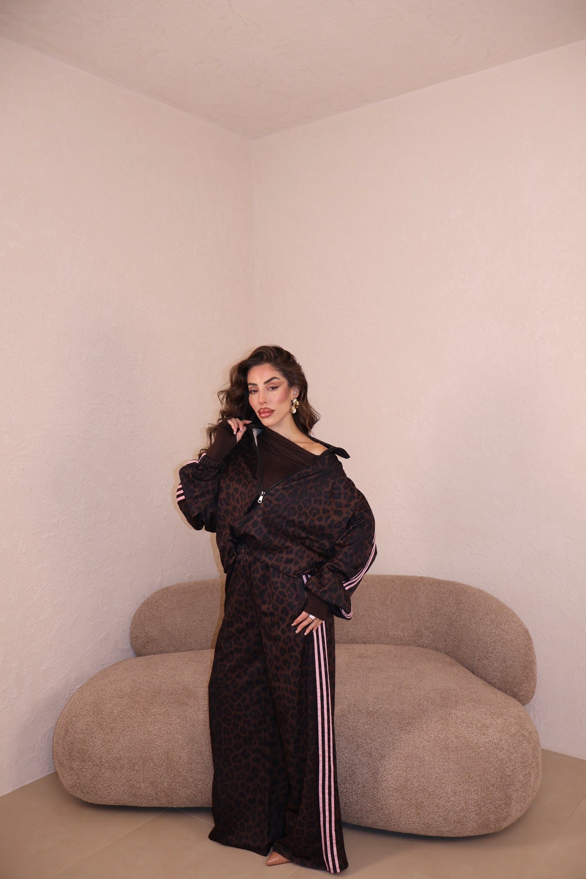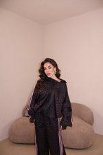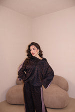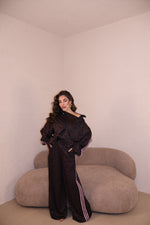 Coordinato di tuta nel tessuto acetato composto da pantaloni morbidi con elastico in vita e felpa over con cerniera. Bande a contrasto. Taglia unica.